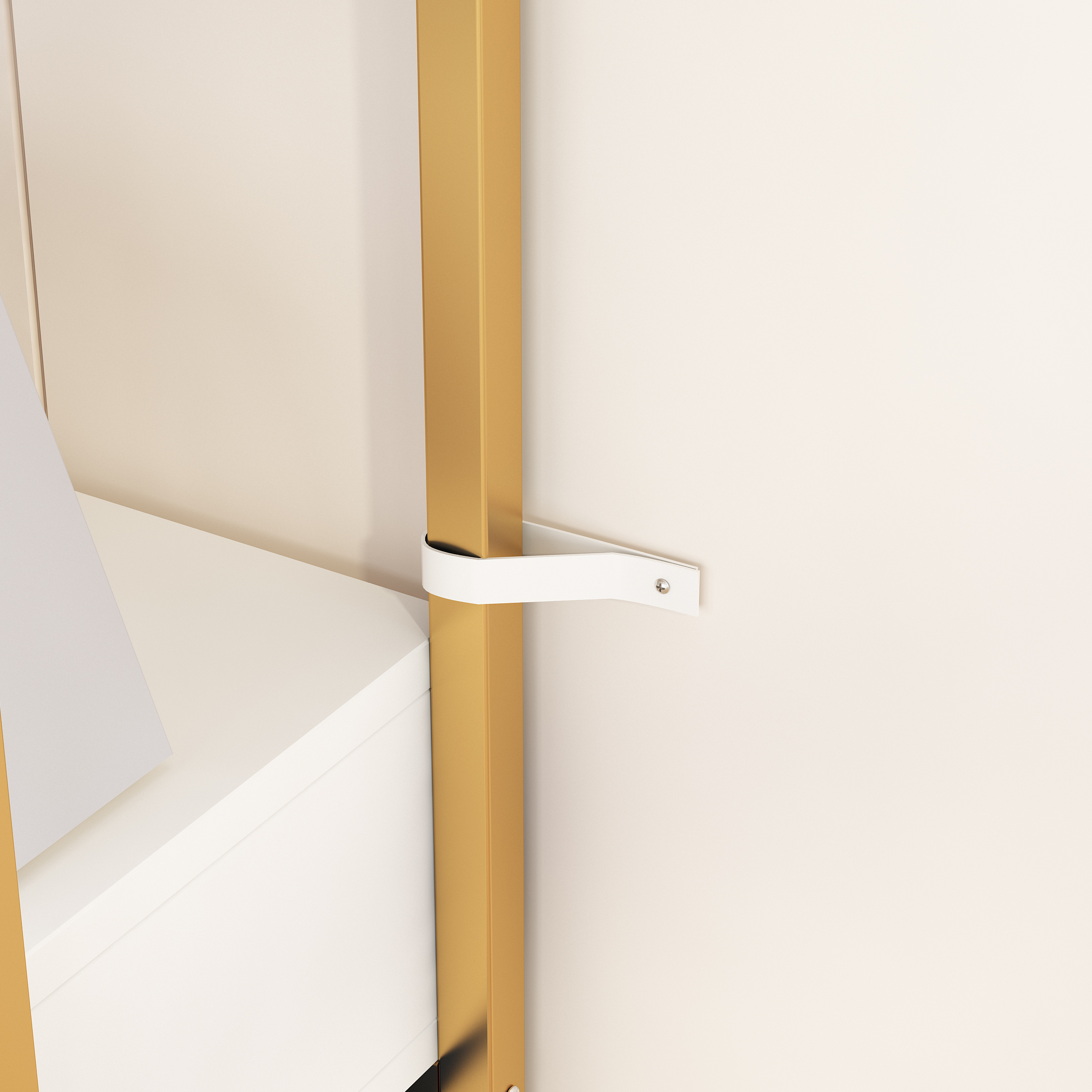 Features: Large decorative storage space: Featuring 4 storage fabric drawers, the large bookshelf helps classify & display your books, collections, framed photo, etc, keeping your home office tidy and organized. Smart Design: Designed with a golden frame and particle board, the display storage bookshelf brings a touch of deluxe and minimalist to your home Multi-purpose use: Not just suitable for storing your books, photo frame, ornaments, knickknack, etc, but also for functioning as a peerless room divider in living room or office to divide your living space. The gold & marble bookshelf is also a good choice to display plants in your patio, balcony, indoor garden, courtyards Well-selected material: Constructed of thick particle boards and sturdy metal frame, the unique bookcases stably hold heavy items without wobble. Improved stability & safety: Anti-tipping devices are included to secure the metal bookshelf to the wall to ensure personal and family safety. The adjustable feet pads at the bottom avoid scratching your floor. Specifications: 1. Material: Particle Board and Metal 2. Color: Gold/Brown 3. Overall Dimensions: (35.43″ X 11.8″ X57.87″) / (90X30X147)cm (LxWxH) 4. Weight: 57.3 lbs / 26 kg Packages: 1 x Bookshelf 1 x Assembling Instructions