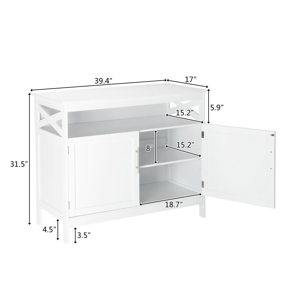Introductions: With broad tabletop and large storage compartments, an organized and neat home can be easily come true. Constructed of finished MDF board and heavy-duty legs, the cabinet is steady and reliable for long service time. And you can adjust the position of the middle tier to meet your different storage demands. As a combination of elegance and functionality, the unit is compatible with various decoration styles, and it can perfectly fit your living room, kitchen, bathroom, entrances, etc. Features: Vintage Metal Handle:Designed with 2 vintage metal handles, the cabinet door is easy to open with elegance. And the metal handle is steady and durable, lasting long service time. Magnet Base Door:Designed with magnet base to match the doors, the door can be automatically closed if you forgot to close it after taking something from cabinet. Adjustable Middle Shelf:There are multiple holes so that you can adjust the position of the middle shelf according to your storage needs and individual’s likes. Specifications: Material: P2 MDF board Color: White Weight: 51.8lb Dimensions: (39.4 x 17 x 31.5)” (L x W x H) Package Includes: 1 x Dining Buffet
