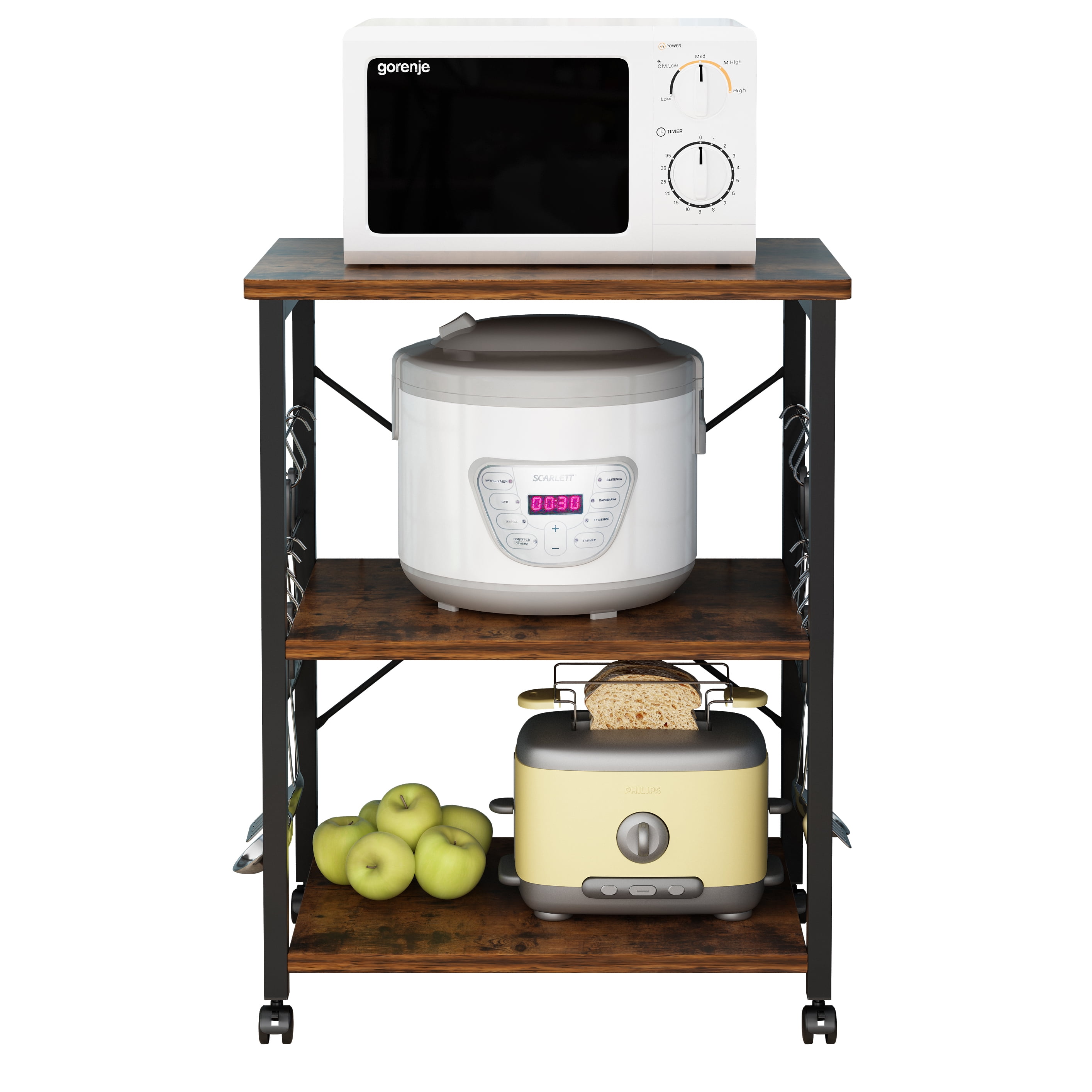 Features: Mobile kitchen cart with wheels Use 3-tier shelves and side metal hooks 15mm thick durable chipboard kitchen utility durable trolley Black metal frame storage cart Microwave oven rack X-shaped design provides more support Kitchen cart table comes with numbered parts and detailed instructions Space-saving organizer is easy to assemble Modern simple fashion Can be used as a kitchen storage rack, shelf, tableware storage rack, microwave rack or other kitchen utensils Specifications: 1. Color: Vintage / Black 2. Material: P2 MDF 3. Size: (23.62 x 15.75 x 28.94)” / (60 x 40 x 73.5)cm(L x W x H) 4. Weight: 22lbs Package Includes: 1 x Baker’s Rack