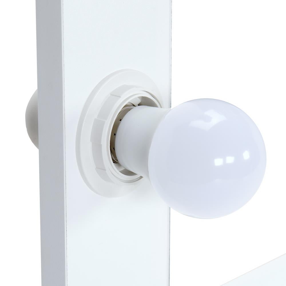 Extra-large Hollywood-style mirror with 9 bright light bulbs The lustrous gold frame matches perfectly with the elegant whiteboard Spacious Desktop can be used as a writing desk after removing the mirror 2 Sliding Drawers can stash makeup accessories and must-haves Features: P2 density plate metal frame structure dressing table Hollywood Makeup Mirror Two big drawers Take down the mirror and use it as a table Soft lighting Specifications: Material: MDF & Solid Wood Color: White Overall Dimensions: (39.37 x 17.72 x 29.53-57.09)” / (100 x 45 x 75-145) cm (L x W x H) Mirror Size: (26.38 x 29.53 “/ (67 x 75) cm Drawer Size: (16.54 x 13.19 x 2.64)” / (42 x 33.5 x 6.7) cm Weight: 63.82 / 28.95 kg Package Includes: 1 x Makeup Table (Stool Not Included) 1 x Mirror 1 x Installation Instruction 1 x Accessories