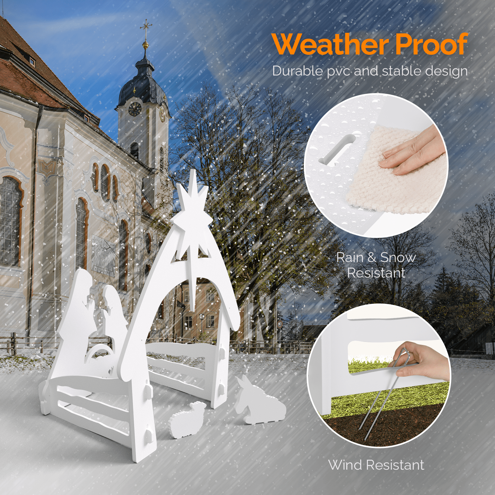 UBesGoo Weatherproof Lawn Nativity Scene Yard Display Outdoor Nativity Sets for Christmas Crafted from high-quality PVC material, this nativity scene is built to withstand the elements. It is UV-resistant, ensuring that it won’t fade or discolor under the sun’s rays. The durable construction also makes it suitable for long-term outdoor use, keeping your nativity scene looking beautiful year after year. Setting up this nativity scene is a breeze. The set includes all necessary pieces and accessories, making assembly quick and hassle-free. With its lightweight design and easy-to-follow instructions, you’ll have your nativity scene up in no time. When the holiday season is over, the set is also easy to take down and store for future use. These intricately designed figures bring the story of Christmas to life and create a visually stunning display that will delight both young and old. Place it in your yard, garden, or any outdoor space to spread the joy and wonder of the holiday season. Complete your outdoor Christmas decorations with our range of coordinating PVC decorations. From Santa Claus and reindeer to angels and festive ornaments, we offer a variety of options to enhance your holiday display. Mix and match these charming decorations to create a magical winter wonderland in your own backyard. With its attention to detail and elegant design, this large outdoor nativity scene is the perfect addition to your Christmas decorations. It will impress your friends and neighbors while reminding everyone of the true meaning of the season. Create a focal point in your outdoor space and bring the magic of Christmas to life with this exquisite nativity scene.
