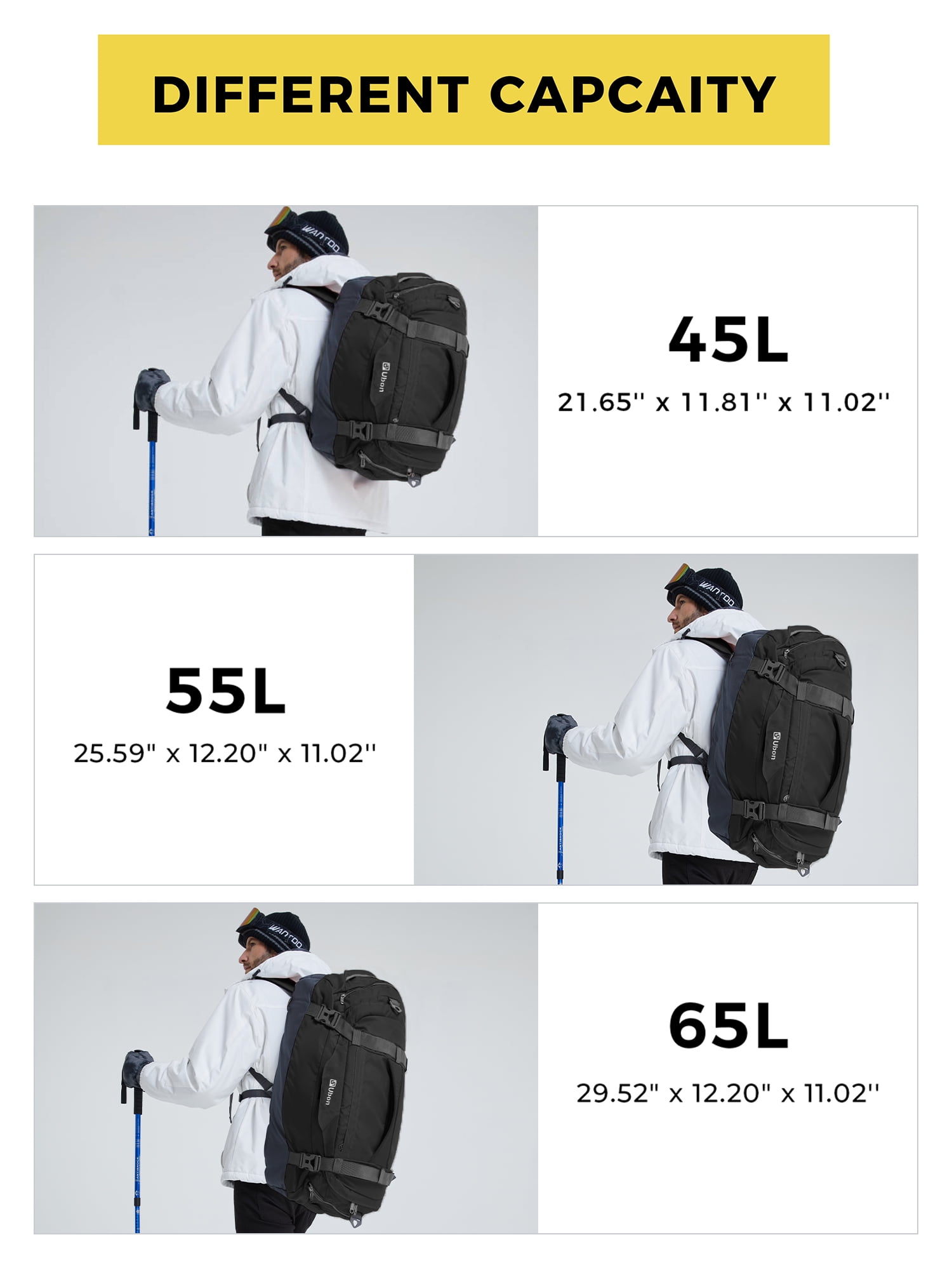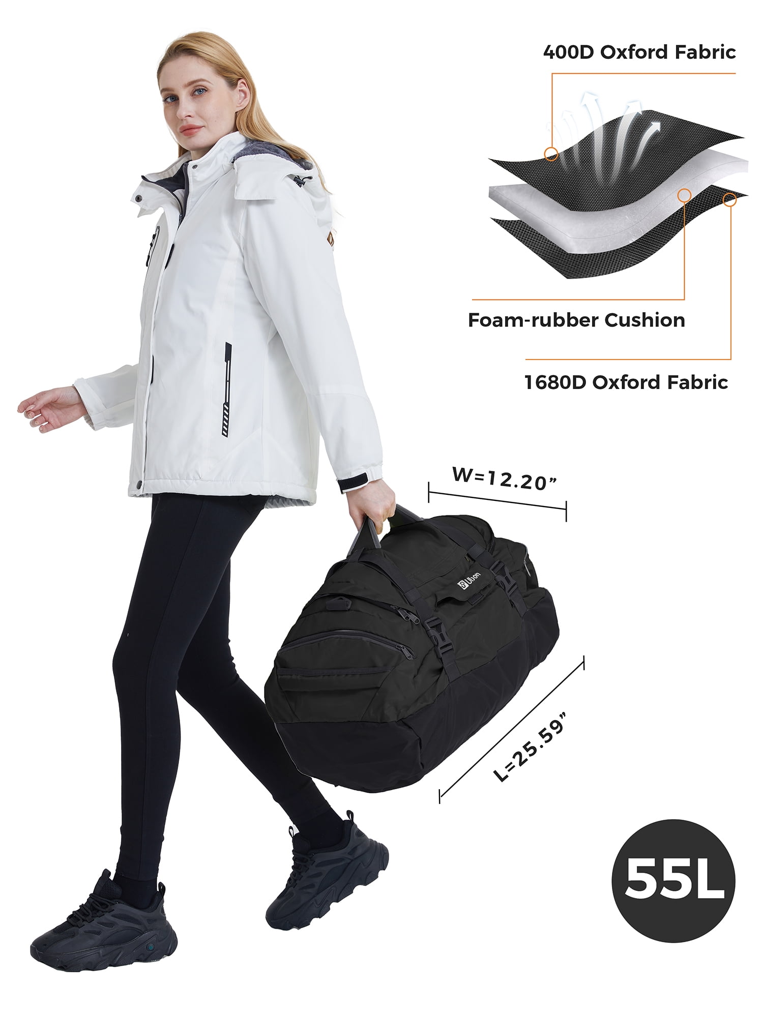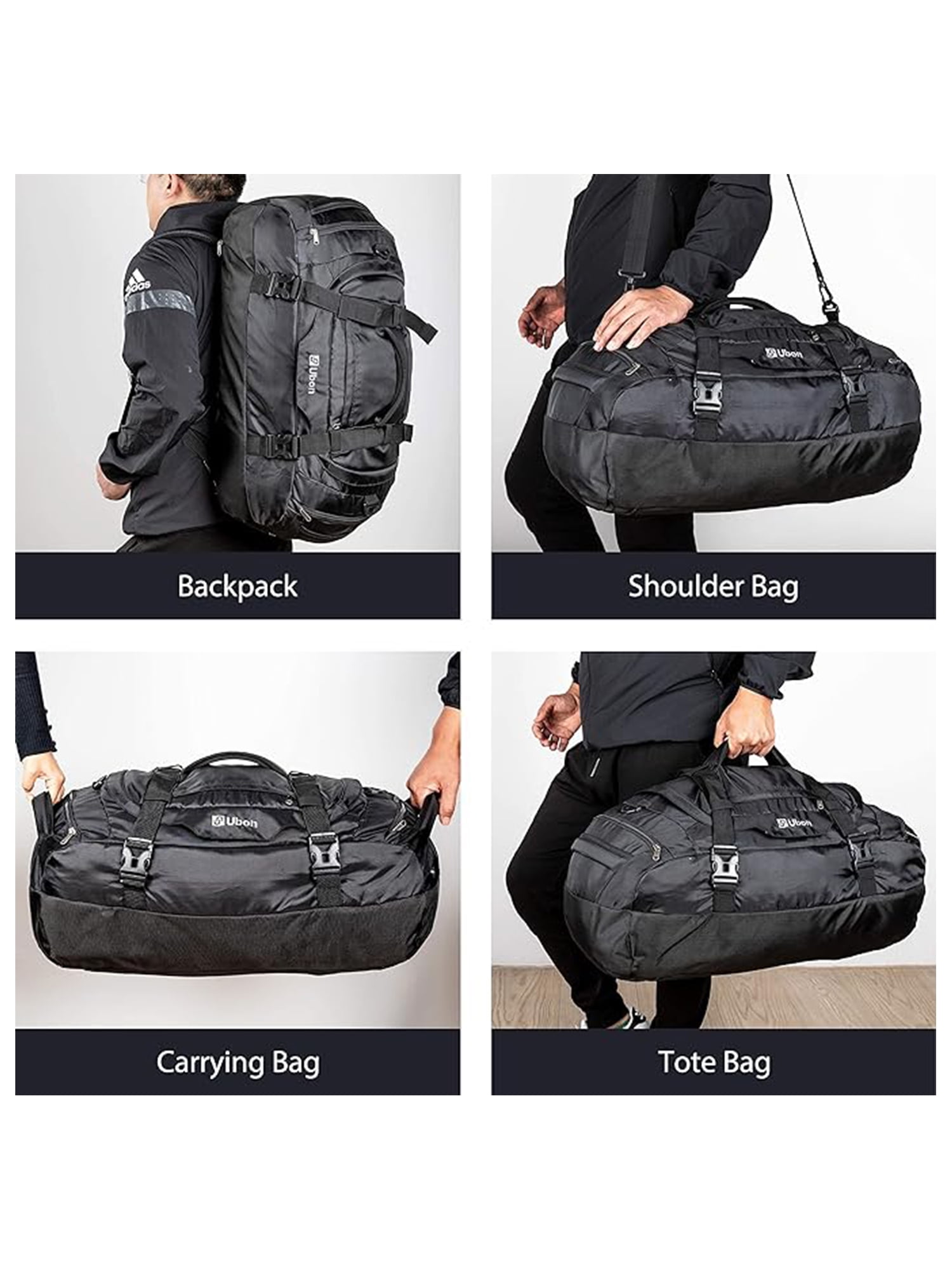 Ubon 45L/55L/65L duffle bag is a reliable choice for travel, sports, and everyday use. The travel duffel bag for is a versatile travel companion, doubling as a duffle bag backpack with padded straps for added convenience. This waterproof duffel backpack boasts durable construction with reinforced stress points and premium two-way zippers, ensuring longevity. Featuring multiple compartments, including shoe storage with air vents, this weekend duffle bag for travel offers practical organization. Comfort is key with sponge-padded handles and adjustable straps. The 65L large duffle bag doubles as a versatile travel, business, gym, overnight, weekend, airplane carry-on, shopping, or emergency bag, making the duffel bag a reliable companion for your daily needs.