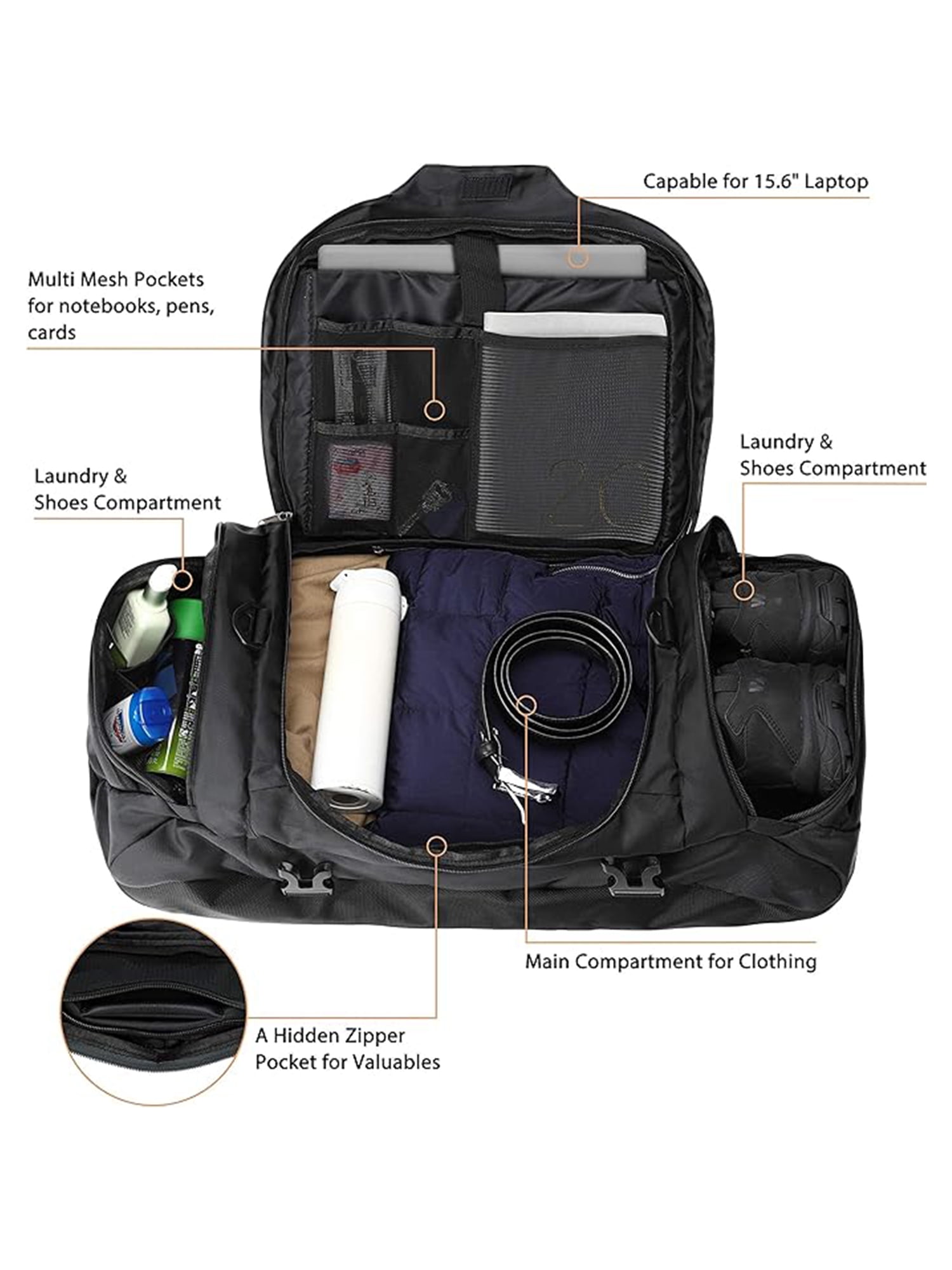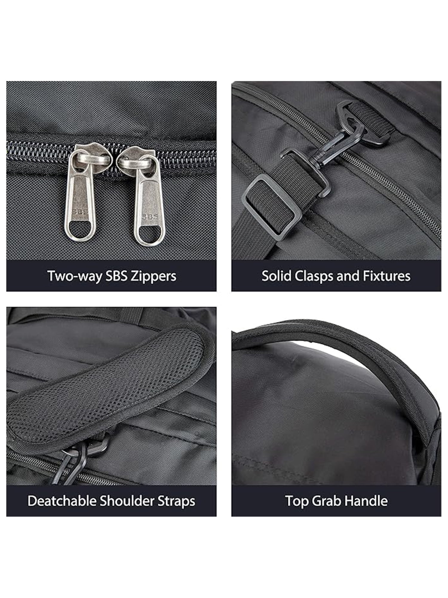 Product Features Color: Black; Gray; Orange; Dark Teal Size: 45L(21.65 x11.81 x11.02 inch)/55L(25.59x 12.20x 11.02 inch)/65L(29.52×12.20×11.02 inch) Shell: Oxford Fabric Pockets: 12 pockets Durable Construction: Crafted from durable and lightweight nylon material coated with PU, this duffle bag for travel is designed for long-lasting performance. Enhanced with high-quality metal SBS zippers and strengthened stress points, this weekender duffel bag women guarantees resilience. Enjoy comfort and ventilation with the sponge-padded handle and shoulder straps, no matter your carrying style. Practical Designs: This sport gym bag with shoe compartment includes two side compartments with ventilated air vents, perfect for storing dirty laundry or shoes, keeping your belongings organized and clean. The large duffle bag also offers a top zippered pocket for quick access to small items. With two side compression straps, the camping travel duffel bag stays stable during travel, minimizing shaking and bouncing. The durable hook and sturdy buckles on the shoulder straps further enhance the gym bag’s durability and functionality. Versatile Carrying Options: The specially designed hidden back straps offer an additional way to use the bag, quickly transforming the travel duffel bag into a duffle backpack. With a removable and adjustable strap, the duffle bag men offers versatile carrying options with a top grab padded handle and side grab handles, allowing you to carry it solo or with a companion. This duffel bag backpack can be used as a duffle backpack, shoulder bag, carrying bag, or tote bag, providing flexibility in how you carry it.