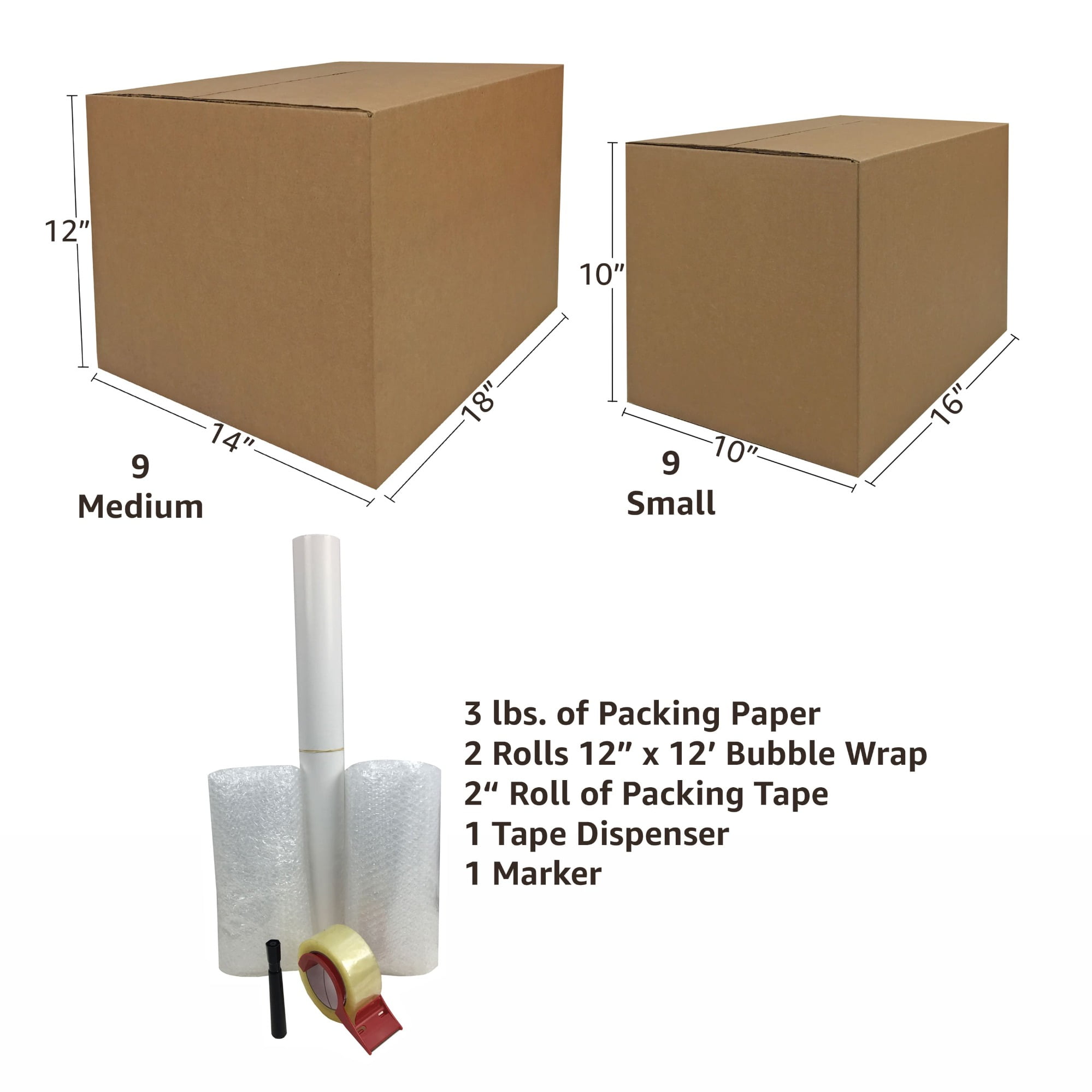 uBoxes Basic Moving Kit #1 Content: 18 Boxes, Supplies, and 24 Cu. ft. of space 9 Small Moving Boxes>16 X 10 X 10″, 9 Medium Moving Boxes 18 X 14 X 12″, 110 yards of packing tape 1 Clamshell Tape Dispenser, 24′ of Bubble Roll, 3 lbs of Wrapping Paper, 1 Marker Perfect for packing up 1-3 rooms Purchase labeling tape or moving labels to easily identify the contents inside each box without having to open it