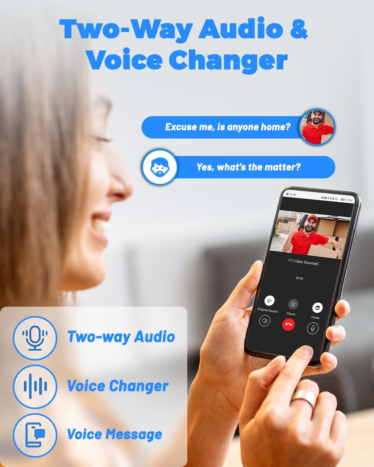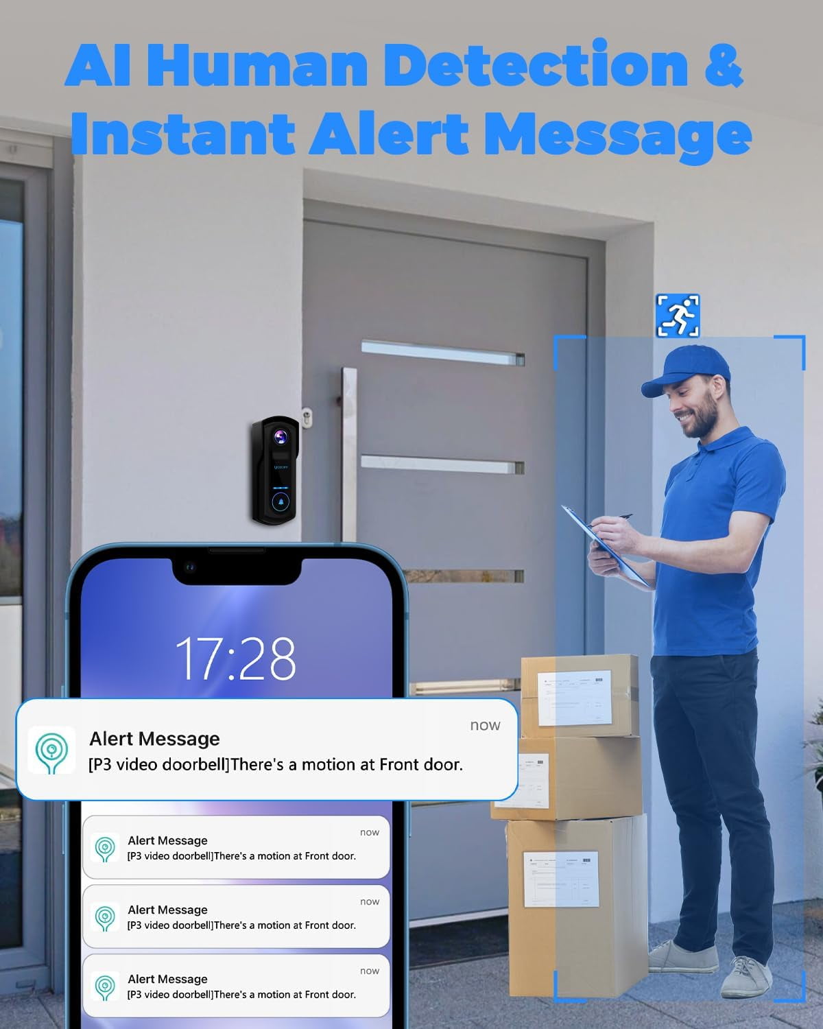 Compatible with Alexa and Google Assistant The smart video doorbell wireless is compatible with both Alexa and Google Assistant to control it with voice. The door bells wireless cordless enables you to activate the live view, effortlessly monitor the situation outside your door, and interact with your visitors without the need for physical contact. 2K HD Resolution & Super Night Vision Experience crystal-clear images with a 2K HD resolution, a 170 wide-angle view, and 15m night vision range on this doorbell camera ensures that you can monitor and record precise details, even in complete darkness. AI Motion Detection & Anti-Theft Alarm & Custom Settings The wireless smart doorbell camera is equipped with state-of-the-art AI sensor that intelligently identify human/vehicle. The doorbell wireless offers customizable detection zones, schedules, sensitivity, and sirens to ensure you receive 99% accurate instant alerts and notifications. Furthermore, when someone attempts to tamper with or steal the camera, the anti-theft alarm will emit a loud sound to deter potential thieves. Two-Way Audio & Voice Changer The wireless doorbell camera provides real-time, crystal-clear two-way audio, allowing you to communicate with people outside the door without opening it, or choose from pre-recorded voice messages to confirm the visitor’s intent to help you respond quickly. Wireless Chime & IP67 Waterproof The smart doorbell is a fully wireless connectivity design that boasts excellent convenience and practicality. It eliminates the need for any wiring, ensuring a hassle-free installation process that can be completed in under 5 minutes. IP67 waterproof rating ensures outstanding durability in all weather conditions. The door camera is compatible with 2.4GHz WiFi, not support 5GHz WiFi.