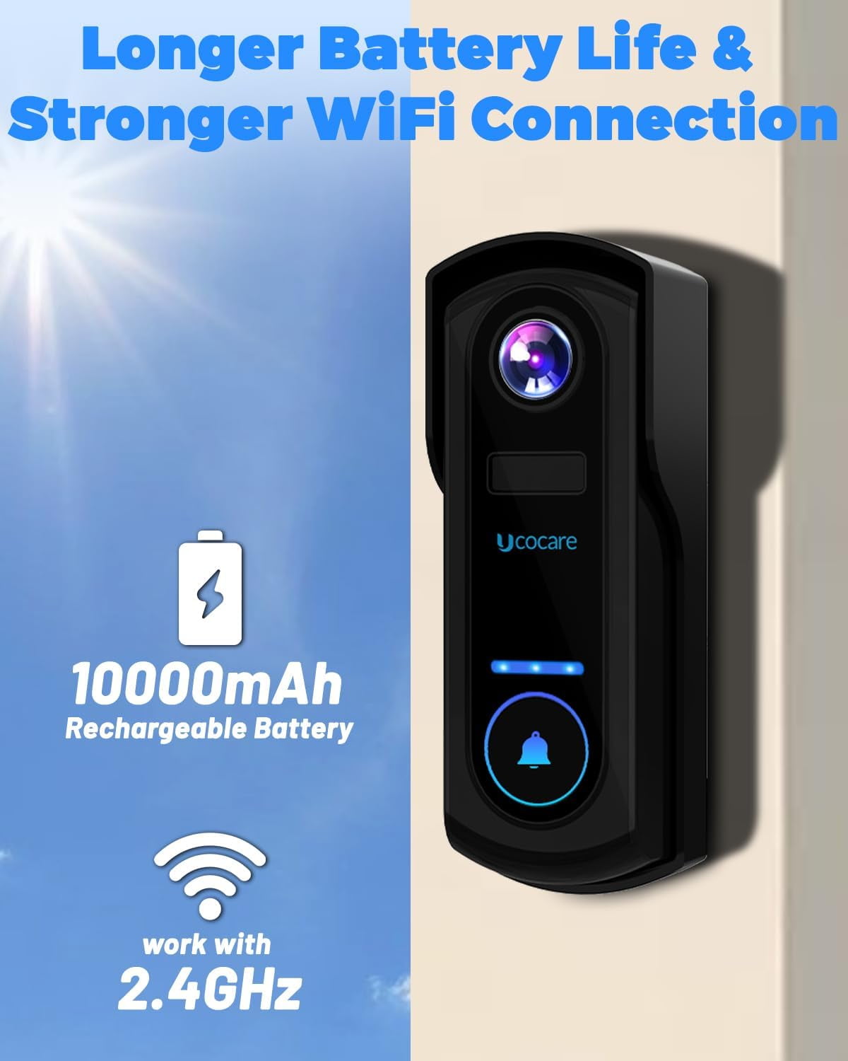 UCOCARE Video Doorbell Wireless with Chime, 2K FHD WiFi Doorbell Camera, PIR Motion Detection, Voice Message, Night Vision, 2-Way Audio, IP67, Support Local Storage & Cloud Storage