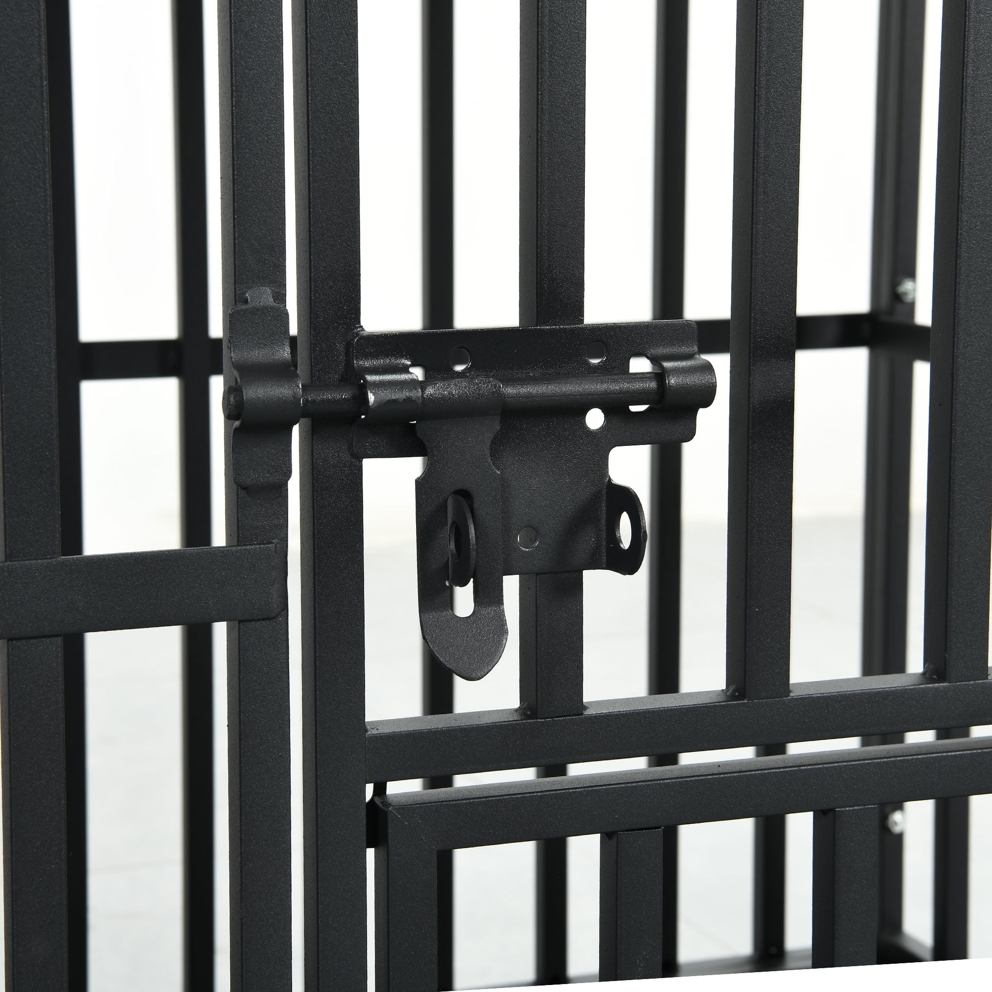 Robust and Durable Metal Framework: Our dog cage is fashioned from 0.6-inch diameter corrosion-proof steel tubes, making it significantly more robust than conventional wire cages. This dog crate can withstand even the most forceful and aggressive breeds. An added layer of non-toxic, multi-coating protection safeguards your pet’s health, even if it chews or licks the cage. Triple Access Design: The cage features a front door, top door, and dedicated food door for versatile use. The primary door allows easy in-and-out, the top opening enables interaction and feeding, and the specialized food door makes routine feeding uncomplicated without the need to open the large door. Enhanced Security with Dual Door Locks: The crate features two upgraded latch locks on the main and top doors, firmly securing the cage to prevent any escape attempts when you’re away. Considering anxious dogs, our tamper-proof crate ensures they are safely contained, preventing accidents or potential damage. Effortless Portability: Equipped with four 360-degree rotating casters, our tri-door dog cage can be conveniently relocated around your home as per your needs. For added stability, two of these casters can be locked into place, ensuring the crate stays put when required. Simplicity in Maintenance: The crate includes a removable bottom tray to easily catch any fallen food and waste. Cleaning is a breeze: just remove the waste, then wipe down the tray with a damp cloth.