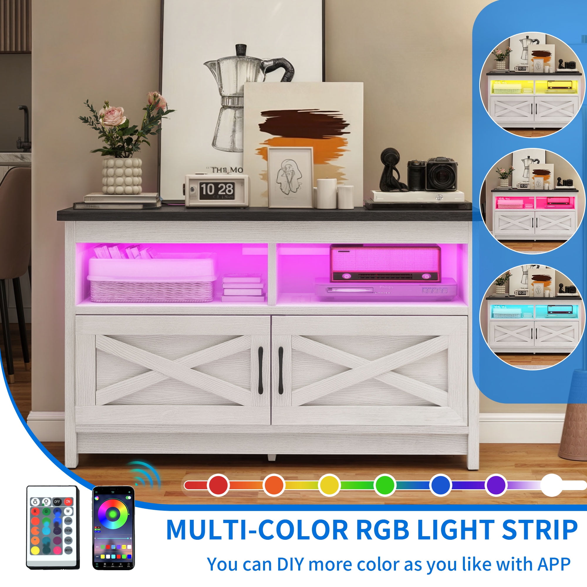 Uforic Small LED TV Stand for 40″ TV w/Power Outlets, Farmhouse Entertainment Center Cabinet, White and Black