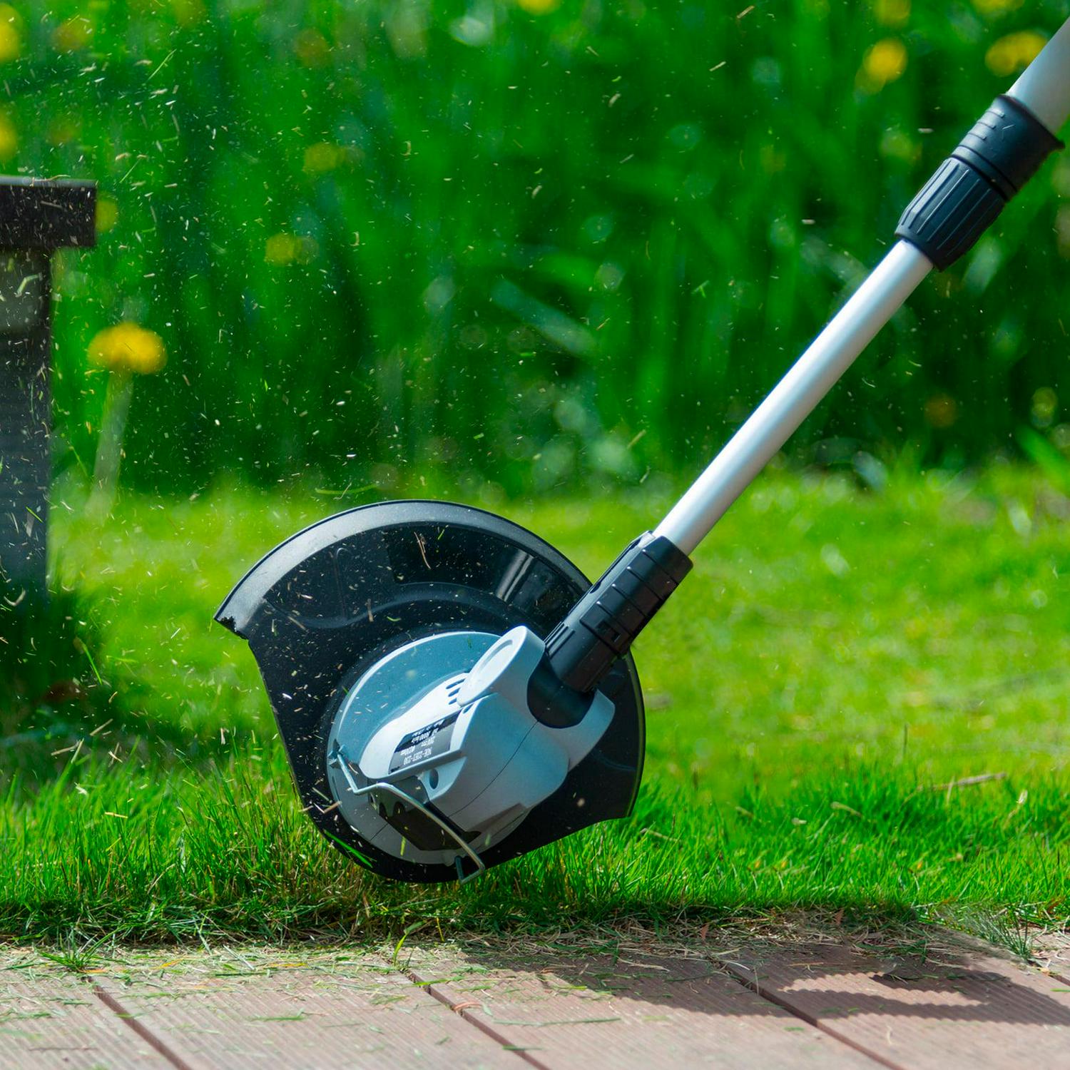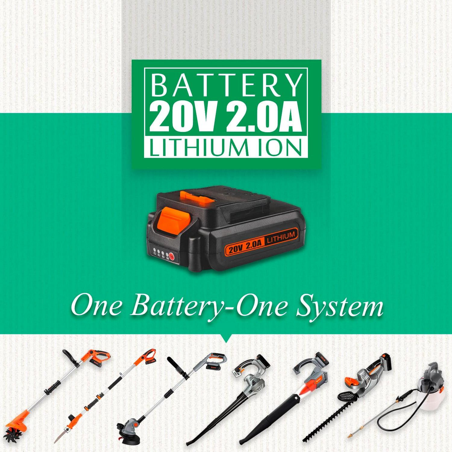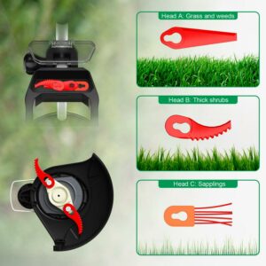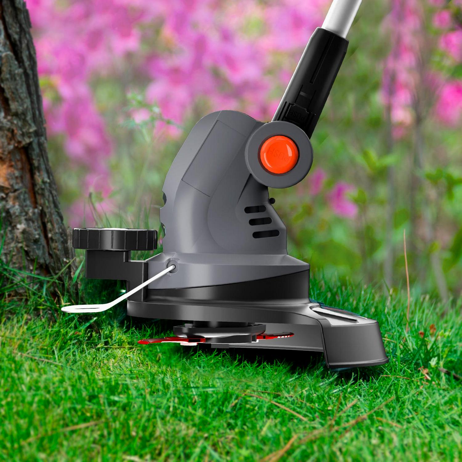 Weed Wacker–Ukoke UGT-02 Grass Trimmer is intended for cutting weed, grass, under bushes on slopes and edges or similar soft vegetation in areas that are hard to reach. It may not be used to work on unusual thick, dry or wet grass, Pasture grass, or to shred leaves. Edging & Trimming– Converts from a trimmer to an in-line edger in seconds with no tools. Pivoting head allows for edging and trimming capability. Easy & Efficient–NO SPOOL, NO FEED TRIMMER LINE.Three different styles of cutting head to fit all purposes, easier for cutting grass weed, thick shrubs, and sapplings. Power Drive Transmission for increased torque performance to cut thicker grass and weeds. Comfortable to Use–Cutting head can be adjusted to different angles to Best fit your job requirement. Lightweight compact cordless design for true portability; Ergonomic Designed-Grip Auxiliary Handle– Makes it easy to cut from the top or either side; overmold soft grip handle for better grip and less fatigue. Durable & Safe-Dual Start– protection switch eliminating the danger of accidental start-up.Certifications-confidence with multiple Certifications (UL, ELT, CE, GS, EMC, CSA). These stringent certifications the tool is safe and durable to use. Incudes–1*12 in. cordless trimmer/edger, 1*Ukoke 20V 2.0AH lithium ion battery, 1*Ukoke charger, 1* guard, 1* auxiliary handle,3* cutting heads .