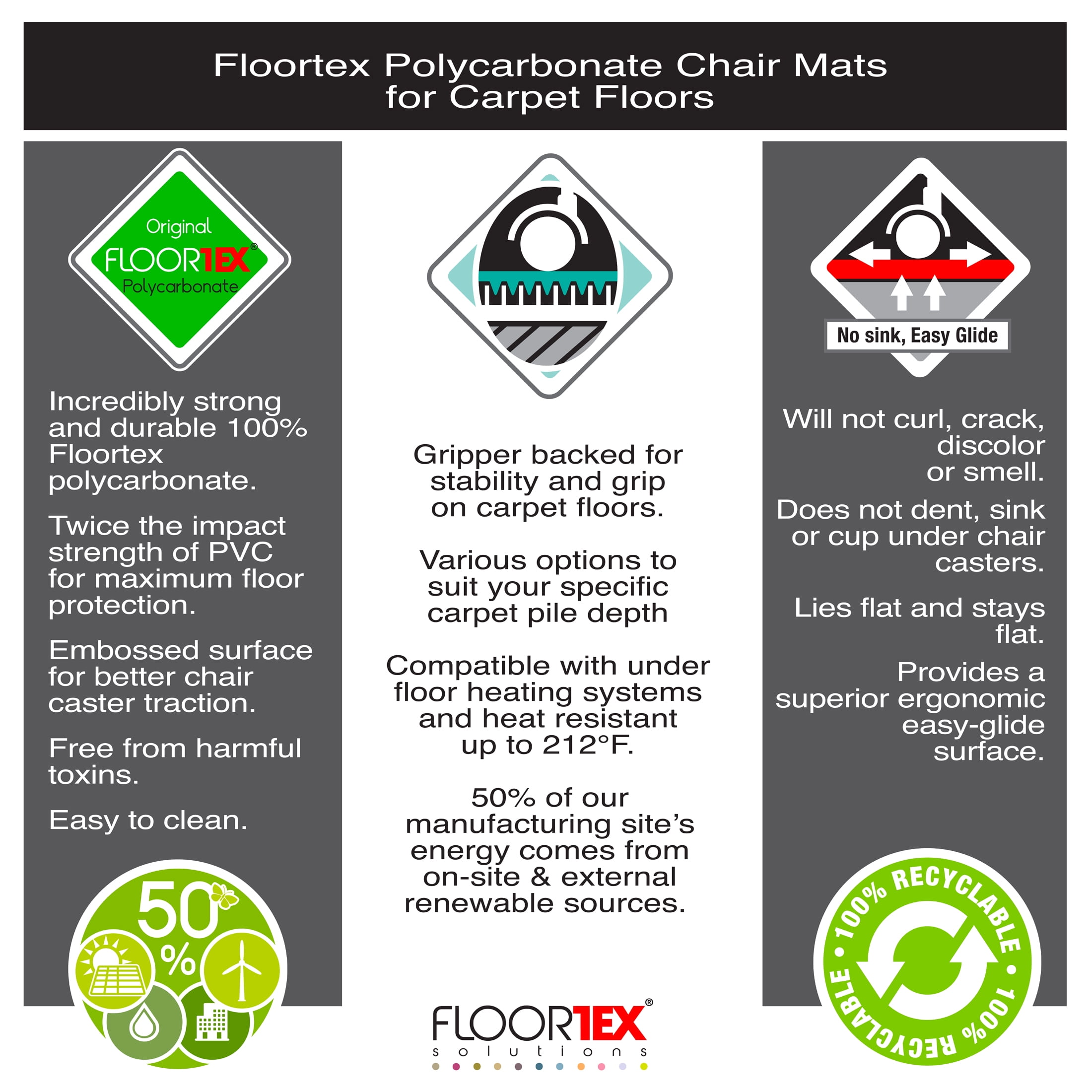 Floortex Ultimat Polycarbonate provides the ultimate in quality, clarity and durability. Provides ergonomic benefits for chair users by providing easy glide movement and reduced leg fatigue. No cracking, no curling, no dimpling, no yellowing, no smelling. Free of toxic chemicals and PVC. Polycarbonate mats can be used immediately, unlike PVC there is no need to wait for the product to lie flat.