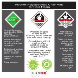 Floortex Ultimat Polycarbonate provides the ultimate in quality, clarity and durability. Provides ergonomic benefits for chair users by providing easy glide movement and reduced leg fatigue. No cracking, no curling, no dimpling, no yellowing, no smelling. Free of toxic chemicals and PVC. Polycarbonate mats can be used immediately, unlike PVC there is no need to wait for the product to lie flat.