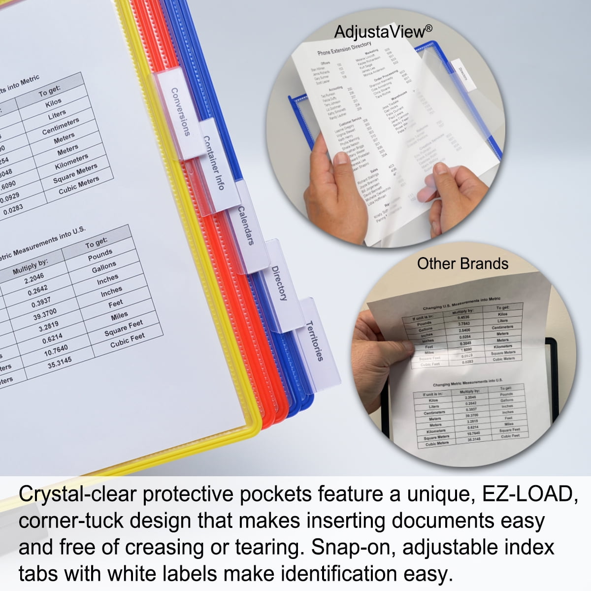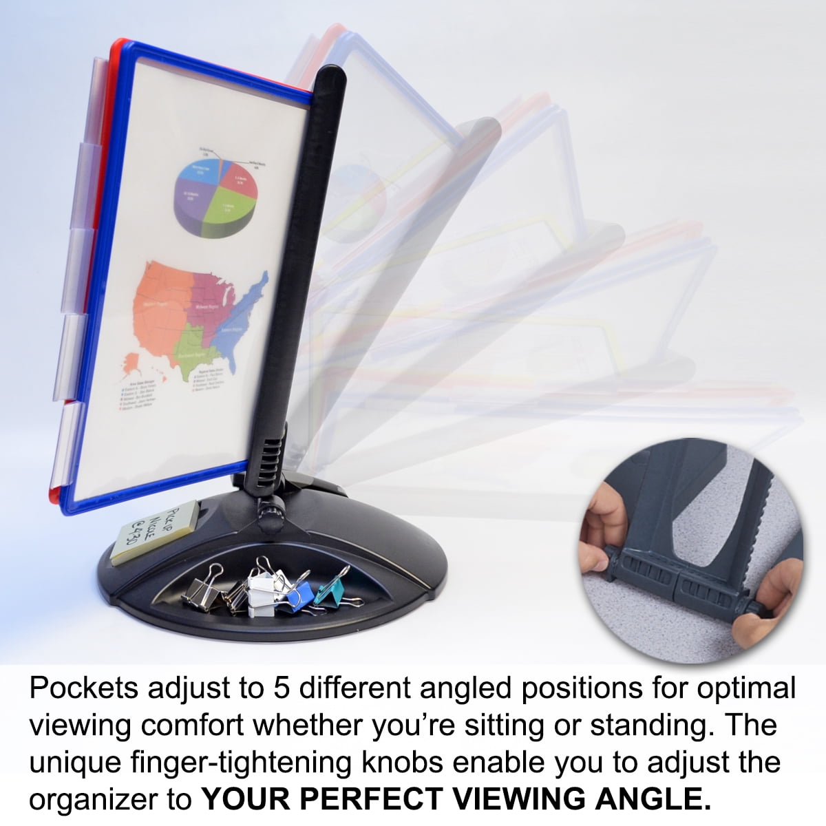 FIND INFORMATION FAST – AdjustaView Provides EASY access to information you need every day – 10 pockets display up to 20 letter-size sheets. Brightly colored pockets quickly direct you to frequently used information. Crystal-clear protective, easy-load, corner-tuck pockets make inserting documents easy and free of creasing or tearing. Each pocket displays two single-sided sheets or one double-sided document. Adjustable index tabs and labels quickly direct you to the appropriate page. Round 12 inch base provides excellent stability, and scratch-resistant bottom protects desk or shelf surfaces. Compartments on the side of the base store pens, paperclips, and more. Recessed front compartment is the perfect size for holding Post-Its.