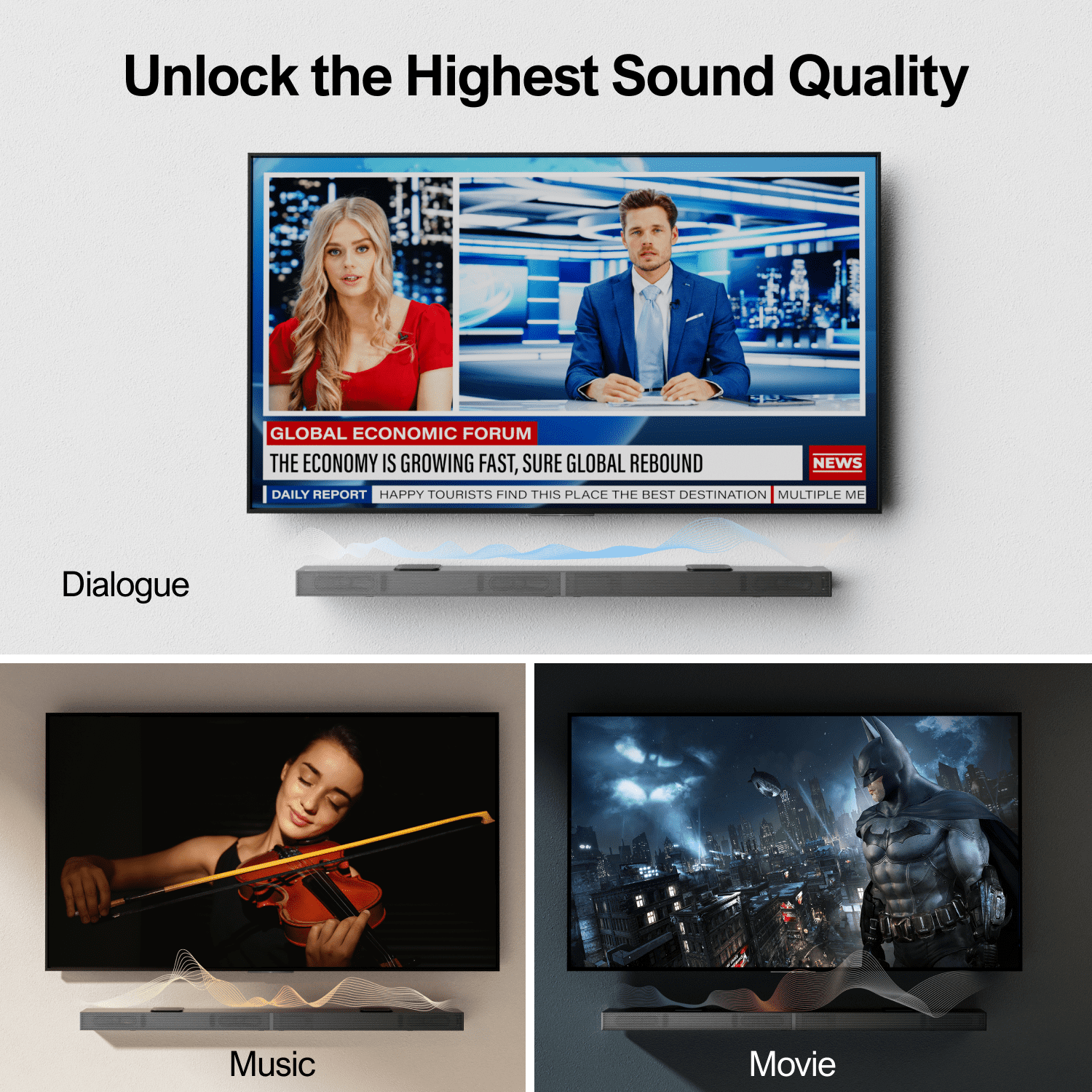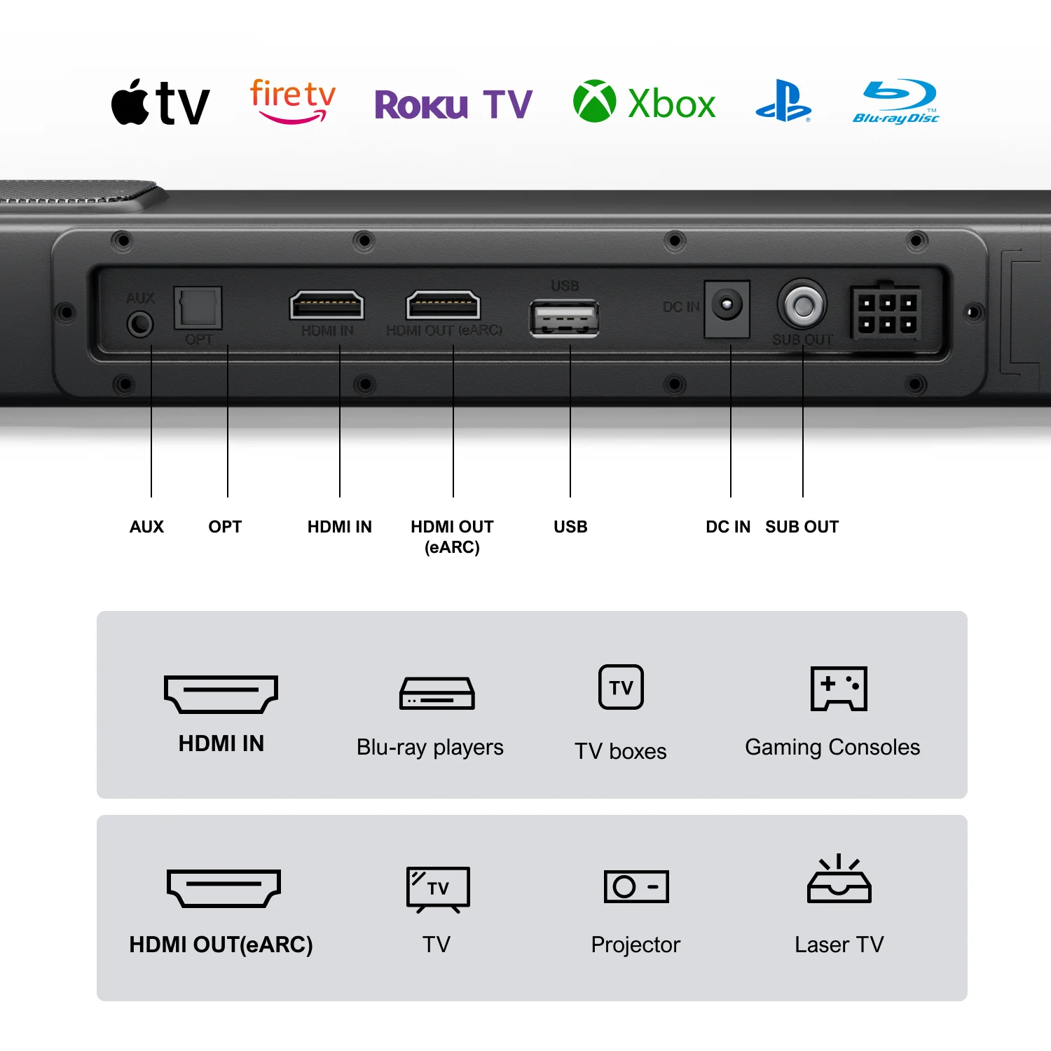 3.1.2 Channel True Dolby Atmos: Enjoy true three-dimensional audio for a captivating entertainment experience. 4K Dolby Vision HDR Pass-Through: Elevate visuals with seamless 4K Dolby Vision HDR, setting a new home cinema standard. Dynamic 6-Drive System, 390W Power: Unleash powerful sound with a precision six-driver system, reaching a peak power of 390W. Deep Bass, BassMax Technology: Experience impactful bass with BassMax technology and enhanced magnetic design. 2 Up-firing Drivers for Height Elevation: Enhance your soundstage with dual upward-firing drivers for added dimension. Sleek Compact Design: Redefine your space with a sleek design that seamlessly blends luxury and functionality. Enjoy Easy and Fast Connections: HDMI-IN, HDMI-eARC, Optical, AUX, USB, and Bluetooth 5.3 options.