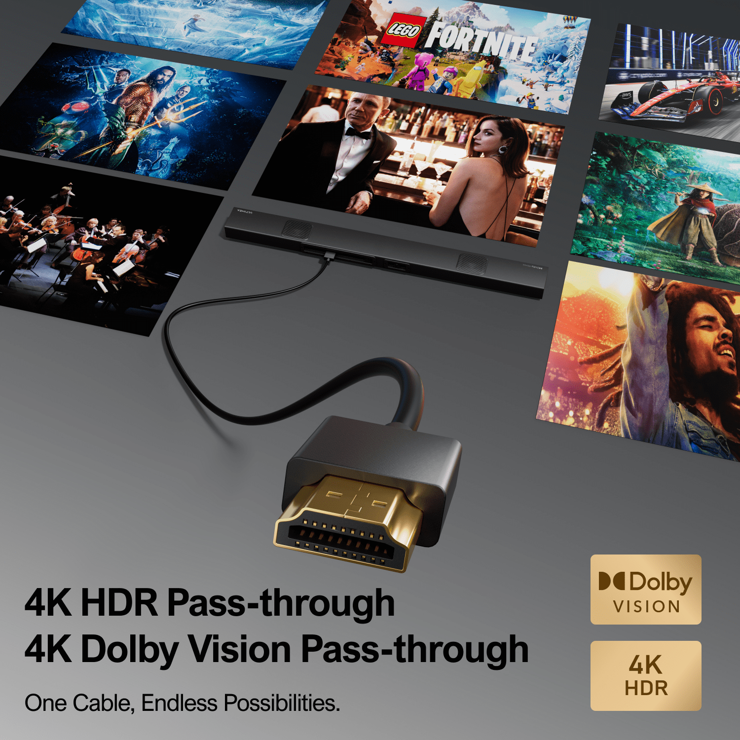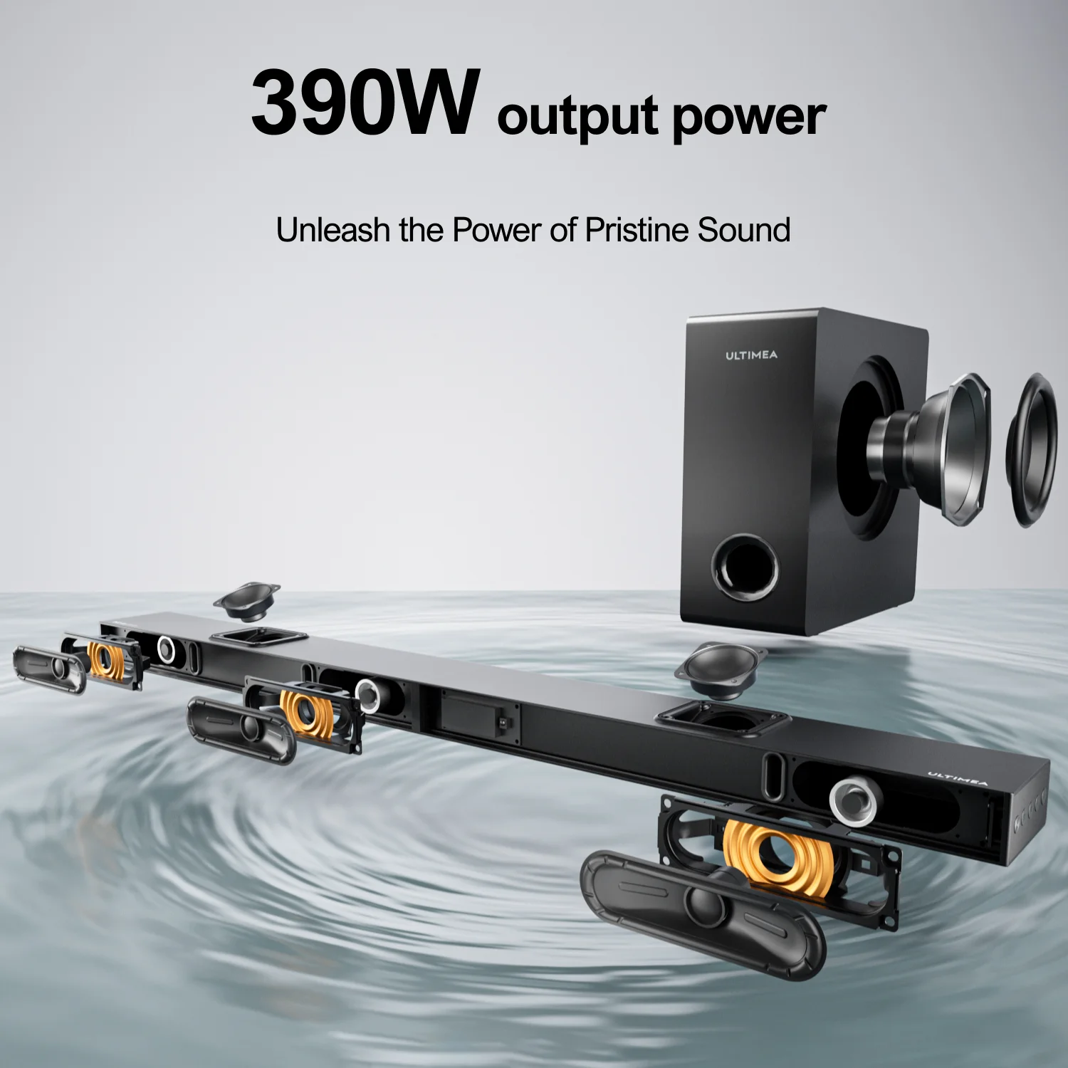 NOTE: At ULTIMEA, we highly value individual sound preferences and offer a diverse range of personalized EQ programs to cater to your unique requirements. If you find the need, please reach out to us for balanced bass, enhanced bass levels, treble adjustments, improved sound quality, clearer vocals, EQ fine-tuning, volume reduction and more. Elevate your audio experience to extraordinary heights with ULTIMEA’s 3.1.2ch Sound Bar – a symphony of innovation and power! Immerse yourself in the richness of Dolby Atmos, heightening every sonic detail for an unparalleled cinematic encounter. Let the visuals come to life with 4K Dolby Vision HDR pass-through, delivering stunning clarity and color precision. Feel the pulse of your entertainment with our exclusive BassMax technology, allowing you to tailor the robust bass to your preferences. With six precision-engineered drivers, the Sound Bar boasts an impressive 390W peak power, ensuring every note and explosion resonates with unmatched intensity. 3.1.2 Channel True Dolby Atmos: The Dolby Atmos soundbar, with its distinctive three-dimensional sound field technology, places you at the heart of the audio experience. The three main channels create a clearer and wider sound field. Two upward-firing drivers contribute to more precise dynamic object positioning. Two Upward-firing Drivers: Soundwaves emitted upward by the soundbar reflect off the ceiling, creating a surrounding sound field. This, combined with Dolby Atmos, precisely locates sounds from the vertical direction, making flying objects, moving objects, and sounds like raindrops, bird chirps, or wind more authentic. 4K Dolby Vision HDR Pass-through: Transmitting video image signals in 4K Dolby Vision and HDR without loss, provides more precise colors and higher-quality videos. Dolby Atmos enhances the fusion of sound and visuals, creating the perfect audio-visual feast for your home theater. Deepened Magnetic Circuit Design & BassMax Technology: The driver’s high-precision material vibrating systems and deepened magnetic circuit design enable a 16mm membrane amplitude. Coupled with Ultimea’s exclusive BassMax technology, the produced bass roars like a fierce beast. 6 Drivers Delivering 390W Peak Power: The 6 high-performance drivers provide exceptional audio quality with a peak power of 390W. The advanced magnetic circuit design and high-strength eco-friendly structural diaphragm reduce irregularities in the drivers, maximizing sound fidelity and ensuring stable audio output. Simplified Entertainment with HDMI IN: Utilizing the HDMI IN port on the soundbar, you can connect multiple devices, including Blu-ray players, gaming consoles, and TV boxes, with a single HDMI cable. This minimizes cable clutter, simplifying the entire home theater system. What’s in the box? 1X Soundbar with Subwoofer 1X 24V/3A Power Adapter 1X 1.5M(59 IN) HDMI Cable & 2X HDMI Adapter 1X Optical Cable & 1.5M(59 IN) 3.5mm RCA Cable 1X 0.14M (55 IN) 6PIN Connect Cable 1X Remote Control 2X Wall Bracket 4X Wall Mount Accessories 1X User Manual