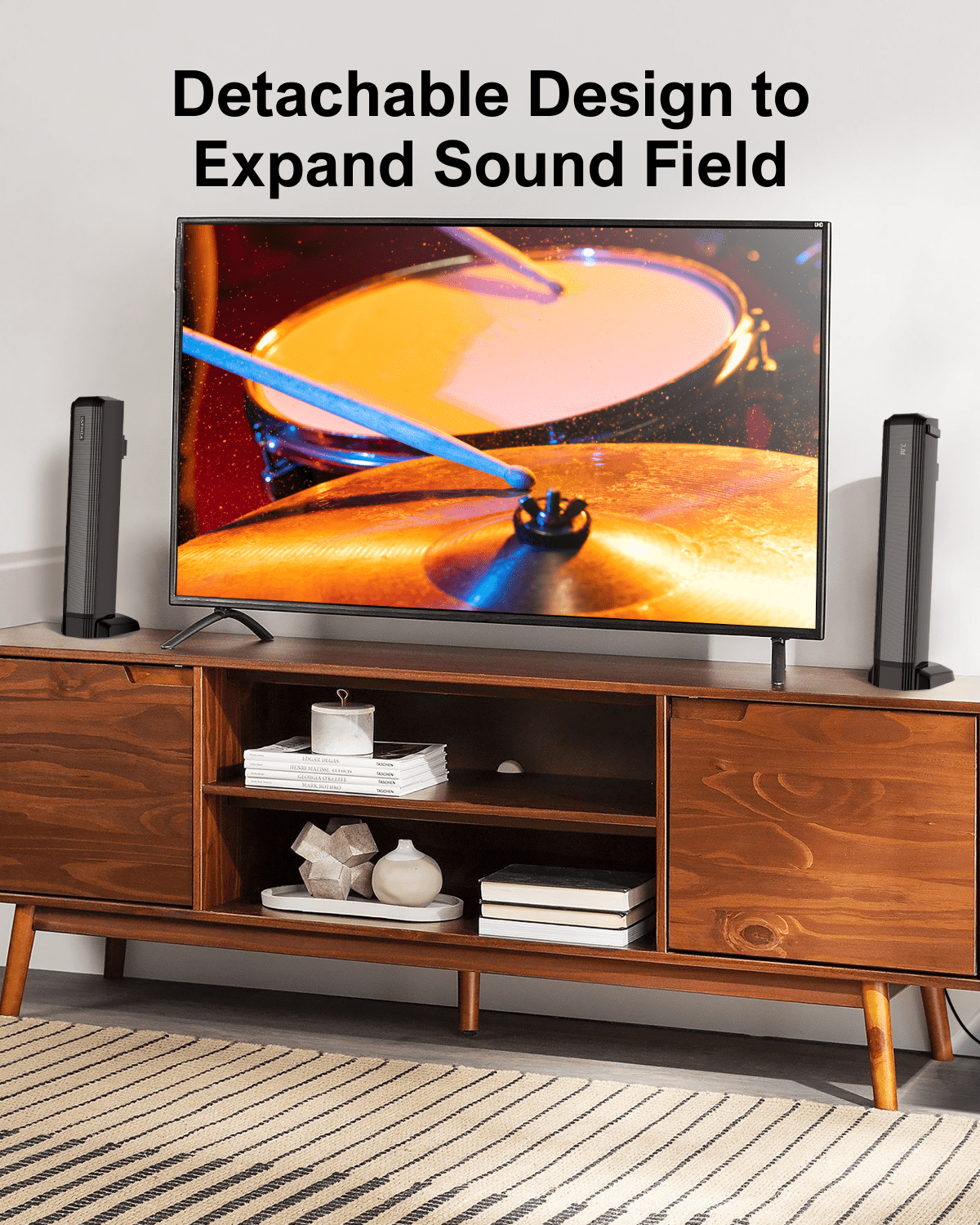 4.1 CH Detachable Soundbar with Subwoofer Detachable Design to Expand Sound Field Dive into the Depths of Bass The Aesthetical Design Fits Every Space Unique7°tilt design enriches the soundstage with exclusive details Break Routine. Flexible Setup HDMI/Bluetooth5.3/Optical/Auxiliary