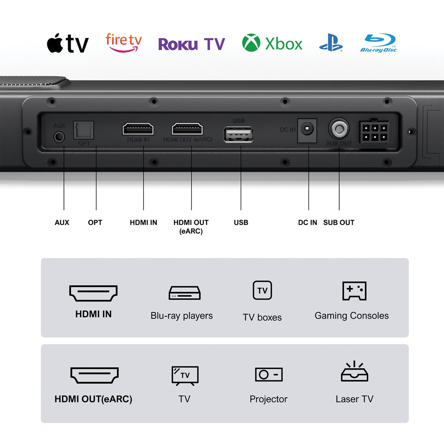 3.1.2-channel system includes a 5-speaker sound bar with three 3.8-in. main drivers and two 1.8-in. up-firing drivers and a wired subwoofer with 5.25-in. bass driver that attaches to the sound bar with a 6-pin cable 390 watts max Frequency response: 45 Hz to 18 kHz; SPL: 100 dB