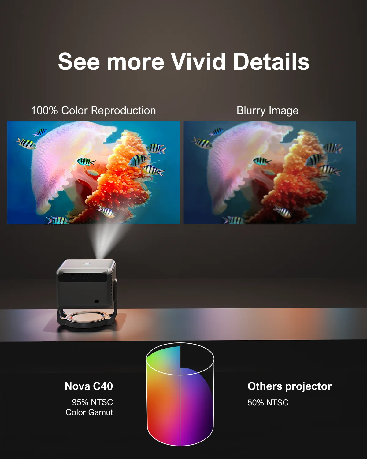 Official Android TV 11.0 Authorization: Easily stream 10,000+ apps with Android TV 11.0, including mainstream APPs like NETFLIX, HBO MAX, Hulu, Disney+, Prime Video, and more. With 2GB of RAM and 16GB of ROM, navigate effortlessly through a vast ecosystem of over 10,000 apps. 90° Gimbal Stand-free: The Nova C40 projector features an Integrated Gimbal Design, Pan (360° horizontally) and Tilt (135° vertically) with ease to find the perfect place for projection even on the ceiling. No elevation hassle—simply aim and project effortlessly. Its portable design with an EPP bag makes it even an ideal outdoor projector. Dolby Audio: Nova C40 wireless Bluetooth projector features ULTIMEA Sound bar technology for premium full-range sound. With 2*5W speakers and Dolby audio, enjoy immersive cinema-grade sound. Built-in Bluetooth 5.3 ensures fast, stable connectivity to your favorite devices. 600 ANSI Lumens: Featuring non-spherical lens technology, it eliminates color distortion and blurriness for consistent high-quality visuals from every angle. With native 1080P resolution and 4K support, enjoy lifelike images. Enhanced with HDR 10+HLG for vivid colors and realistic shadows, creating an immersive experience. Closed Optical Engine: The projector adopts a fully enclosed optical engine design, effectively preventing dust from entering the interior and ensuring stable internal light paths to enhance image quality. The 4K smart phone projector is equipped with HDMI / USB / AV / Audio ports for easy wired connections to PCs, TV sticks, Switch, and laptops.