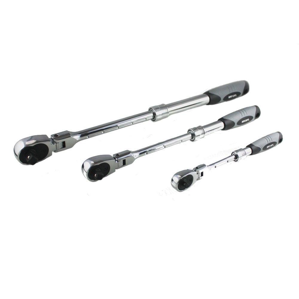 With its new locking flexible head, this product has multiple angles and 72 tooth drive to reach those hard to reach areas. It comes with a full chrome grip and finish which makes it an easy tool to clean. Extra long shaft with 180 degree flexible angle. 72 tooth reversible ratcheting head angles into tight spaces. Durable, heavy duty chrome vanadium construction. Comfort grip chemical resistant handle. Meets and exceeds ANSI torque requirement. Thermal plastic over-molded handle ensures firm grip. MR14FL 1/4 extendable flex-head ratchet, MR382FL 3/8 extendable flex-head ratchet, MR12FL 1/2 extendable flex-head ratchet included.