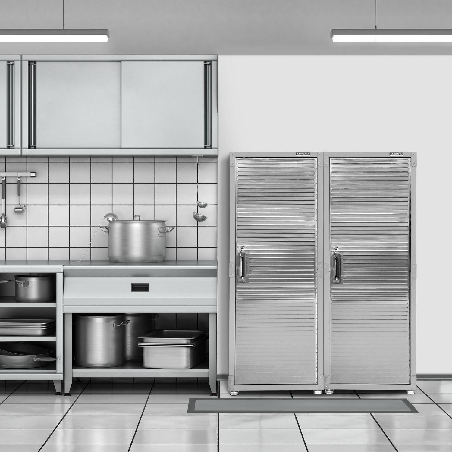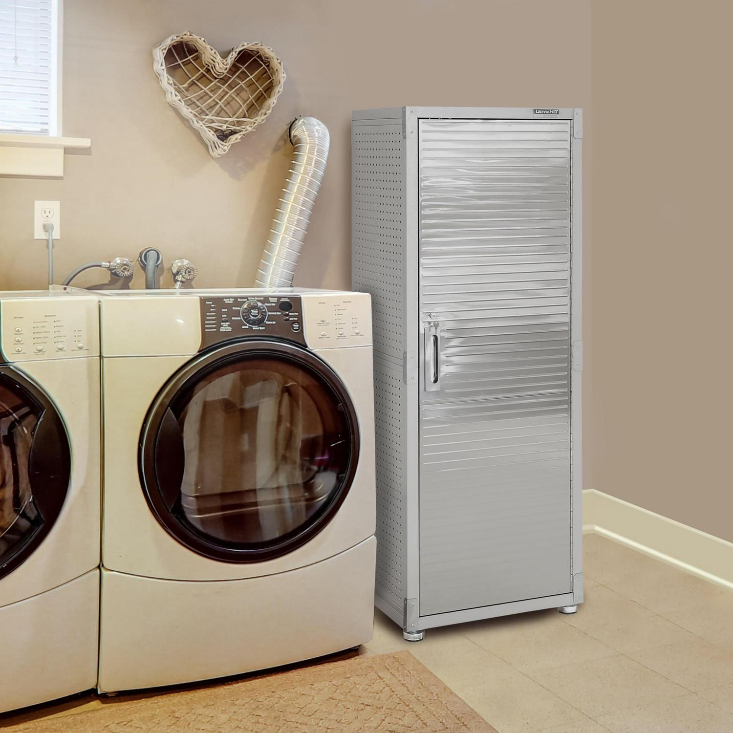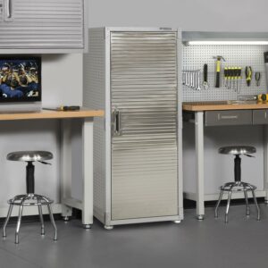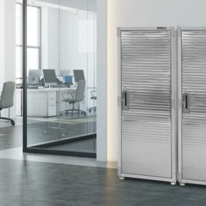 Seville Classics UltraHD Steel Storage Locker Cabinet, 24″ W x 18″ D x 66″ H, Granite Gray. Store and organize with our heavy-duty UltraHD Steel Storage Locker Cabinet. Securely lock your supplies, tools and belongings. This all-steel storage locker cabinet features stainless steel door with 3-point key locking system, 2 adjustable shelves, and heavy-duty padded leveling feet. Ideal for use anywhere including offices, garages, warehouses, schools, and businesses. Assembly required (screwdriver included).