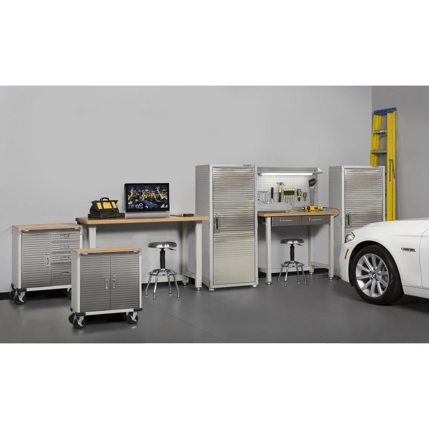 – Pegboard side panels provide space for storage hooks, hangers, baskets and bins