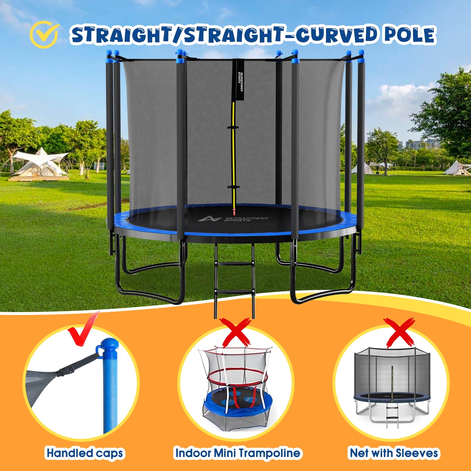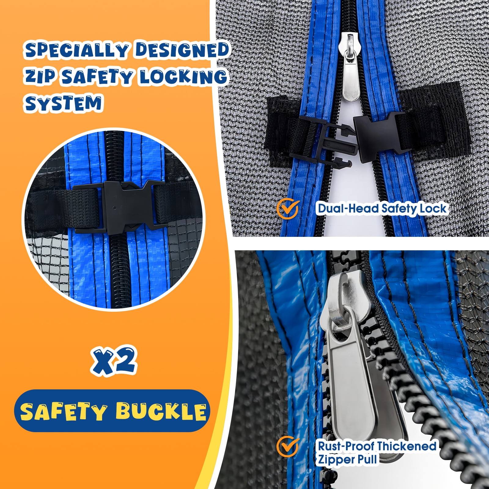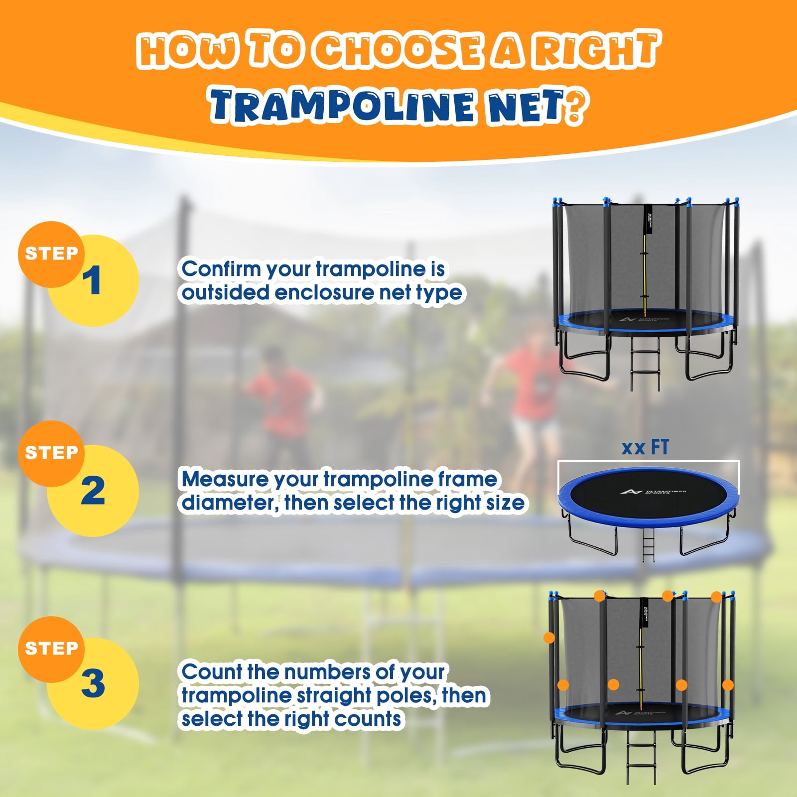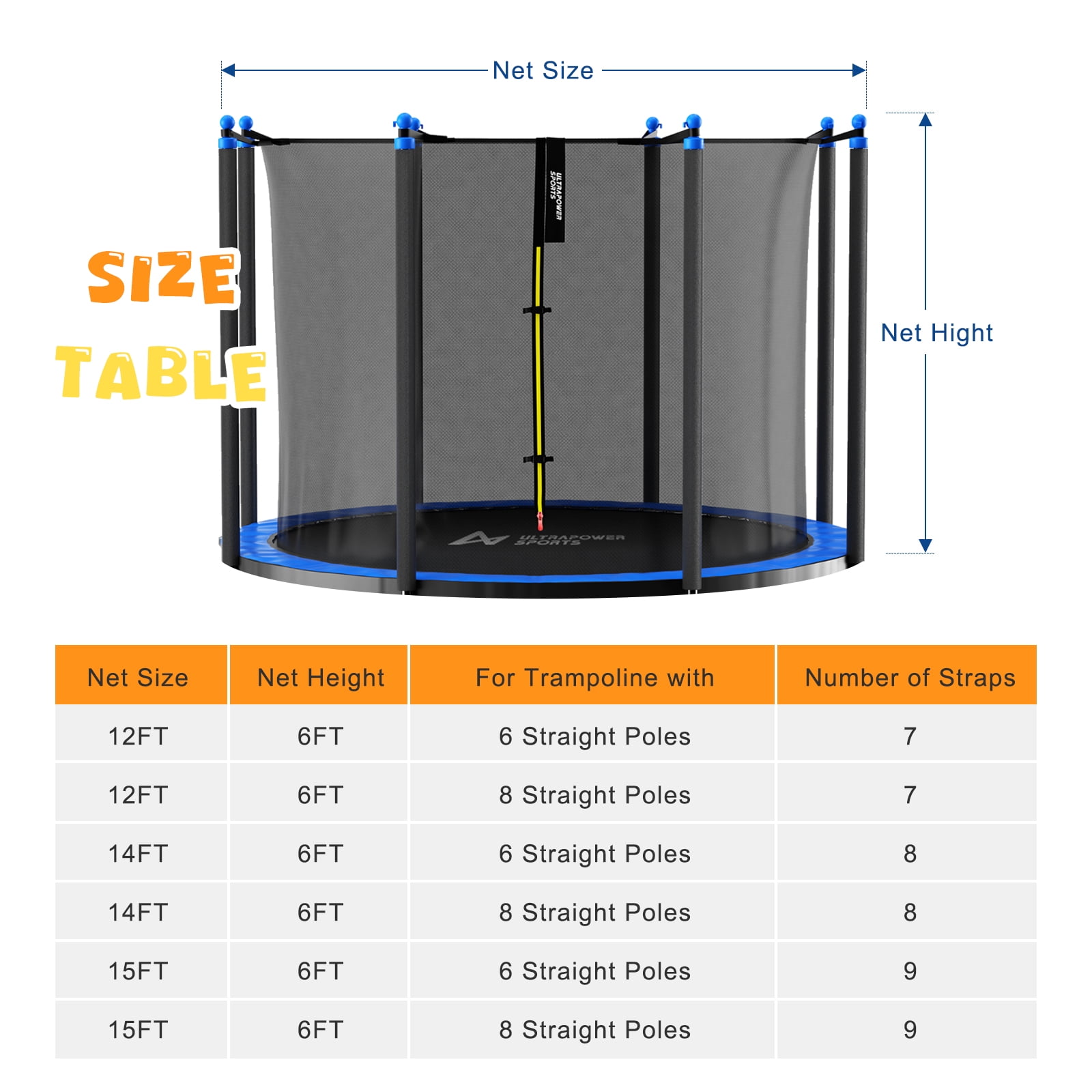 Trampoline Replacement Net (NET ONLY) for Round Trampoline Using Variant Poles and Arches Safety net in the following sizes: 12 13 14 15 16 FT Height: 186cm (1.86m) Safety net Color: Black Sleeve Color: Black Material: PE + PVC, Heavey duty 150g / m² Maschen, 100% UV resistant, waterproof and no color change even after several hours in the sun. Note: Warning: Not suitable for children under three years Net only, It does not come with poles or fixings s High Quality Material Material: PE (polyethylene) Heavy duty 150g / m2 mesh UV resistant Anti-corrosive Anti-degradation Reduce the degree of embrittlement and oxidation, the safety coefficient is much higher than normal PE coating, synthetic and nylon. All TUV, GS, CE certified. It is able to give the maximum protection for children, teenagers or adults and we sincerly ensure its high performance for years to come. Net Zipper Closure Bright yellow+red reversible closure zipper makes use easier. INSIDE and OUTSIDE Zipper with Velcro clip for TRIPLE protection. Minimize the risk of falling, and free you from worries. High Quality Mesh High density mesh makes it more solid and durable,and fine weave to ensure little fingers cannot become trapped. High Quality Sleeve Weather proof PVC (Polyvinyl chloride) sleeve can effectly protecting your trampoline from oxidation and extending the service life. Package Included 1*Safety net only (Not include poles, trampoline or fixings) Measuring Tips to Help You Determine Your Trampoline Enclosure Replacement Step 1: Confirm the type of your trampoline, measure the frame from one outside edge vertically and horizontally to the other outside edge so you get the correct measurements. Step 2: Determine the number of poles or arches that the net will need to connect to. Step 3: Based on the frame size and number and type of poles, see how this net will be installed on your trampoline. Our net is fitted by sliding the sleeves over the poles.