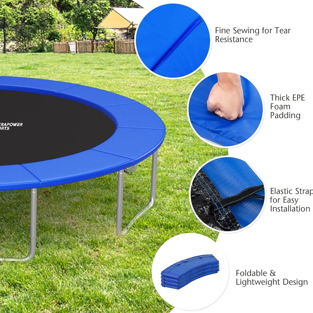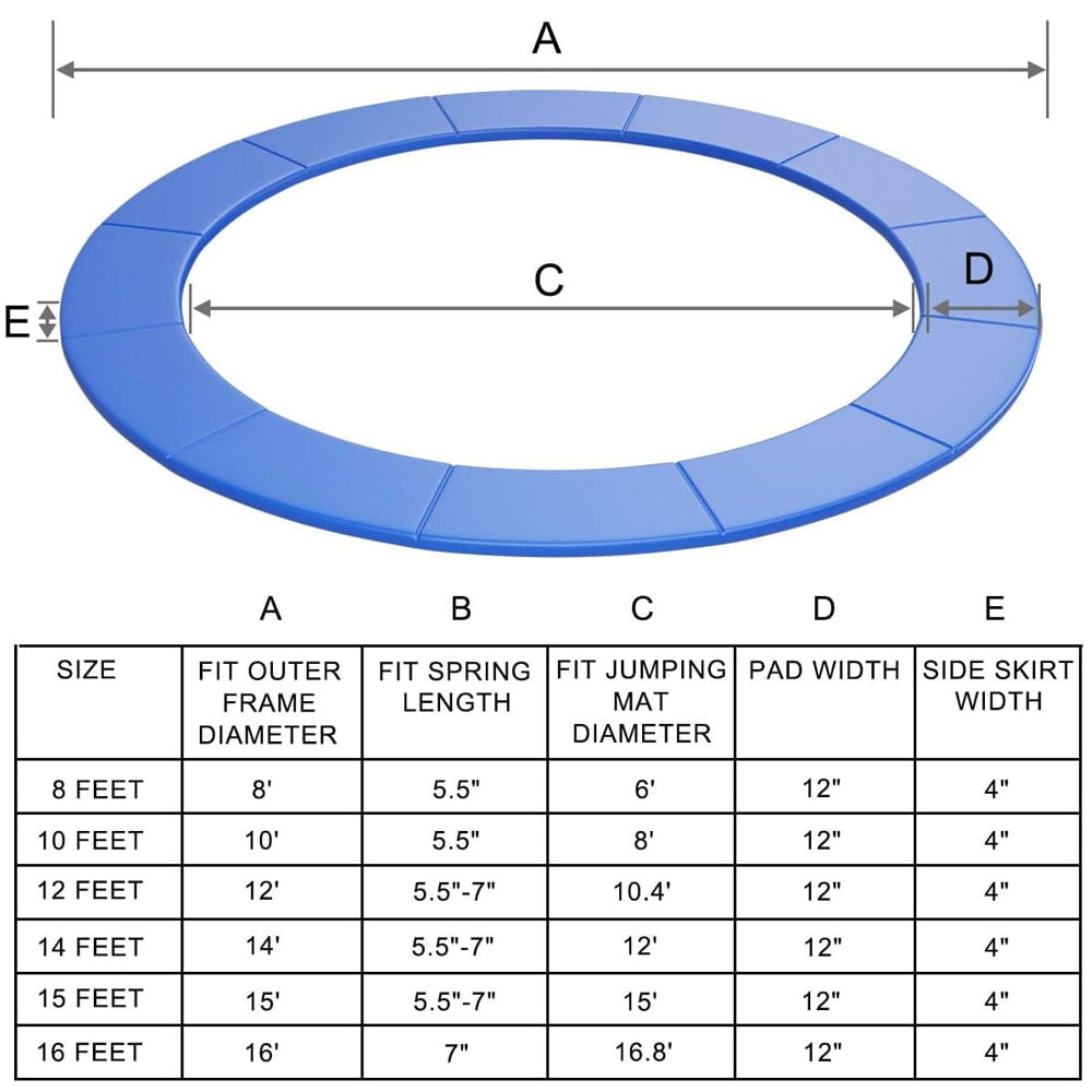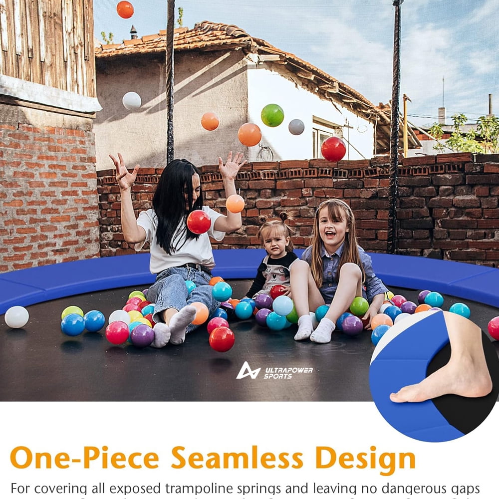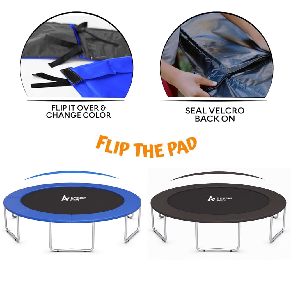 Exclusive Double Sided Spring Pad – Black & Blue added to your trampoline ! double sided spring cover pads only take a minute to install or flip thanks to the velcro and intuitive system. It’s like having two different trampoline outdoor! Durable materials: 350 g/ã¡ PVC; 15mm thick (0.6 inches) sealed EPE foam padding is substantial and durable; Safety guard – 11.8″ wide pad, prevent users from falling through the springs or hurting themselves if they fall on the frame. Standard size – Universal fit 14ft circular trampoline. | The pad is a complete pad,there is no holes for poles.