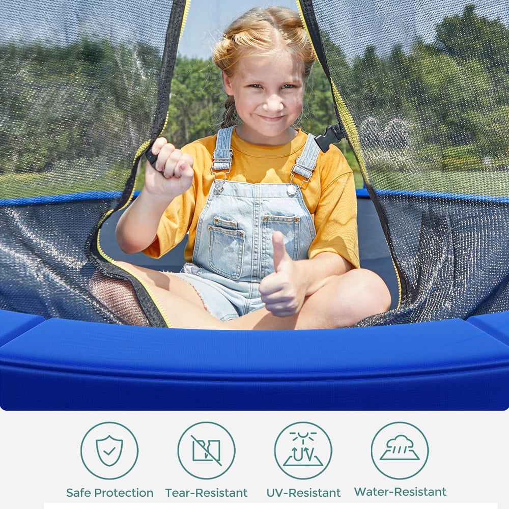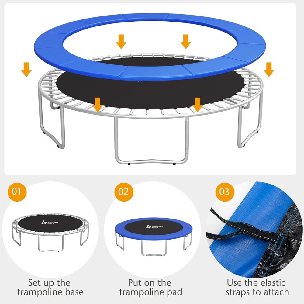 Double Slided Color Frame Cover for Trampoline – 1 Trampoline, 2 Colors ! YOU JUST CHANGE THE COLOR NOT THE QUALITY. Replacement pad for your old, ripped or damaged trampoline pad. UV resistant PVC top, sturdier than other seller’s PE top. 11.8″ wide pad, prevent users from falling through the springs or hurting themselves if they fall on the frame. BOTH SIDES BUILD FROM HIGH RESISTANT PVC MATERIAL and the medium closed cell EPE foam. Specification Colour: Blue/Black Diameter: 10ft 12ft 14ft 15ft Material: Top and bottow cover (500D PVC, 350gsm) / Medium (0.6″ EPE Foam) Pad width: 11.8″ This decides if the spring cover will fully cover the springs. 10FT: 5.5″ ; 12FT: 5.5″-6.5″ ; 13FT: 5.5″-6.5″ ; 14FT: 5.5″-6.5″ ; 15FT: 5.5″-7″ Please ensure diameter of trampoline. The way to measure your trampoline will be from outer frame. The upper side is covered with high-density PVC (350 g/m²) in blue; the under side is made of highly-quality black PVC (350 g/m²) . Both sides are coated so that the cover is robust, waterproof, UV resistant and tear resistant for long-term service. 2 fastening straps at each seam secure the cover firmly to the trampoline. Wide pad protects kids, teens or adults from being scratched or trapped by the spring hooks and space between springs. With 0.6 inch thick closed-cell foam, the safety pad covers the frame completely to protect jumpers from injuries caused by tubes or springs. Measuring Tips to Help You Determine Your Trampoline Enclosure Replacement Step 1: Confirm the type of your trampoline, measure the frame from one outside edge vertically and horizontally to the other outside edge so you get the correct measurements. Step 2: Determine the number of poles or arches that the net will need to connect to. Step 3: Based on the frame size and number and type of poles, see how this net will be installed on your trampoline. Our net is fitted by sliding the sleeves over the poles.