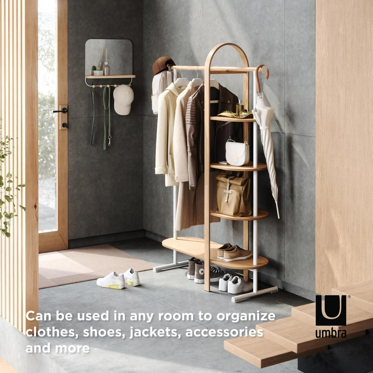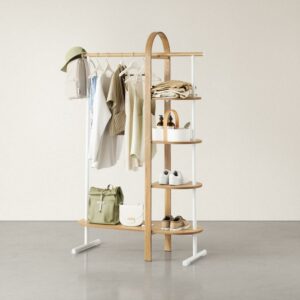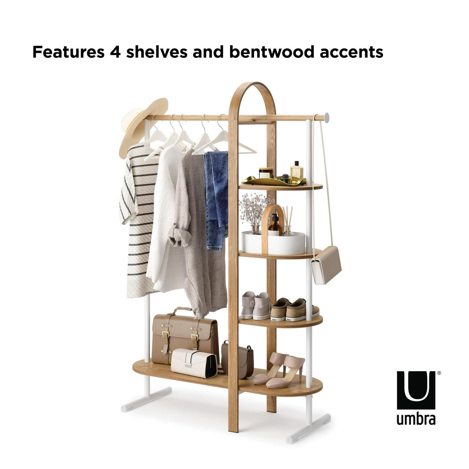 A clothing rack that saves space while adding a decorative touch, Bellwood Garment rack mixes soft curves with bentwood accents. This modern and multi-functional rack is perfect for organizing and displaying your clothes, shoes, bags and other accessories. With four space-saving shelves and integrated steel rod, Bellwood Rack can be used in your bedroom, laundry room, closet, entryway and more to store & organize your belongings. Bellwood Garment Rack is part of our larger Bellwood Collection including a coffee table, side table, planter, storage table, cosmetic organizer and more. Easy to assemble and comes with all necessary hardware and instructions. Max weight capacity of 121lbs. (55kg) overall. Measures 41.65 x 15 x 65.5″ (106 x 38 x 166cm).
