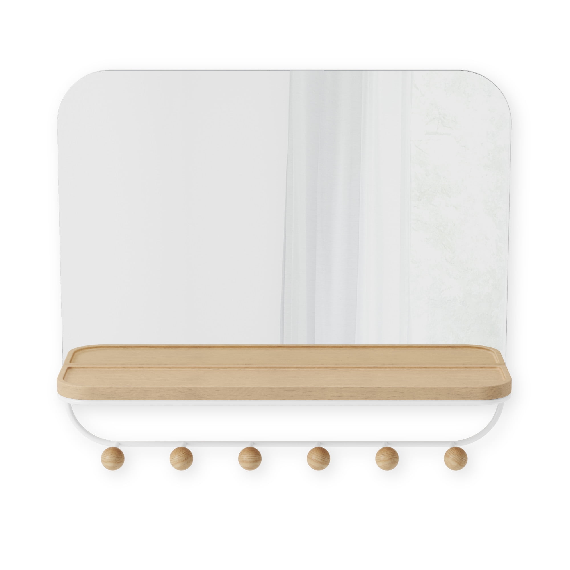 A mirror with integrated storage, Estique features six wooden hooks to protect items while adding a decorative touch. Its integrated tray is perfect to hold your phone, wallet, keys, candles and more, while its mirror provides functionality to touch-up before heading out the door. Its modern mix of wood and metal make it a decorative storage solution that will look great in any home or office space. Maximum capacity of 35 lbs. (16kg) including the hooks and tray.