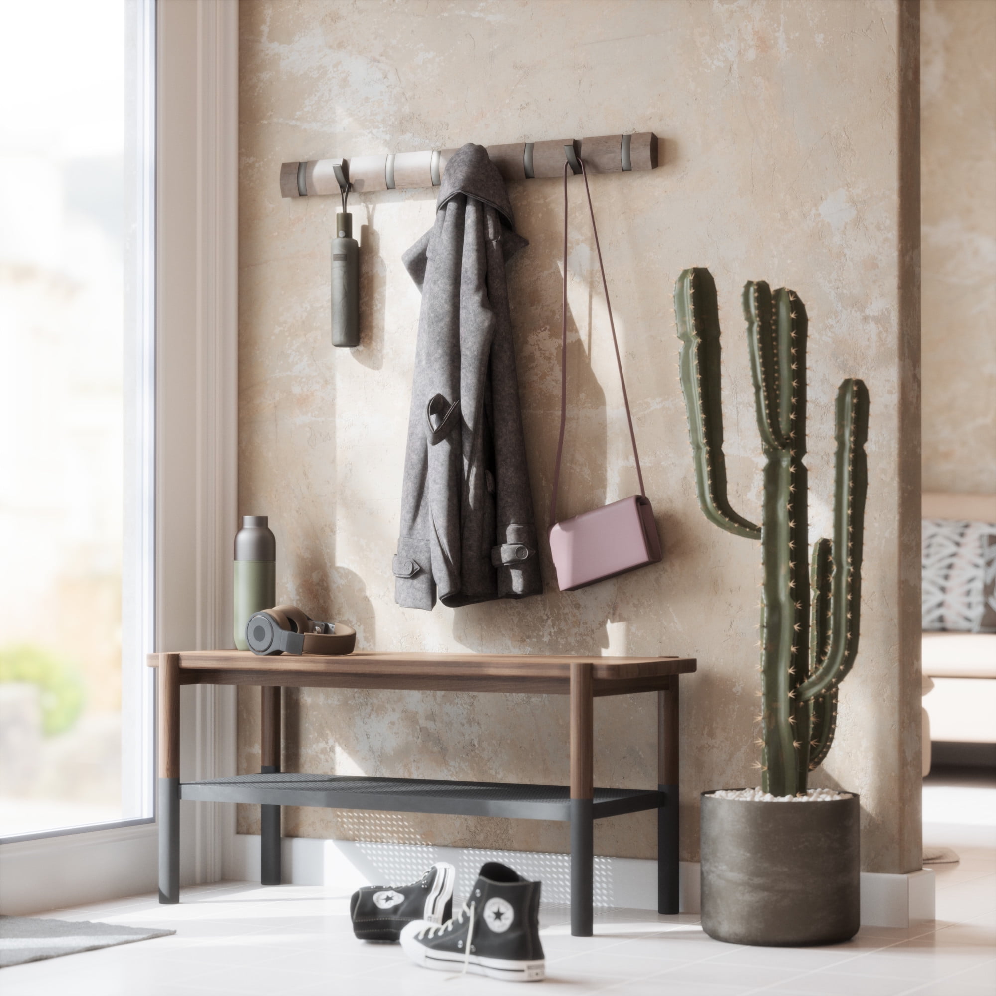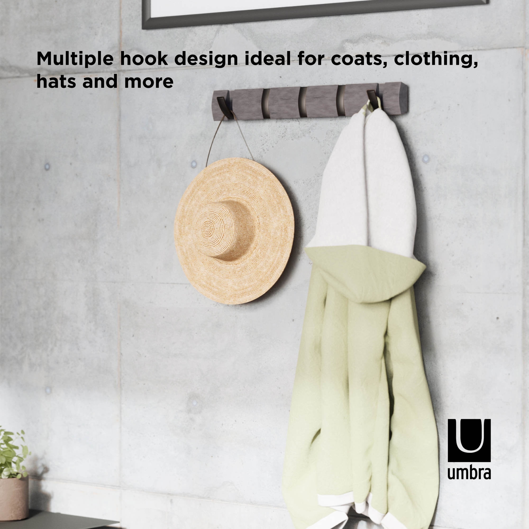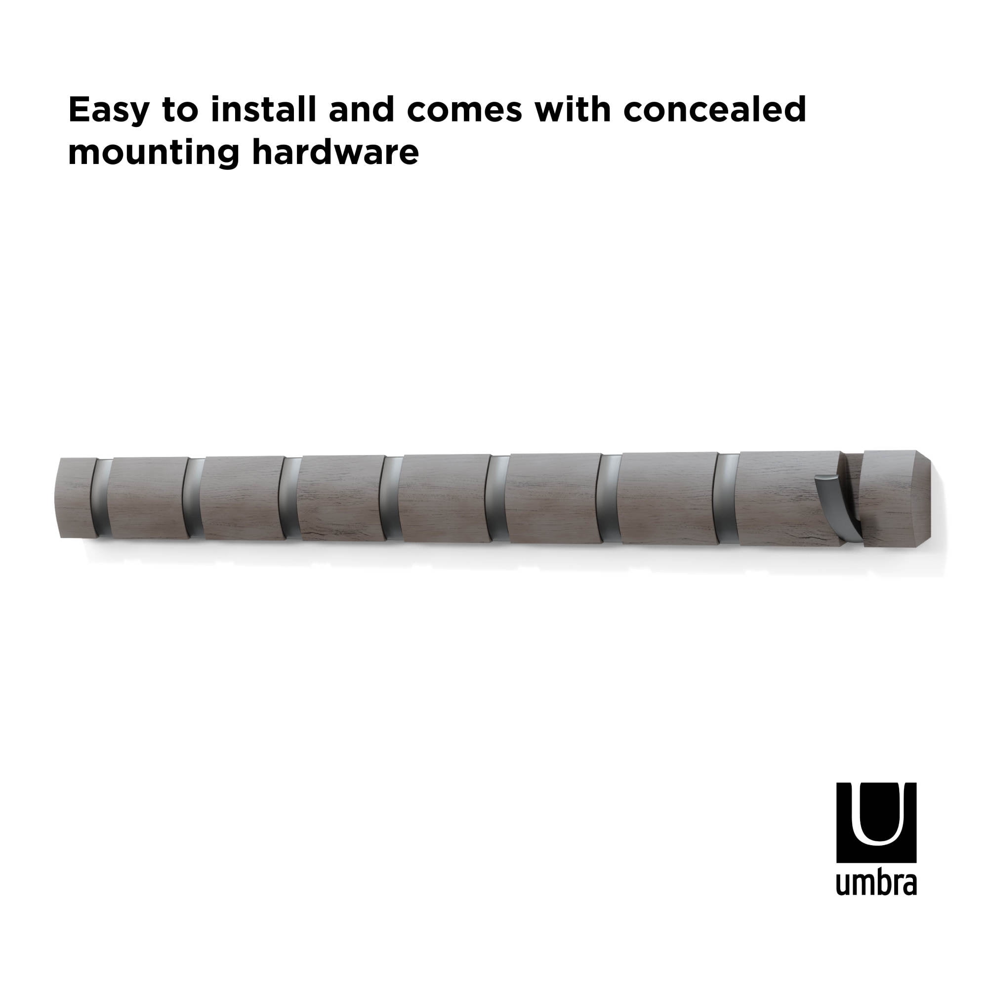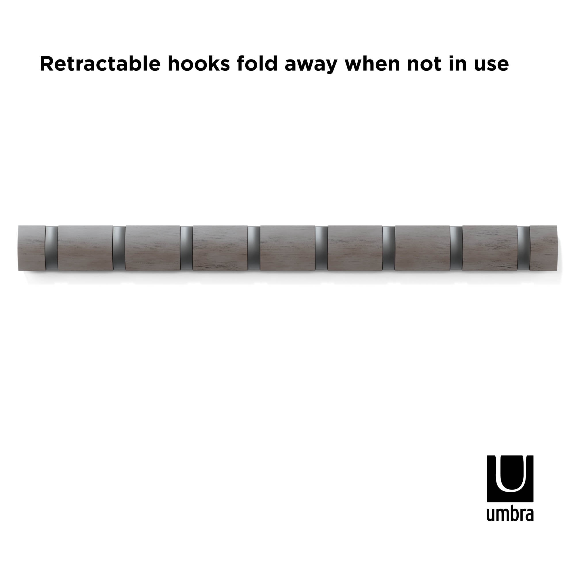 MULTI-PURPOSE WALL MOUNTED HANGER: More than just a coat rack, Umbra Flip is a unique wall mounted rail that features retractable hooks for hanging a variety of items including coats, scarves, purses, umbrellas, towels, clothing and more MODERN SPACE SAVING DESIGN: Unlike traditional coat racks that eat up valuable floor space, Flip is a wall-mounted solution that is ideal for small living spaces or confined entryways thanks to its sleek, streamlined profile and retractable hooks that stow away when not in use ATTRACTIVE & VERSATILE SOLUTION: Available in a variety of stylish finishes to match your existing decor, Flip is versatile enough to use on virtually any wall in your home EASY TO SET UP & USE: Flip Hook Wall Mounted Coat Rack comes complete with simple step-by-step installation instructions and all the necessary hardware to easily mount it to your wall in just minutes ORIGINAL DESIGN & SATISFACTION GUARANTEED: Our team of international designers brings thought, creativity and original design to everyday items. Umbra products are made to last using high quality materials and we back that with a 30-Day Money Back Guarantee & a 5-Year Manufacturer’s Warranty. Don’t be fooled by copy-cat products. Choose Umbra and get the original