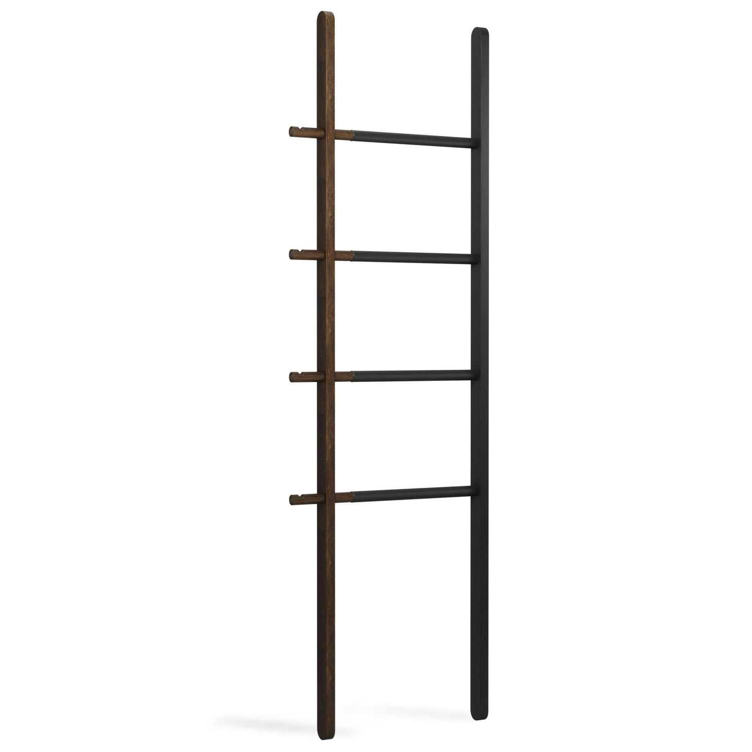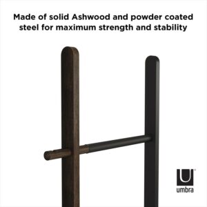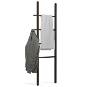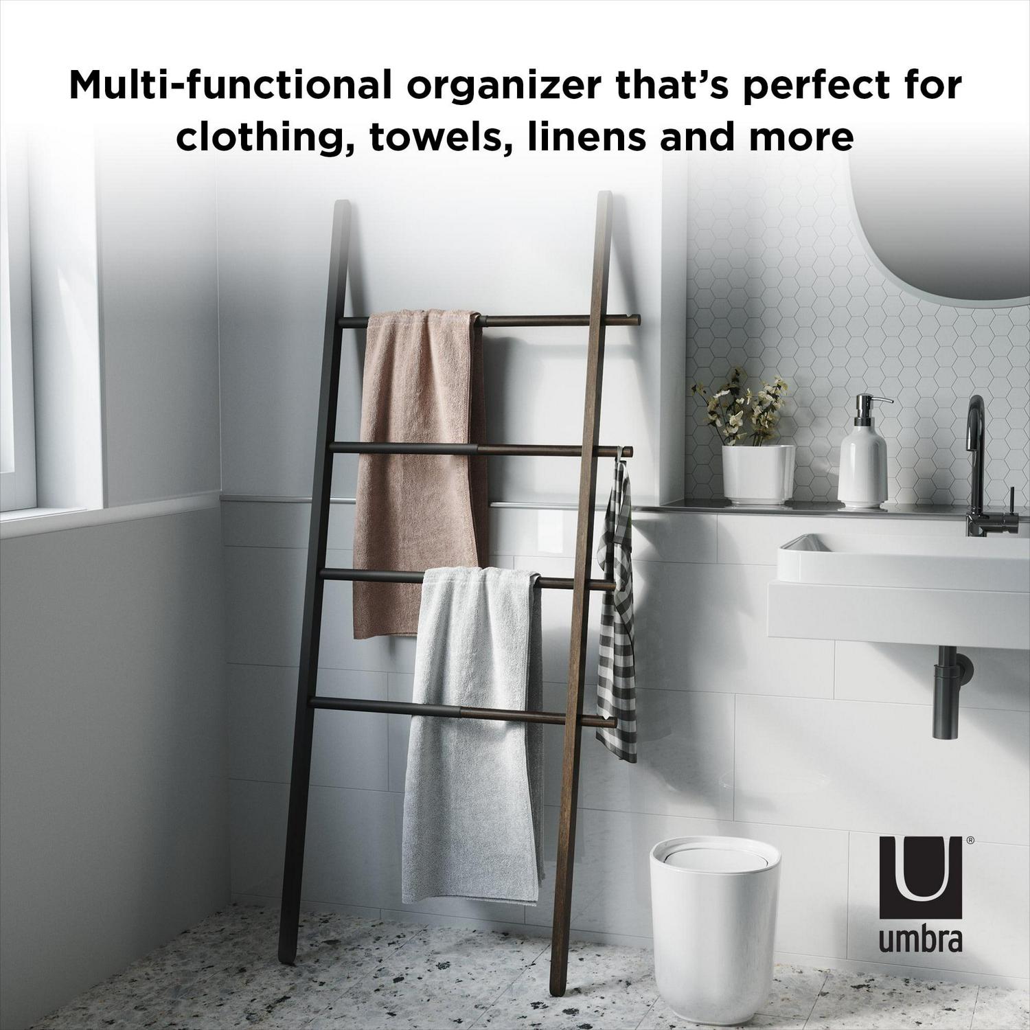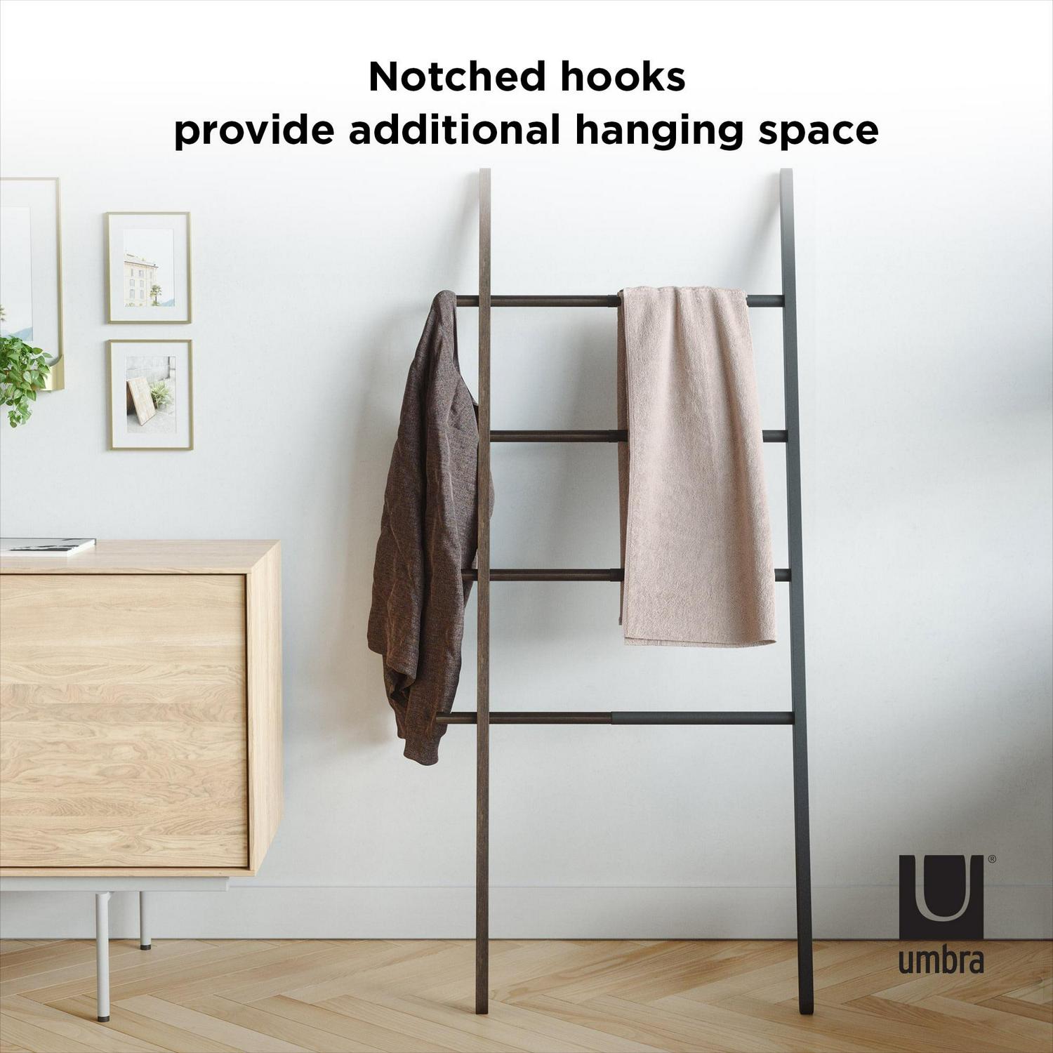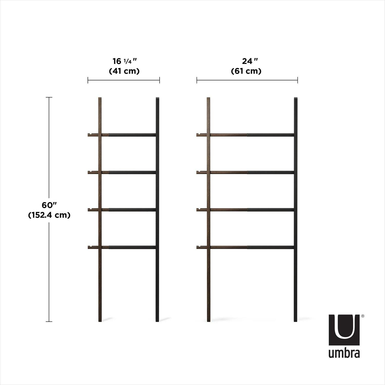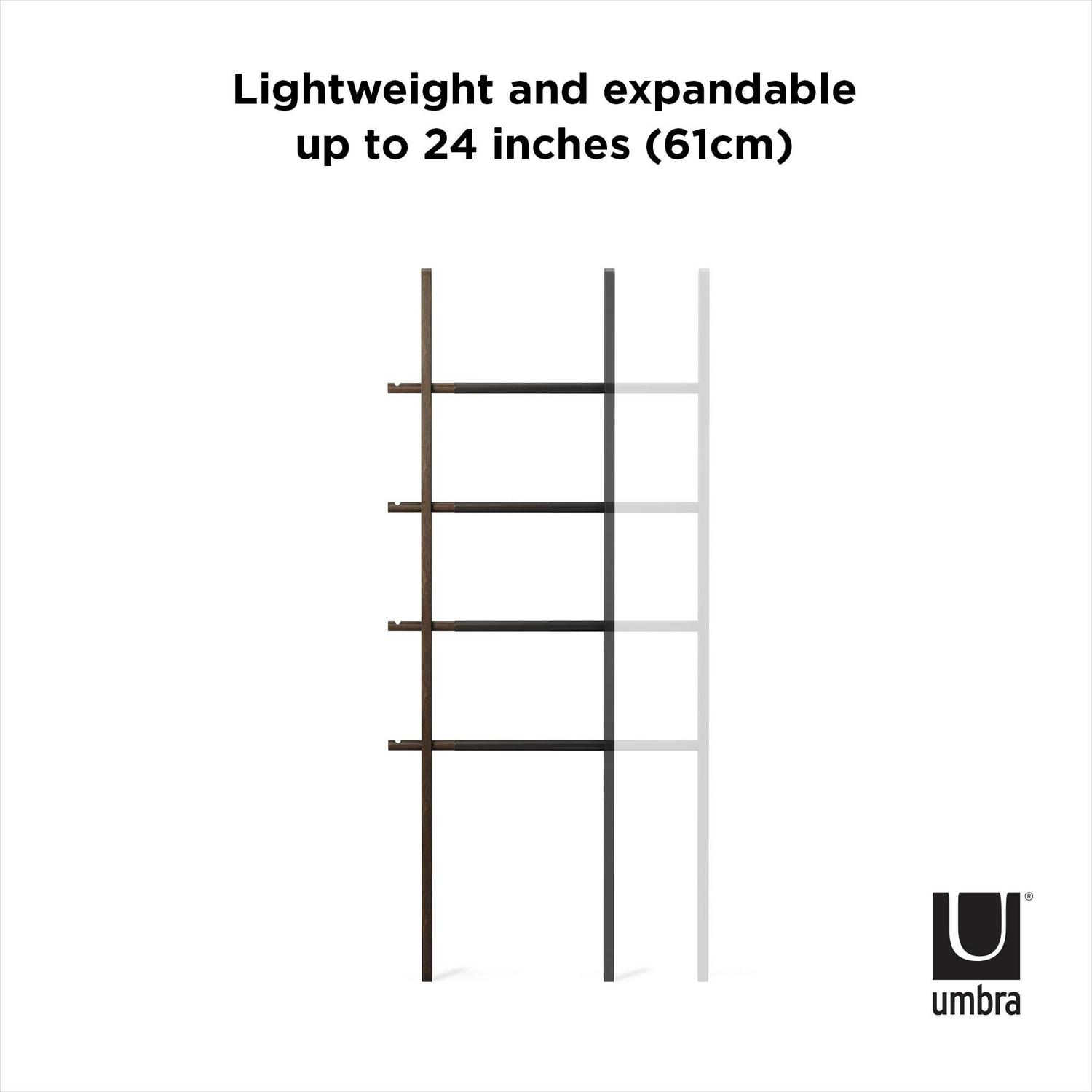 Umbra s expandable Hub Ladder is an extremely stylish and modern organizational clothes rack that can also be used as a bathroom towel rack or for blanket storage. Great for any room, its adjustable size ensures it fits wherever it s needed most in both large and small spaces. Hub measures 60 inches x 16.2 inches and its width expands up to 24 inches allowing it to hold larger items such as towels or linens. Made of solid ash wood and powder-coated steel, this innovative storage solution is the ideal towel rack, blanket rack, or clothing organizer. Note: Hub Ladder is not intended for climbing, with a maximum weight of 5lbs per rail.