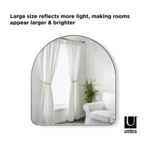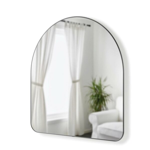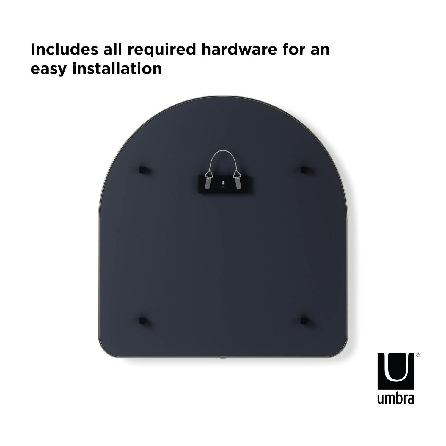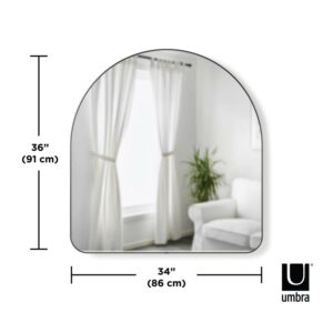 Hubba Arched brings a unique arch shape to the standard mirror. Featuring soft curves and a thin metallic finish rim, use Hubba in your entryway, bedroom or other living spaces to add a decorative touch, while instantly brightening your space. Measuring, 34 x 36 inches (86 x 91 cm), this statement mirror can be leaned up against your mantle or mounted with included hardware.