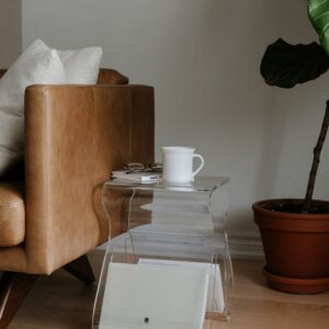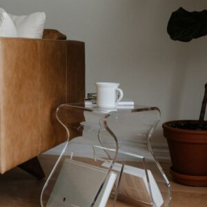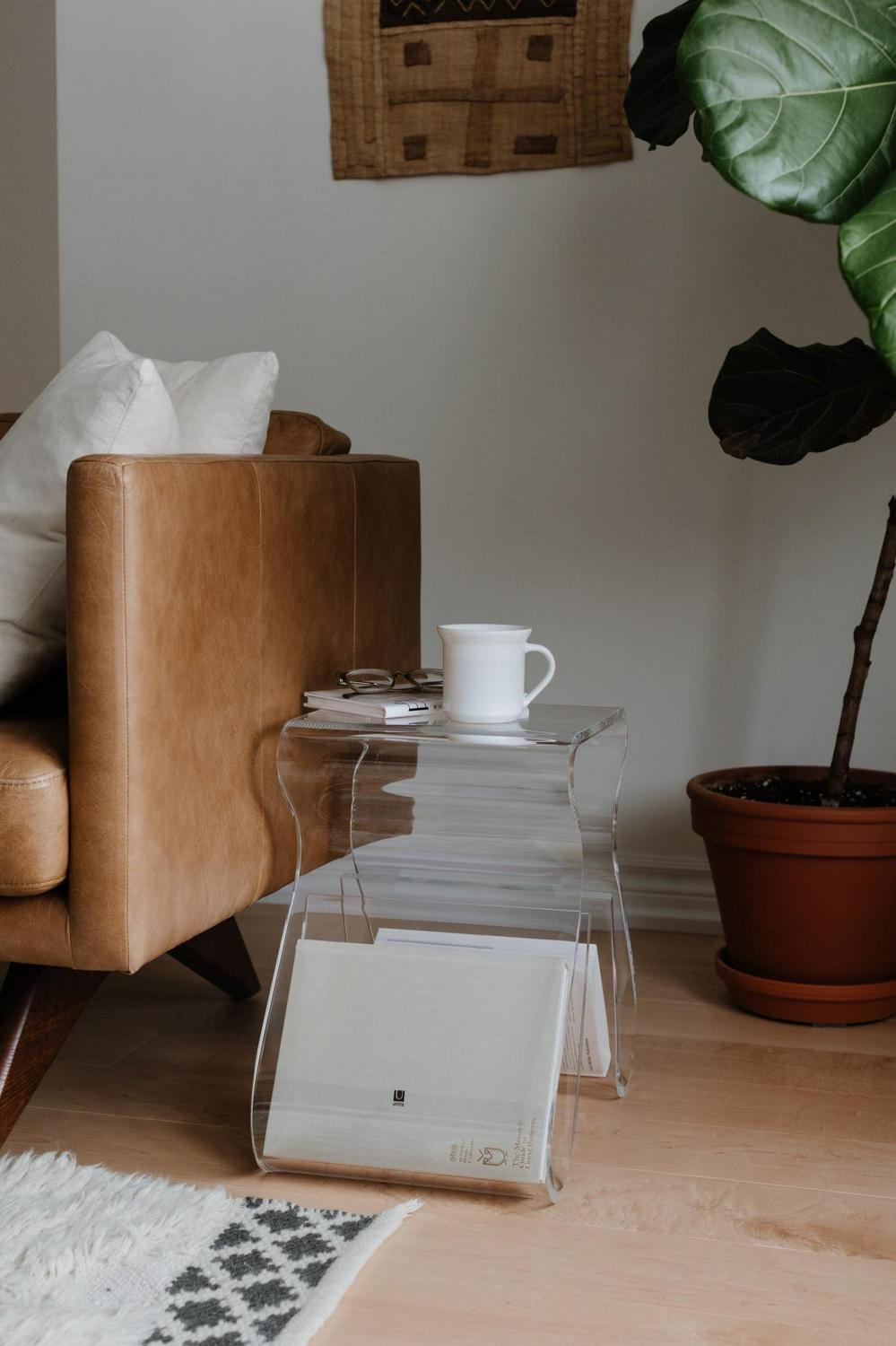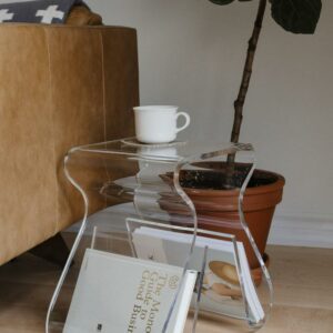 – HIGHLY VERSATILE: Magino is an acrylic table that functions as a sturdy stool or clear side table with built-in magazine storage, but also works great as a side table