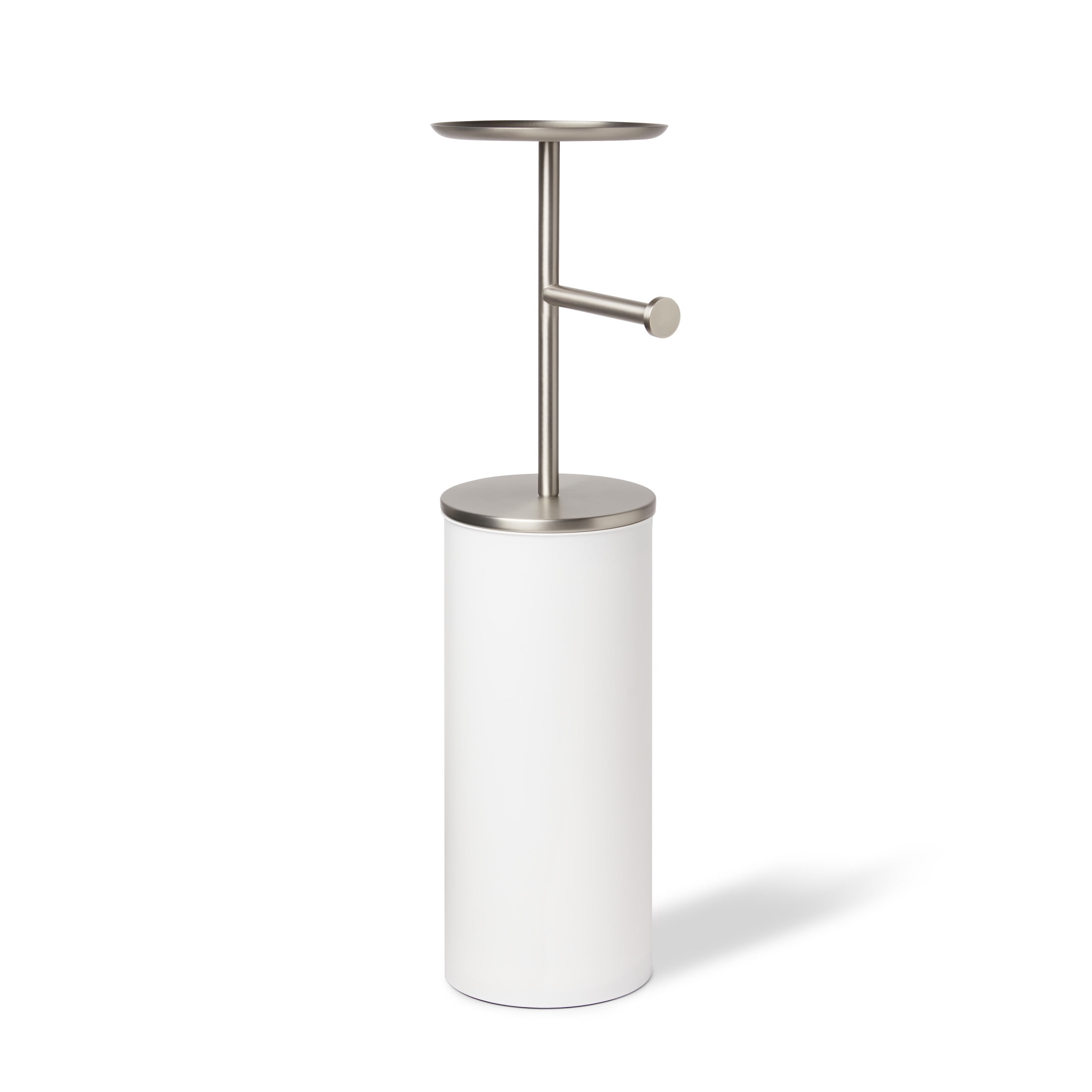 Freestanding and easy to move around, Portaloo makes use of vertical space to deliver a versatile and modern toilet paper stand. Portaloo’s practical design includes a built-in tray for personal items or small decor, as well as storage to hide and hold extra toilet paper rolls. Its white matte body and shiny chrome accents work to complement bathroom appliances and suit a variety of color palettes. Portaloo is convenient, easy to use and fits up to three jumbo size rolls. Measures 8.63 x 6.75 x 25.5″ (22 x 17 x 65 cm). Made with recycled plastics and with an eco-friendlier finish. It produces 85% less water and solid waste than traditional electroplating finishes.
