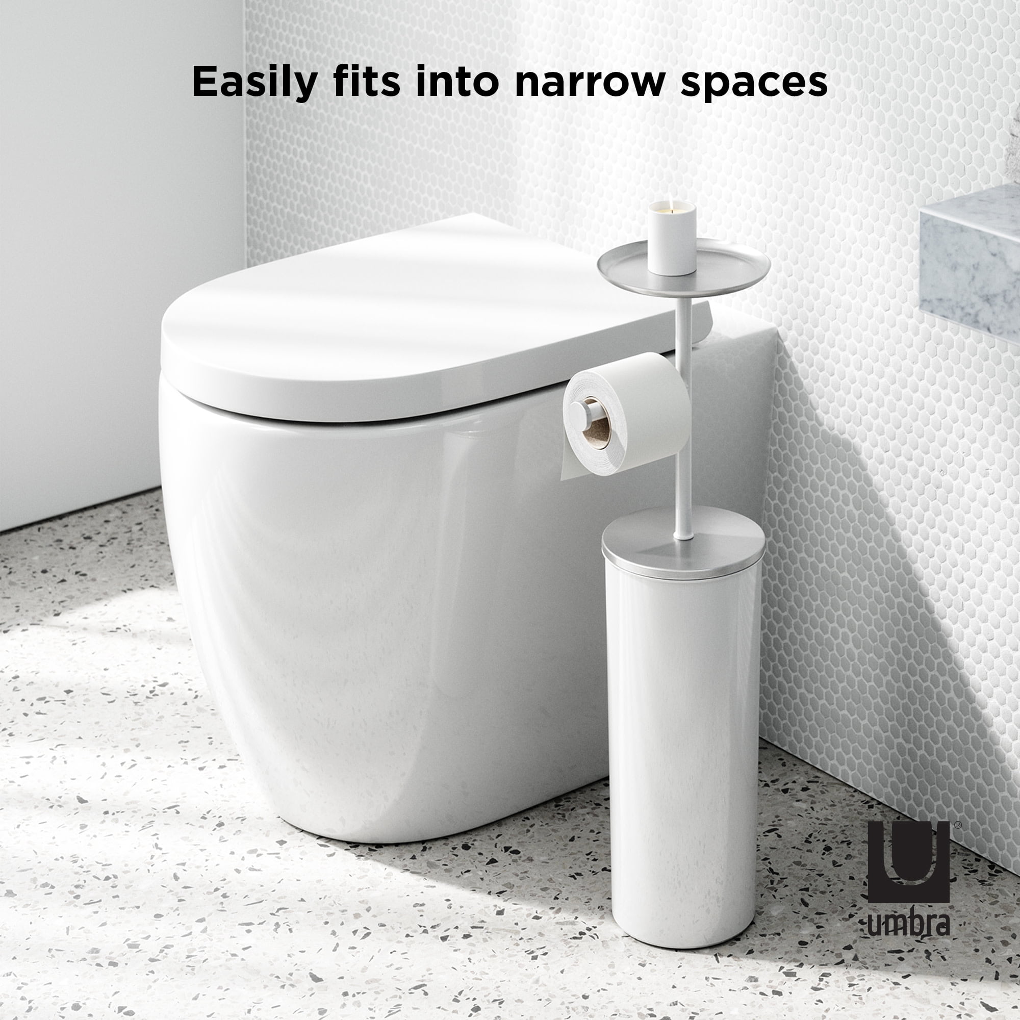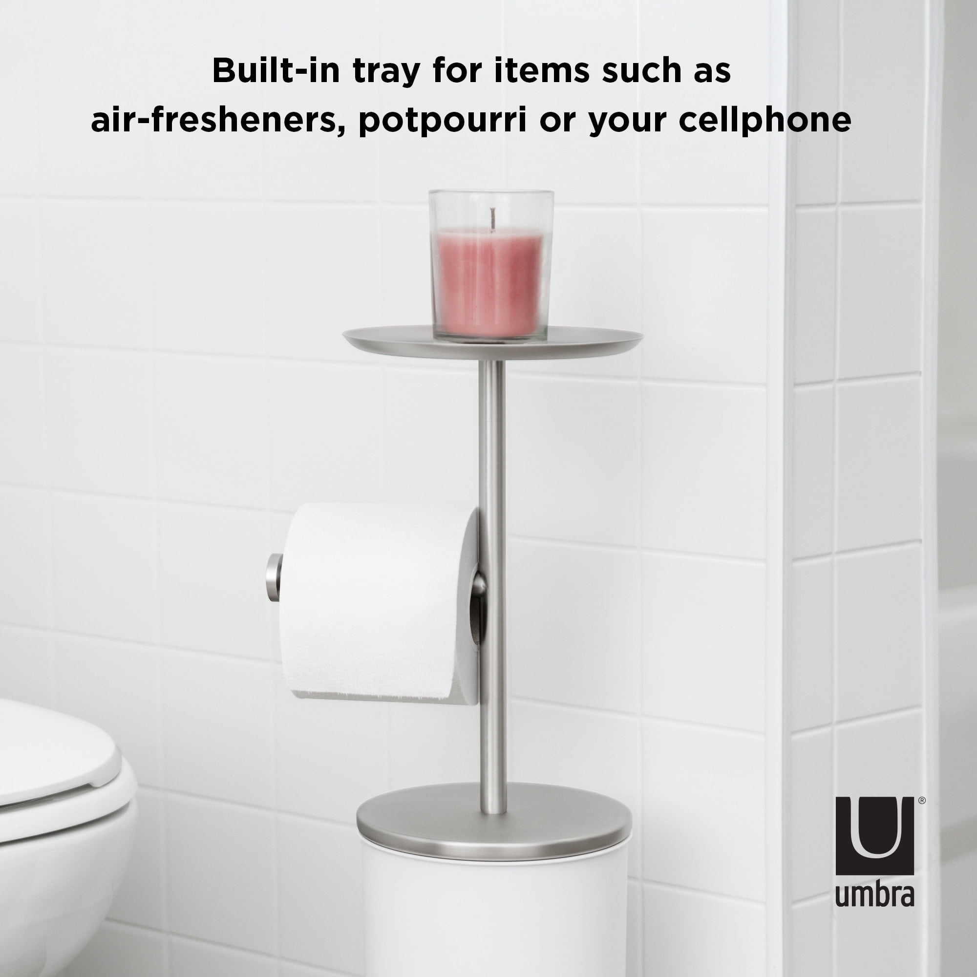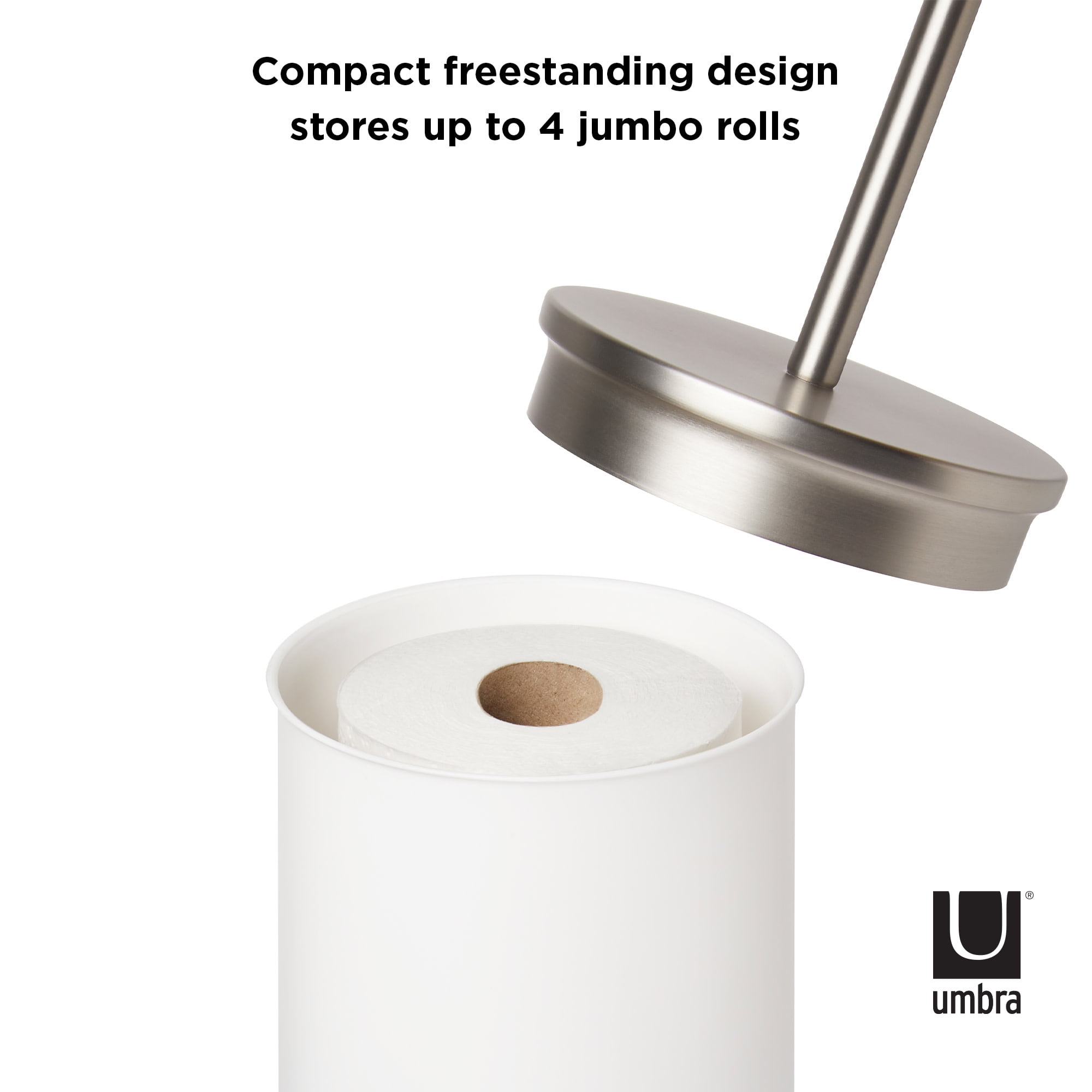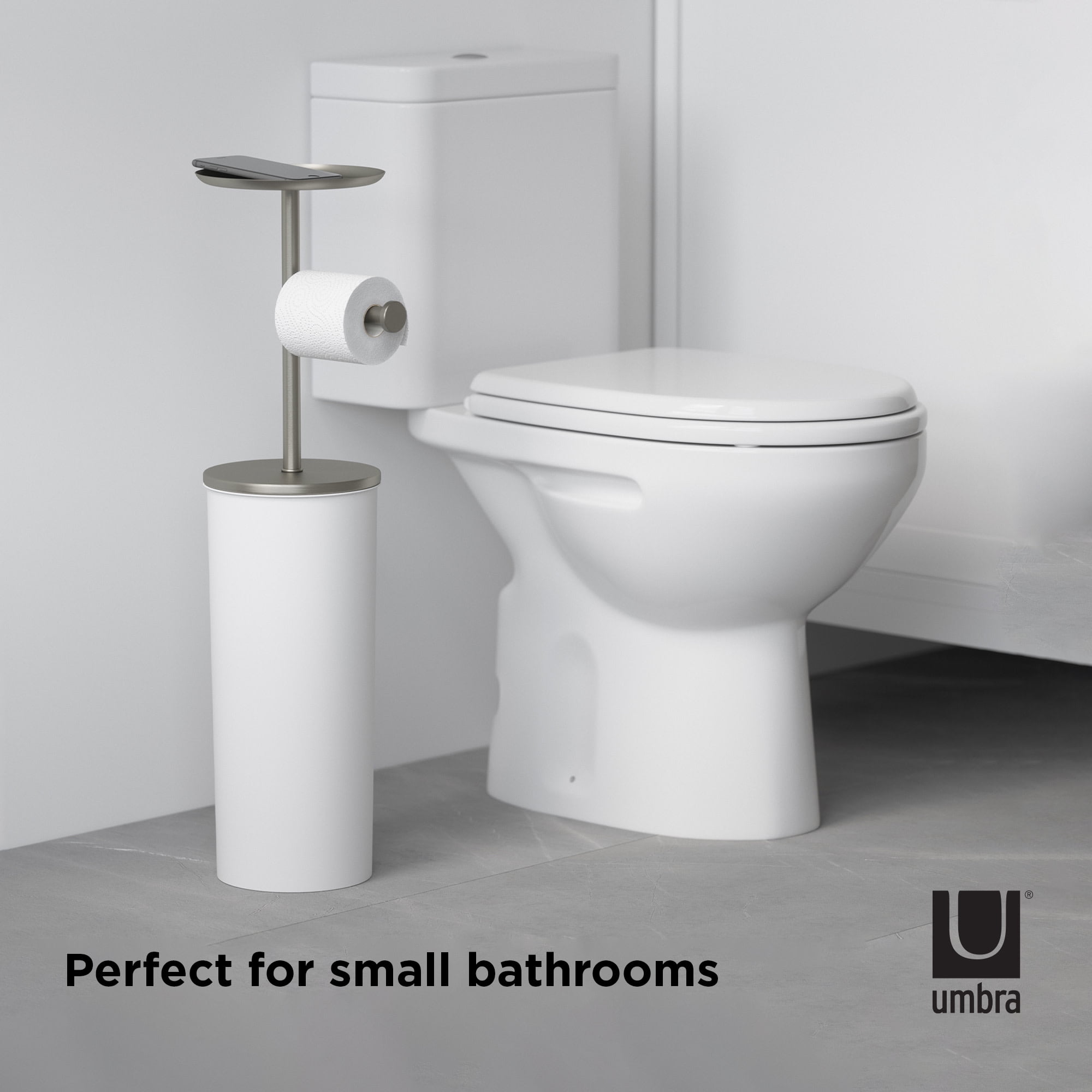 VERSATILE & MODERN: With shiny chrome accents and a matte body, this modern toilet paper stand looks good while also being multifunctional BUILT-IN TRAY: Features a built-in tray that can be used for your phone, keys, plants, air fresheners and more TOILET PAPER HOLDER AND STORAGE: Toilet paper roll storage to hide and protect extra rolls; can hold up to 3 jumbo size rolls GREAT FOR SMALL SPACES: Compact in size, Portaloo is great for small space living as it can neatly tuck into corners or awkward spaces without a fuss ORIGINAL DESIGN & SATISFACTION GUARANTEED: Our team of international designers brings thought, creativity and original design to everyday items. Umbra products are made to last using high quality materials and we back that with a 30-Day Money Back Guarantee & a 5-Year Manufacturer’s Warranty. Don’t be fooled by copy-cat products. Choose Umbra and get the original