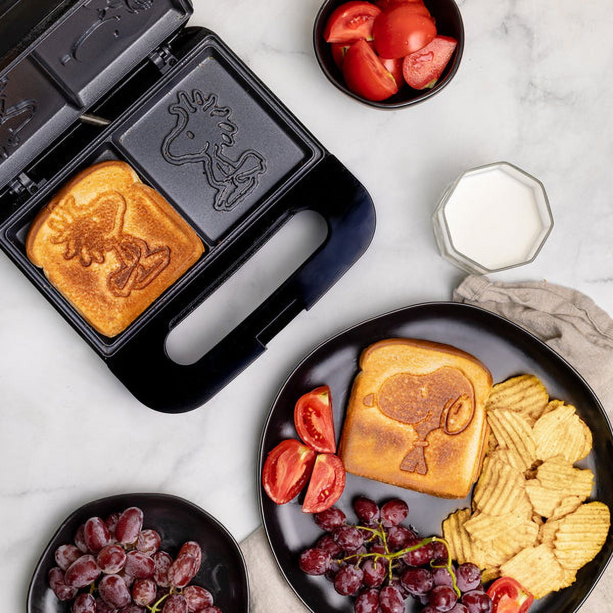 Grilled Cheese just got special. This Snoopy sandwich press puts a silhouette of your favorite Peanuts character on both sides of your pressed grilled cheese sandwich. Also, use it to make square waffles, french toast, brownies, and omelets.