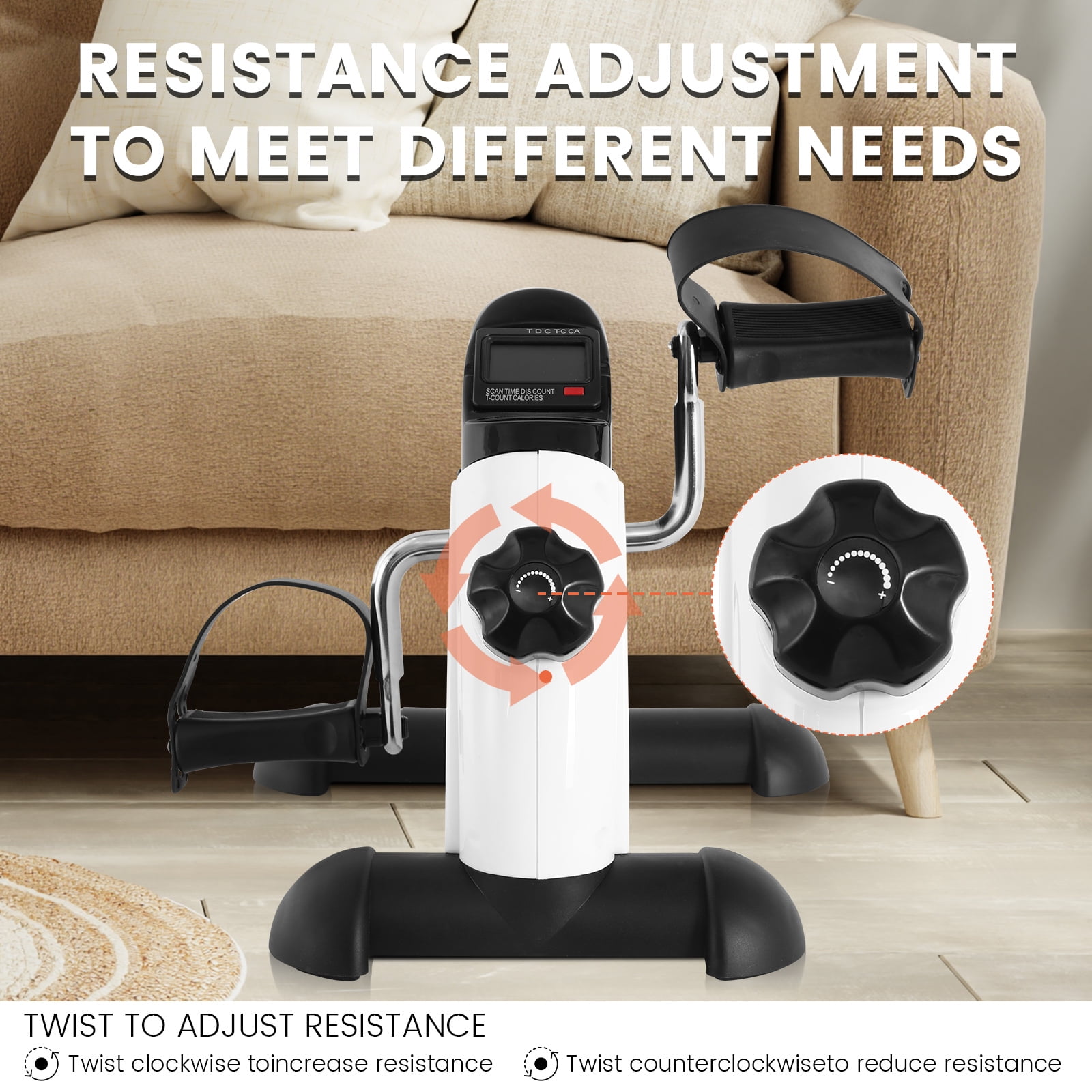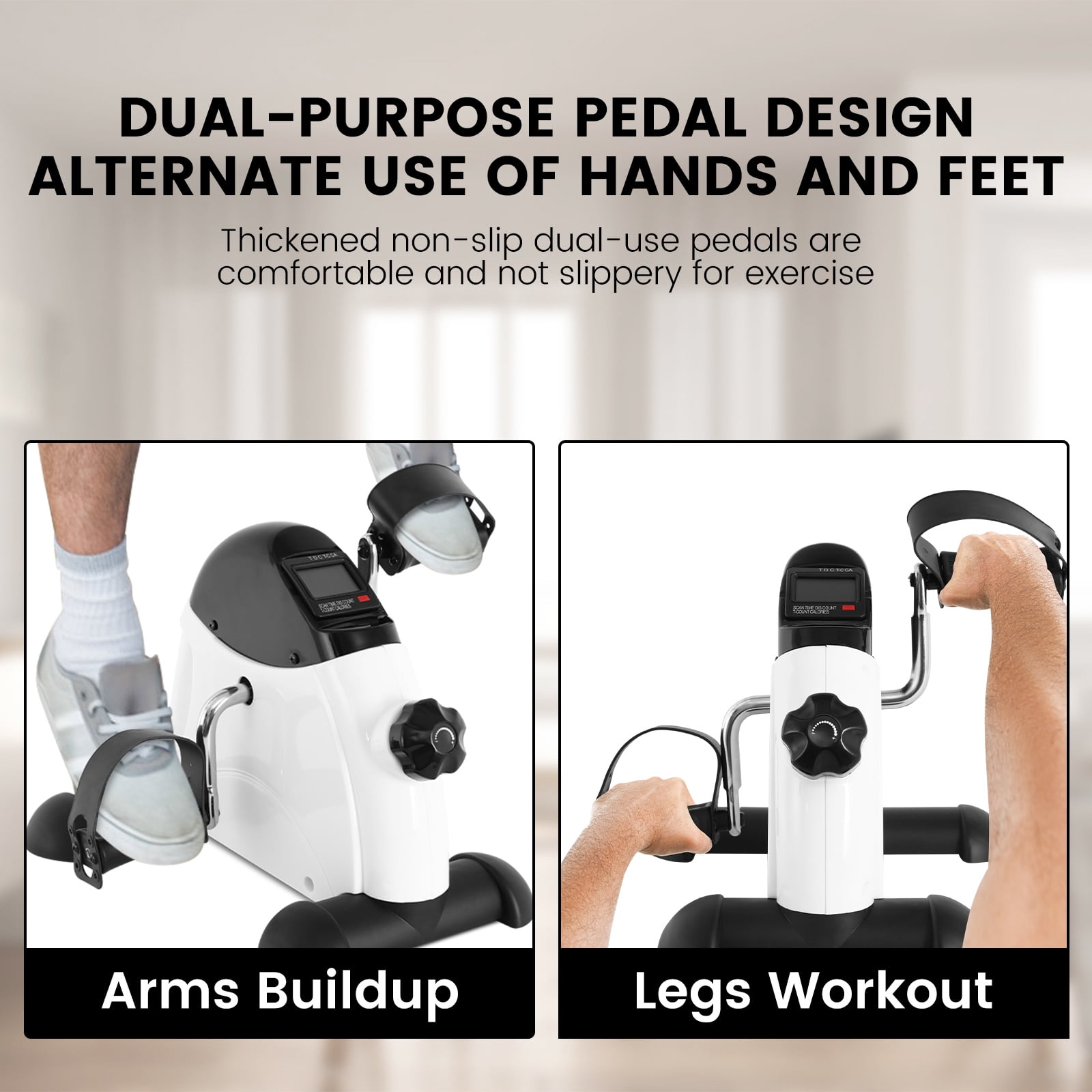 Versatile pedal exerciser for arms and legs. Improves strength, coordination. Fits under desk or at home. Use as foot pedal exerciser for low-impact workouts. Adjustable straps, non-slip rubber feet. Reliable, stays in place on any surface. Easily adjust resistance with tension knob. Real-time data: time, speed, distance, calories. Switch and reset with red button. Workout at home, watch TV or read. Simple and effective for health and weight loss.