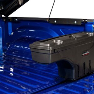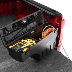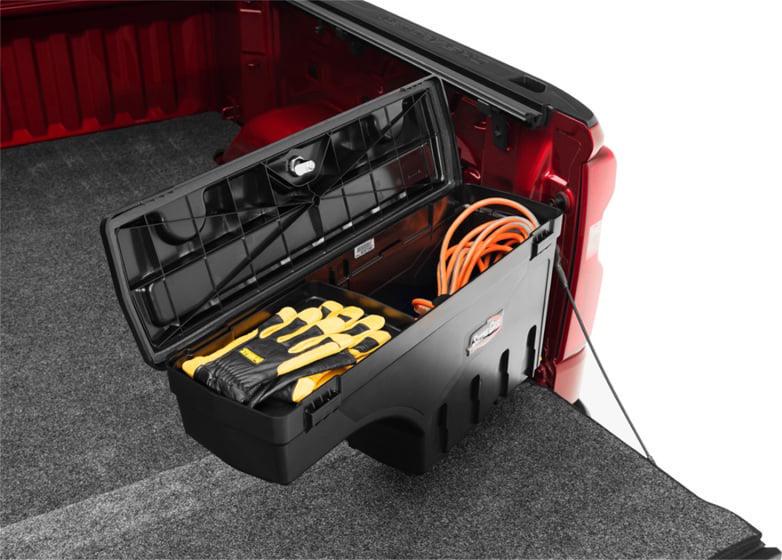 Need a place to store all your tools, trailer accessories, jumper cables, or sporting goods Compatible with virtually all truck bed covers, the UnderCover SwingCase is simple to install and easily accessible making it the ultimate cargo storage solution. The SwingCase is the only swinging, removable, and portable utility case for trucks on the market. Its quick-release latch system enables the SwingCase to swing out nearly 180¬ towards the tailgate and swing back into a locking position over the wheel well for maximum bed access. Constructed with the same durable ABS material as UnderCover truck bed covers, the SwingCase is sturdy, yet lightweight, and can hold up to 75 lbs. of cargo. The SwingCase also has a removable sliding tool tray inside, and features cup holders on the top of its lid, making it a perfect tailgating season accessory! The SwingCase installs at the side of truck bed in minutes with six self-tapping screws, and can be easily removed for complete bed access. The SwingCase Äôs lid is key-lockable to keep your belongings safe. This toolbox also features a perimeter moisture seal to help keep contents dry and protected from the elements. Additionally, the SwingCase is portable, so you to take it wherever you go. , UnderCover Äôs SwingCase is backed by a 1-year guarantee and by our based customer support team. Swing away, work or play!