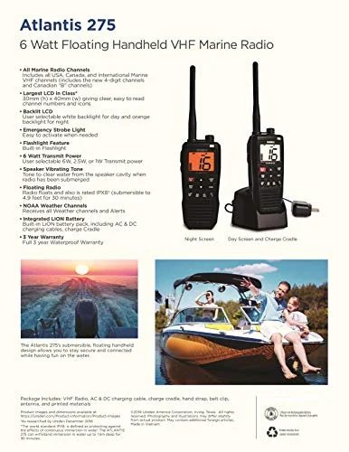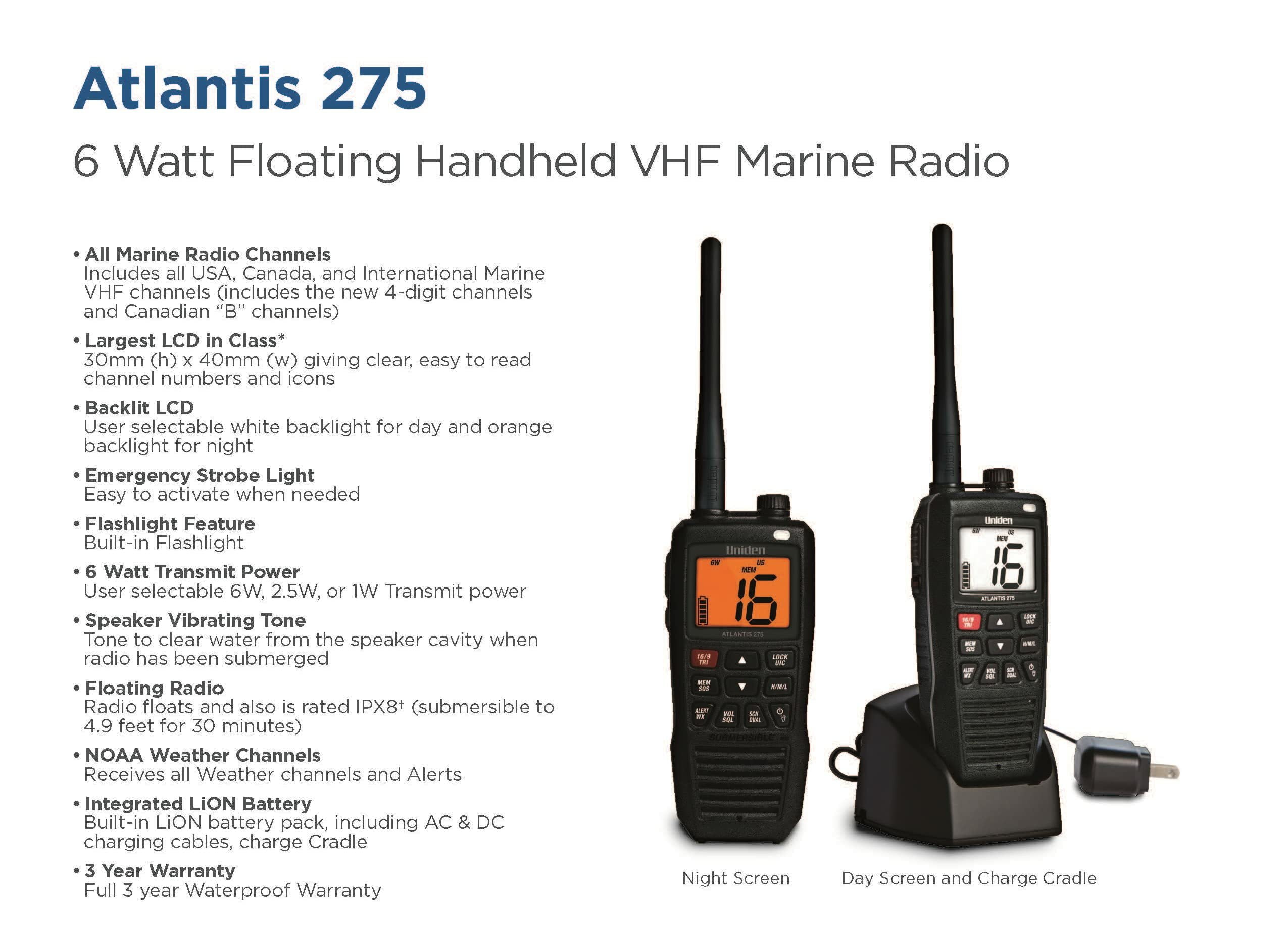 The Uniden Atlantis 275 Floating Handheld 2-Way VHF Marine Radio features all NOAA emergency weather channels, as well as all USA, International, and Canadian marine channels. It also meets IPX8 submersible waterproof standards and provides big-ocean power in a compact day-at-the-lake size. The Atlantis 275 brilliant, backlit LCD display makes it easy to use, day or night, for the power to go anywhere. And because you never know when a nice day on deck might turn into a quick dunk in the water, it’s been designed to be a radio that’s comfortable with both scenarios. The Atlantis 275 is equipped with 6 watts of power to be your lifeline to information and communication that keeps you safe at sea. Built to throw in your pocket or tuck away on deck, this floating VHF marine radio is easily within reach throughout it all.