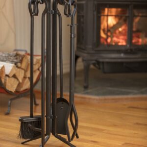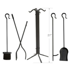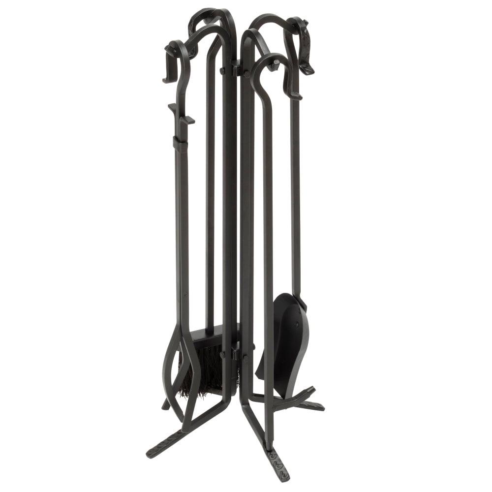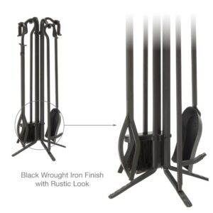 This rustic UniFlame 5-piece tool set has all the tools you need to tend to a roaring fire. The set Includes a poker, brush, log lifter and shovel. Its popular black wrought iron finish and classic styling will accent a variety of décor. Tools hang from integrated hook handles that are both attractive and functional.