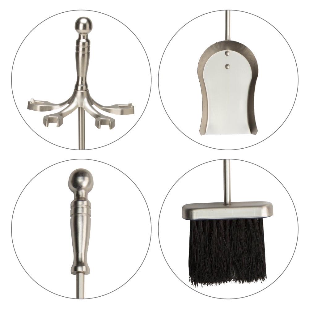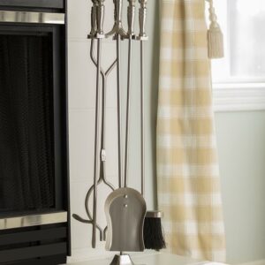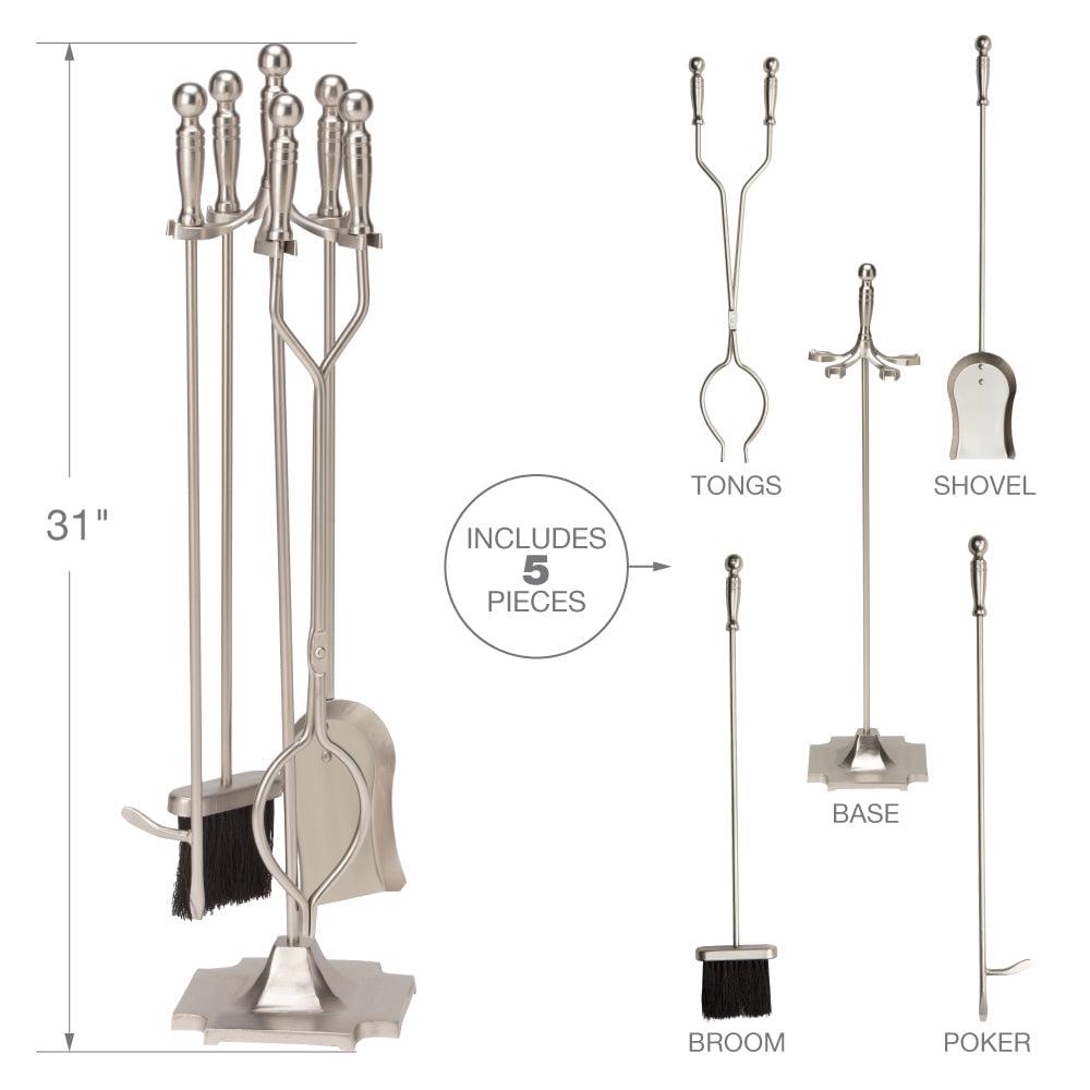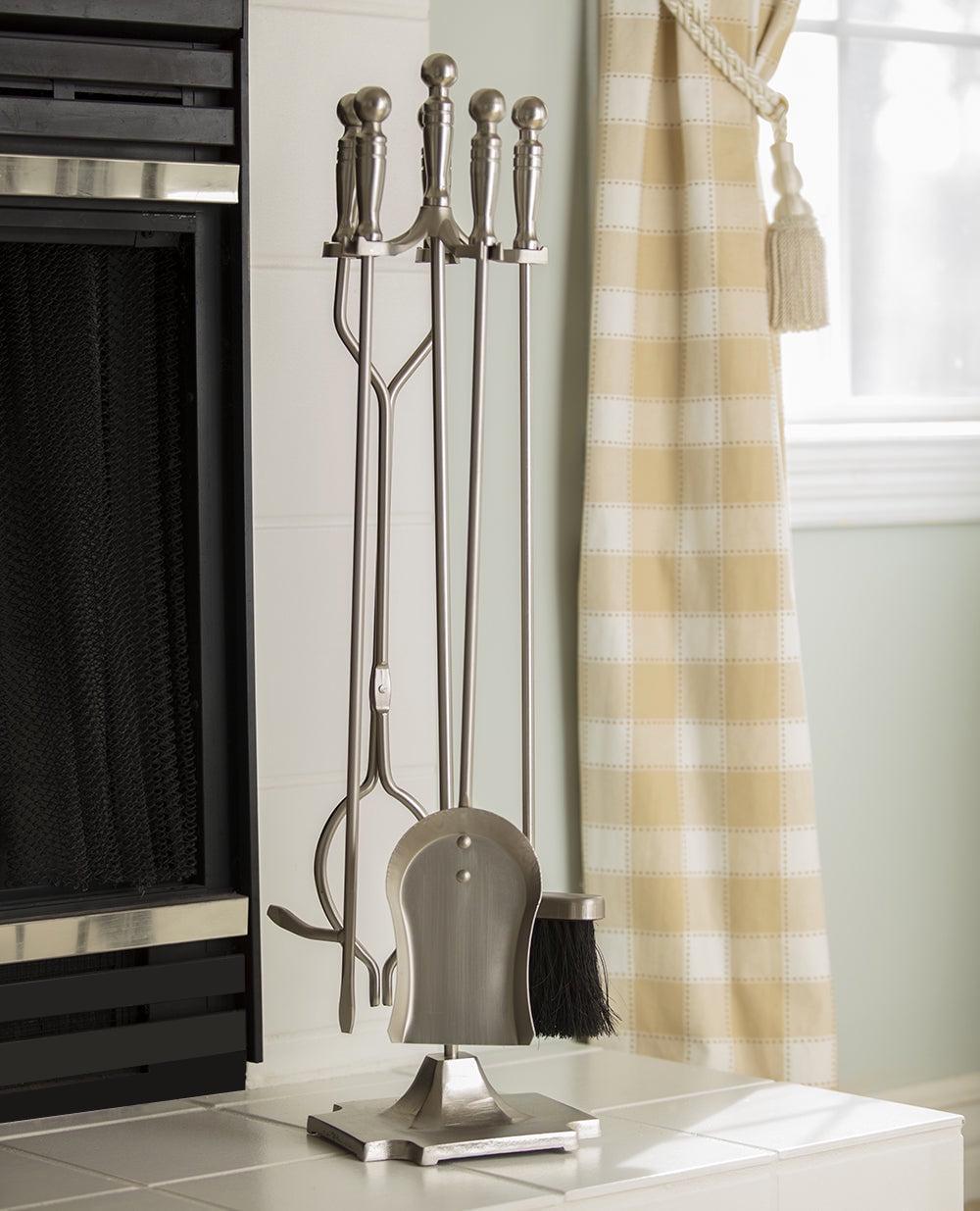 This classic style UniFlame 5-piece satin pewter finish fireplace tool set has a geometric base and large ball handles. The set includes poker, brush, log lifter and shovel. Its popular pewter and easy to grip ball handles accent a variety of décor.