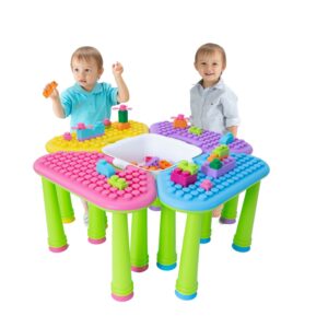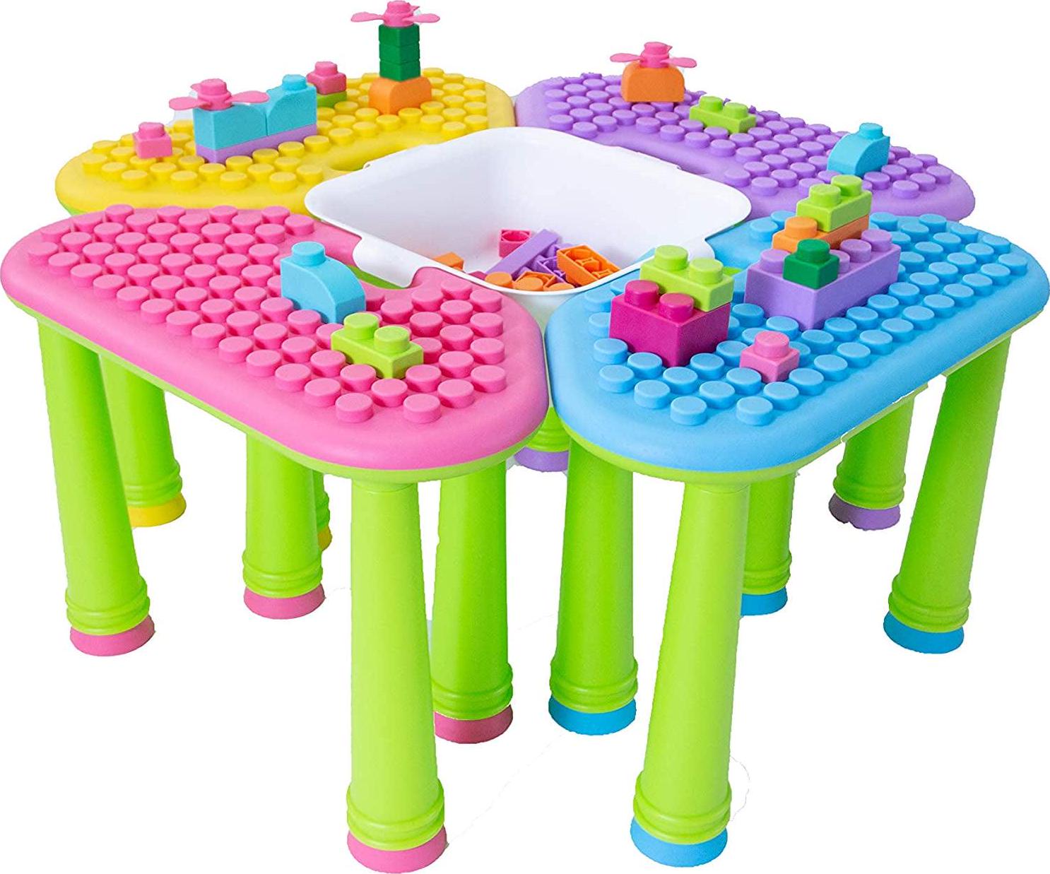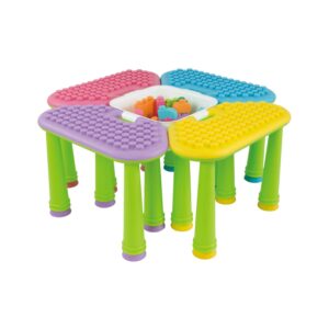 This 4-in1 table is the perfect addition to any playroom! You can help your children to put the table together in your choice of color combinations. The included soft plastic block set is made with child safety, development, and fun as the focus. Food-grade plastic exceeds 22196 testing for quality, is BPA-free, and completely non-toxic. The special, patented design of these oversized blocks incorporates soft, bendable plastic with rounded edges that make them easy for little hands to grasp, preventing scratching, poking, and choking during play. Perfect for ages 3 months and up.