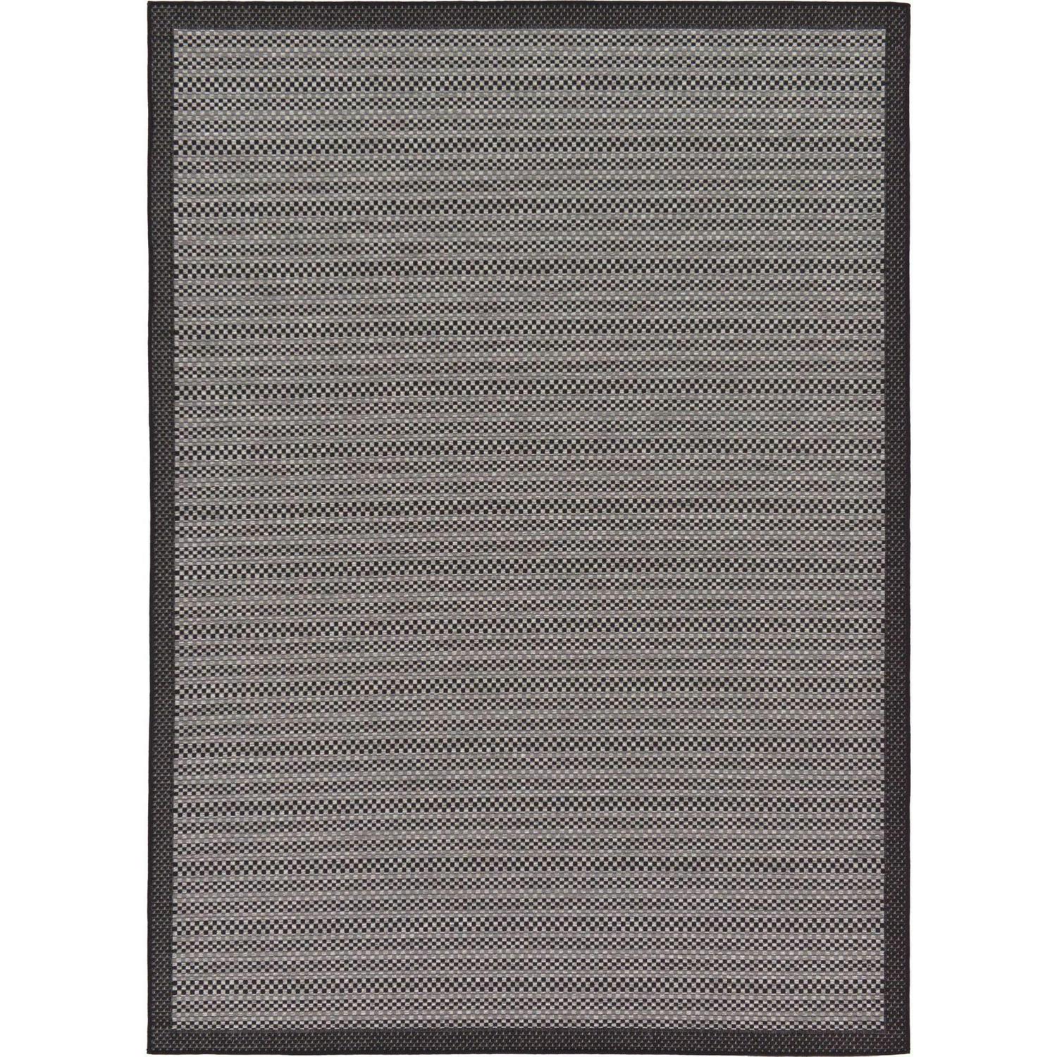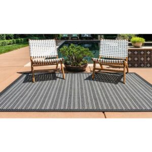 From the Outdoor Border Collection, a bamboo-weave-inspired rug with abstract and indigenous patterns! A unique blend of modern lines and tribal motifs, this machine-woven rug elevates your outdoor seating ambiance. Featuring a flat pile, this polypropylene-backed rug offers all-weather comfort and ease of cleaning. Make an inspired choice and add a splash of old-country charm to your outdoor decor. Product Features: Color(s): gray and black. Machine made flat pile. Backing: yes. Striped pattern with contemporary style area throw rug. Easy to clean, stain resistant, and does not shed. Recommended for both indoor and outdoor use . Made in Turkey. Care instructions: Spot clean. Vacuum the rug or you can spray them down with a hose. In case of creases – roll the rug in the opposite direction, while applying pressure to the rug – take the edge, flip it where there is a crease, and slowly pull the rug back, while applying a downward pressure on the crease. Dimensions: 5.25′ wide x 8′ long. Pile height: 0.16″. Material(s): polypropylene. Backing: polypropylene