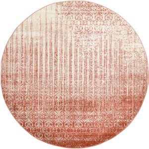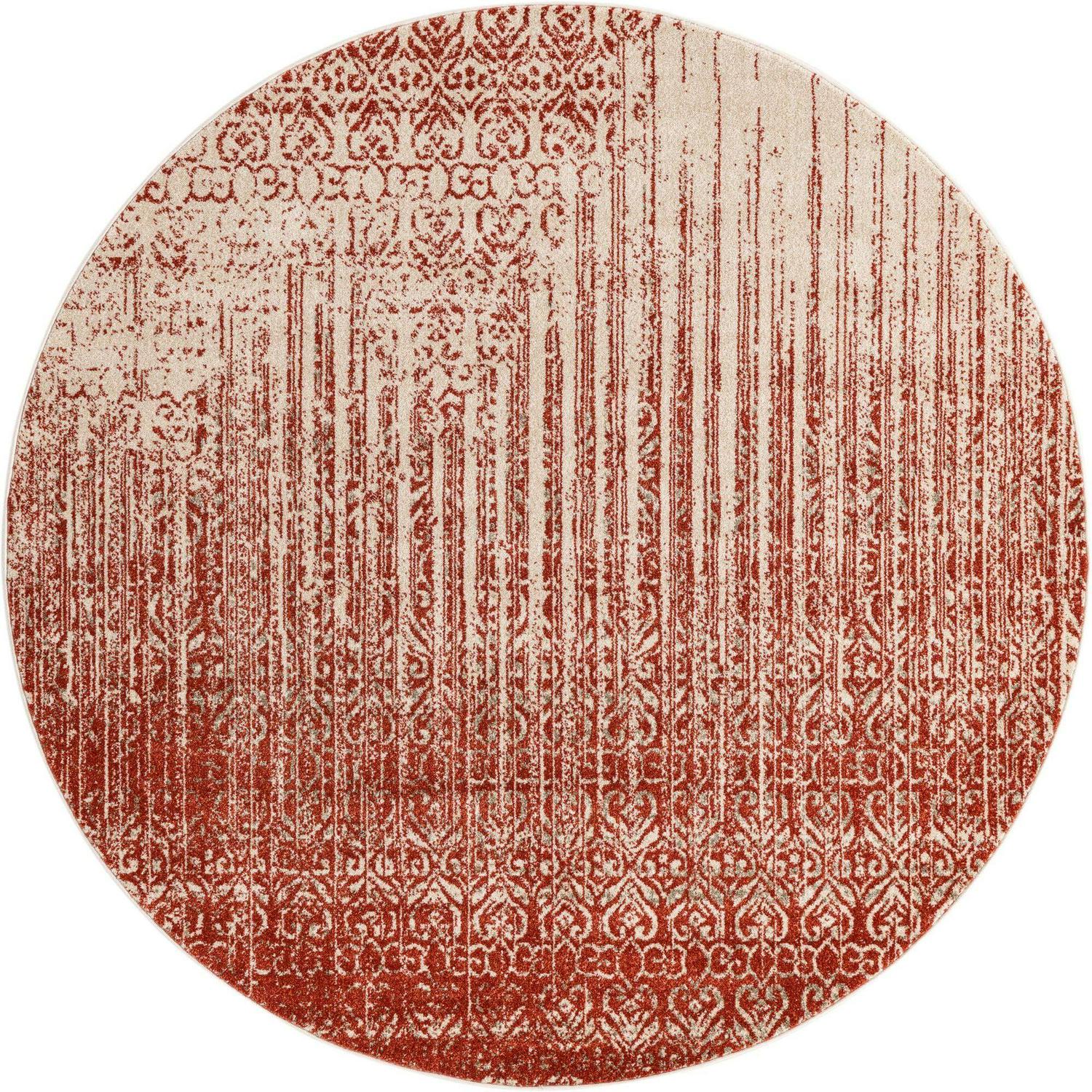 From the Del Mar Collection, this power-loomed area rug enjoys a simple pattern in subdued tones. Tufted from durable materials, this rug features a low yet soft pile to sink your toes into. Of stain-resistant build, the piece vouches for its longer-lasting appeal. A perfect interior accent, the rug can enhance ambiance and comfort without overwhelming decor around it. Product Features: Color(s): red, ivory and terracotta. Machine woven. Medium pile. Backing: yes. Striped and geometric patterned round rug. Recommended for indoor use only. Easy-to-clean, stain resistant and does not shed. Use rug pad to reduce slipping and sliding. Rug pad sold separately. Made in Turkey. Care instructions: Spot clean only. Regular vacuuming. Use a carpet cleaner but it should be dried immediately and evenly. In case of creases – roll the rug in the opposite direction, while applying pressure to the rug – take the edge, flip it where there is a crease, and slowly pull the rug back, while applying downward pressure on the crease. Dimensions: 8′ diameter. Pile height: 0.50″. Material(s): polypropylene. Backing: cotton
