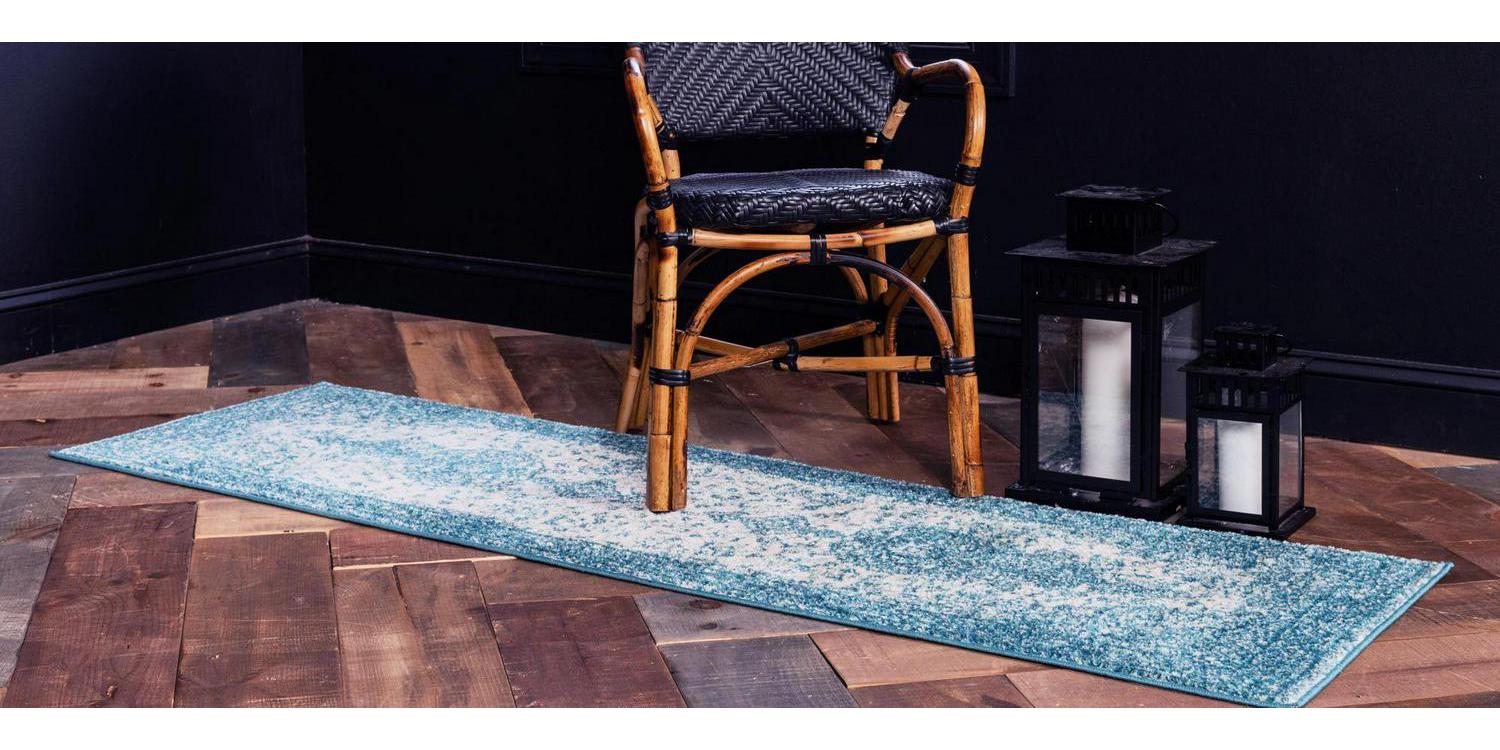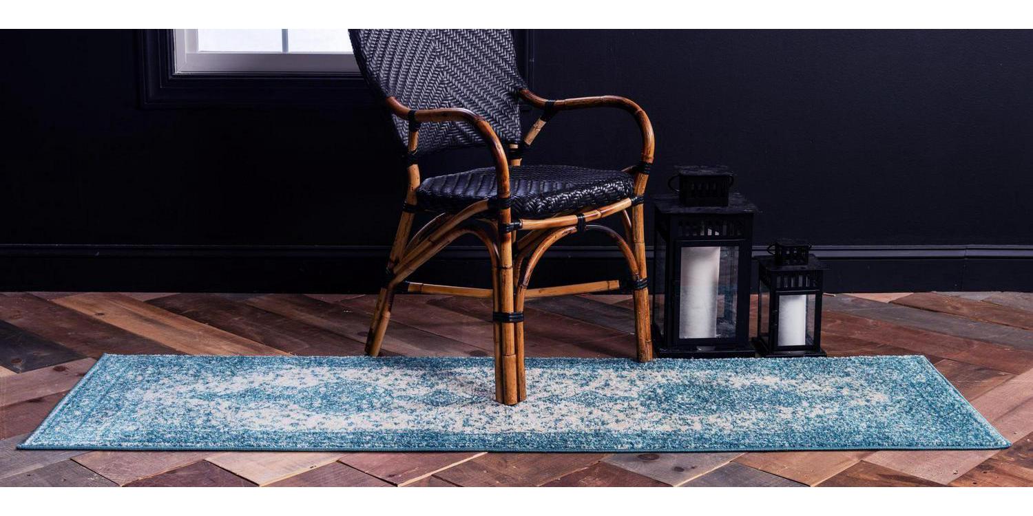 From the Bromley Collection, this soft-hued rug runner starts a new chapter in home decor. The simple unembellished designs set this rug runner apart from the crowd, proving rugs runner don’t need bold hues to stand out! Soft yet durable, the piece features an extra layer of intrigue and texture. Comes ready to be designed around, the rug runner blends enough not to overwhelm any style!. Product Features: Color(s): turquoise and ivory. Machine made medium pile. Backing: yes. Recommended for indoor use only. Easy-to-clean, stain resistant, and does not shed. Use a runner pad to reduce slipping and sliding. Runner pad sold separately. Made in Turkey. Care instructions: Spot clean only. Regular vacuuming. Use a carpet cleaner but it should be dried immediately and evenly. In case of creases – roll the rug in the opposite direction, while applying pressure to the rug – take the edge, flip it where there is a crease, and slowly pull the rug back, while applying downward pressure on the crease. Dimensions: 2′ wide x 8.6′ long. Pile height: 0.33″. Material(s): polypropylene. Backing: cotton
