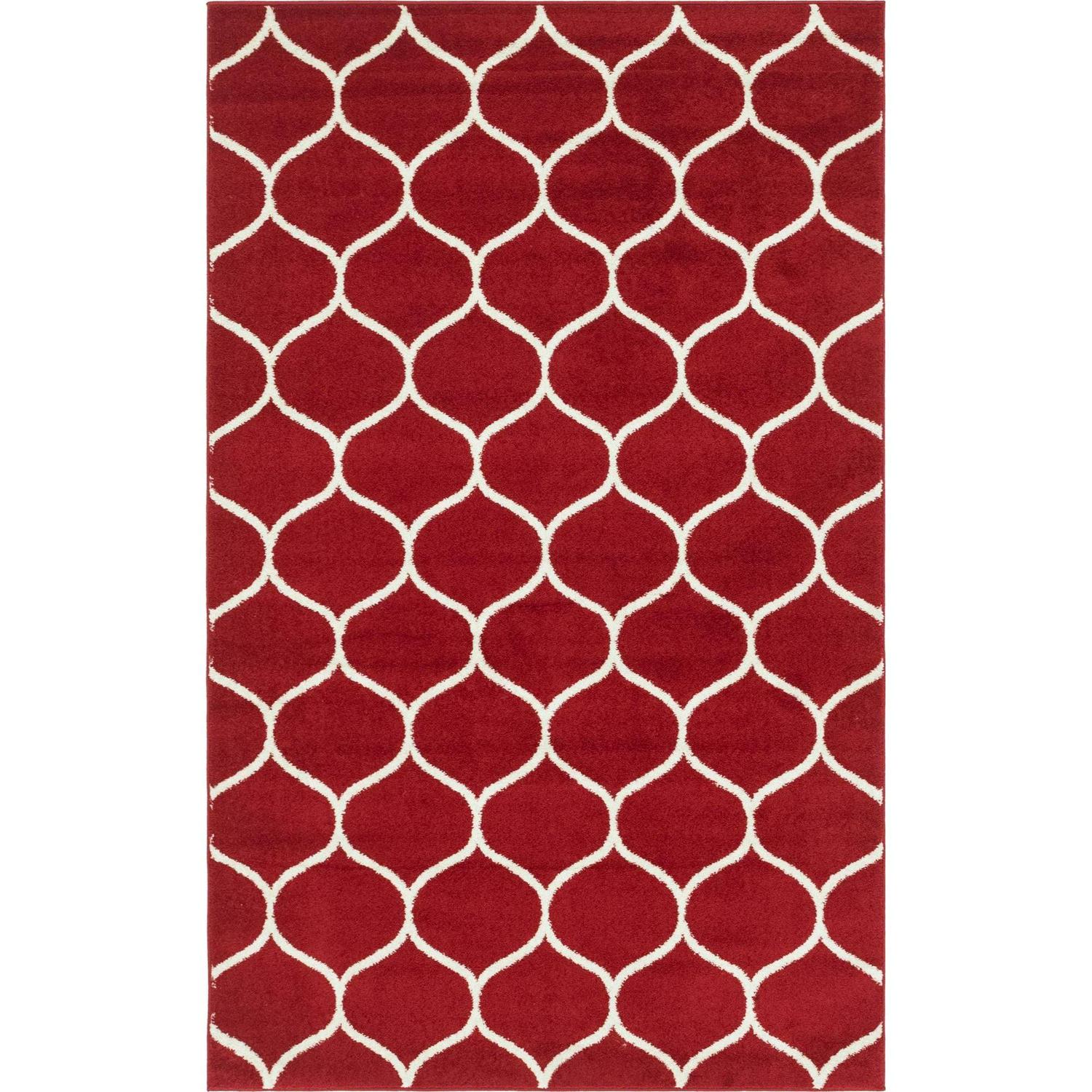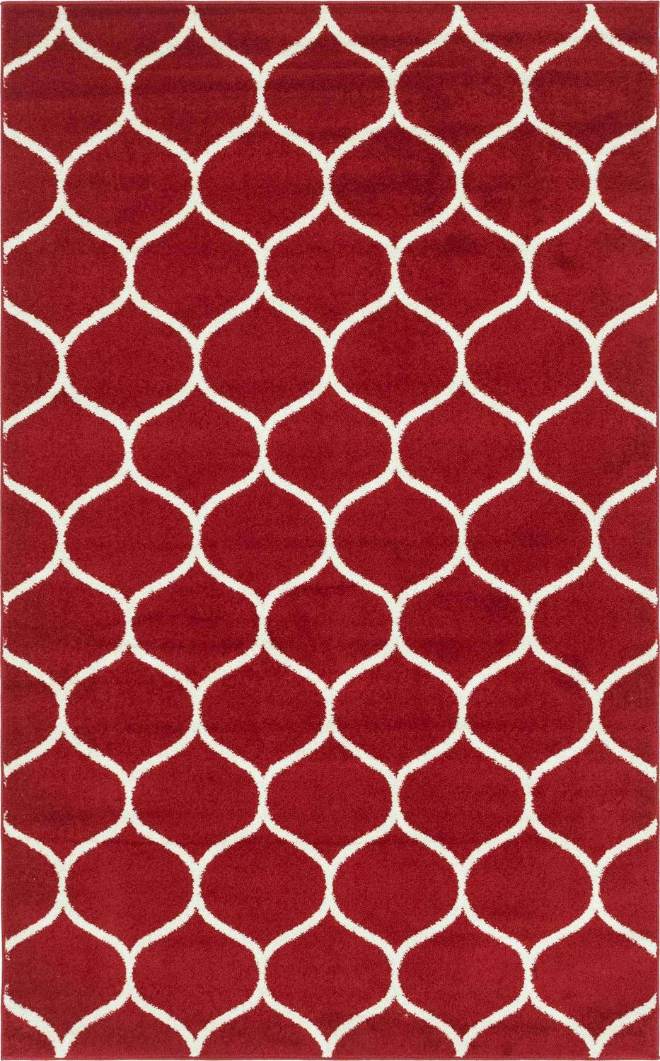 From the Trellis Frieze Collection, this geometrically patterned rug is inspired by the trellises in vineyards of antiquity. Just like the vines climbing upwards, our eyes are directed towards the lattice in the foreground. The textured background provides depth and contrast. Available in a range of textures and colors, this easy-to-clean rug has a medium pile. Product Features: Color(s): red, white. Machine made. Medium pile. Backing: yes. Geometric and trellis pattern . Recommended for indoor use only. Easy-to-clean, stain resistant, and does not shed. Use rug pad to reduce slipping and sliding. Rug pad sold separately. Made in Turkey. Care instructions: Spot clean only. Regular vacuuming. Use a carpet cleaner but it should be dried immediately and evenly. In case of creases – roll the rug in the opposite direction, while applying pressure to the rug – take the edge, flip it where there is a crease, and slowly pull the rug back, while applying a downward pressure on the crease. Dimensions: 5′ wide x 8′ long. Pile height: 0.33″. Material(s): polypropylene. Backing: cotton