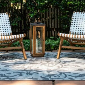 From the Outdoor Botanical Collection, a bamboo-weave-inspired rug with abstract and indigenous patterns! A unique blend of tribal motifs and slightly distressed pattern, this rug elevates your outdoor seating ambiance. Featuring a flat pile this polypropylene-backed rectangular rug offers all-weather comfort and ease of cleaning. Make an inspired choice and add a splash of old-country charm to your outdoor decor with this stunning machine-woven rug. Product Features: Color(s): gray and light gray . Machine made. Flat pile. Backing: yes. Damask pattern. Recommended for both indoor and outdoor use. Easy-to-clean, stain resistant, and does not shed. Made in Turkey. Care instructions: Vacuum the rug or you can spray them down with a hose. In case of creases – roll the rug in the opposite direction, while applying pressure to the rug – take the edge, flip it where there is a crease, and slowly pull the rug back, while applying a downward pressure on the crease. Dimensions: 5.25′ wide x 8′ long. Pile height: 0.16″. Material(s): polypropylene. Backing: polypropylene