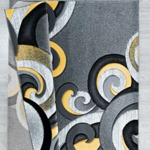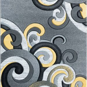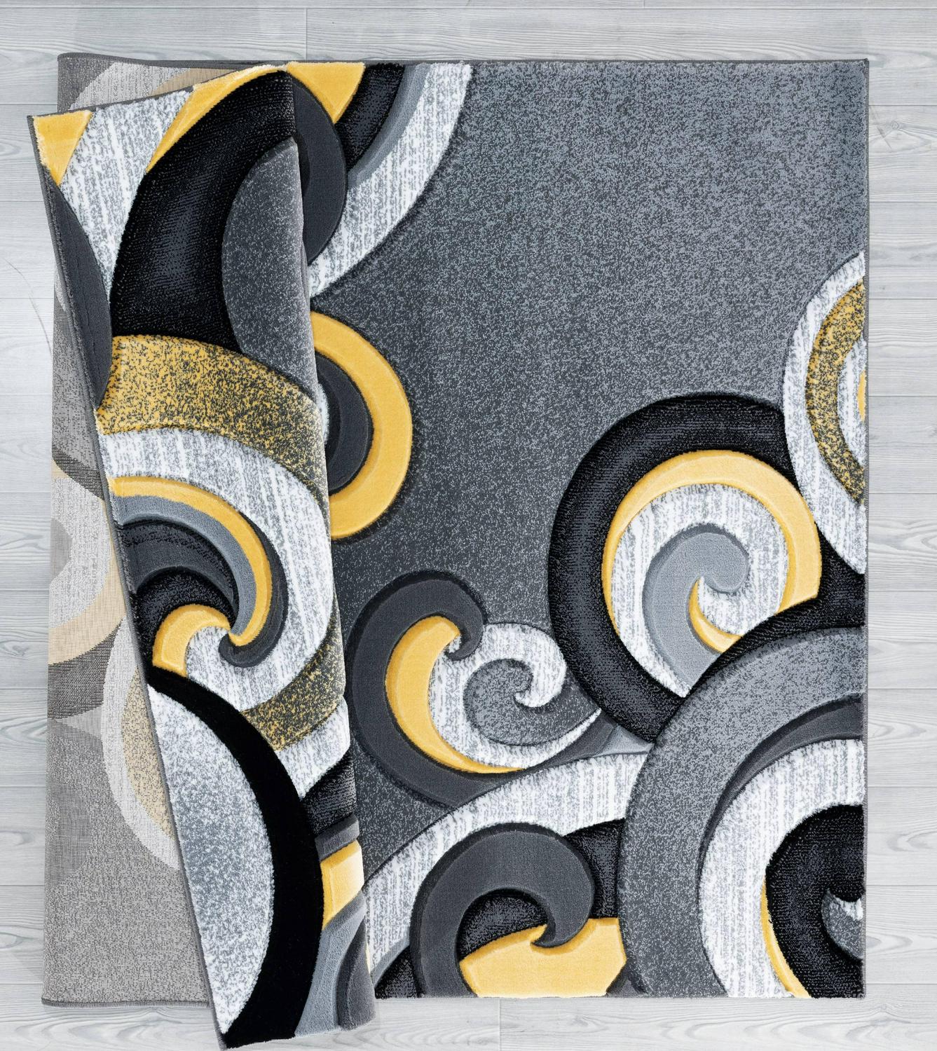 This whimsical rug will make a strong visual impact in your living space with its swirly design and contrasting colors. Contemporary colors of smoke grey, pure white, jet black and a pop of bright yellow will create an ultra-modish look in any room. This machine-made rug has a design and is stain and fade resistant for your lifestyle needs.