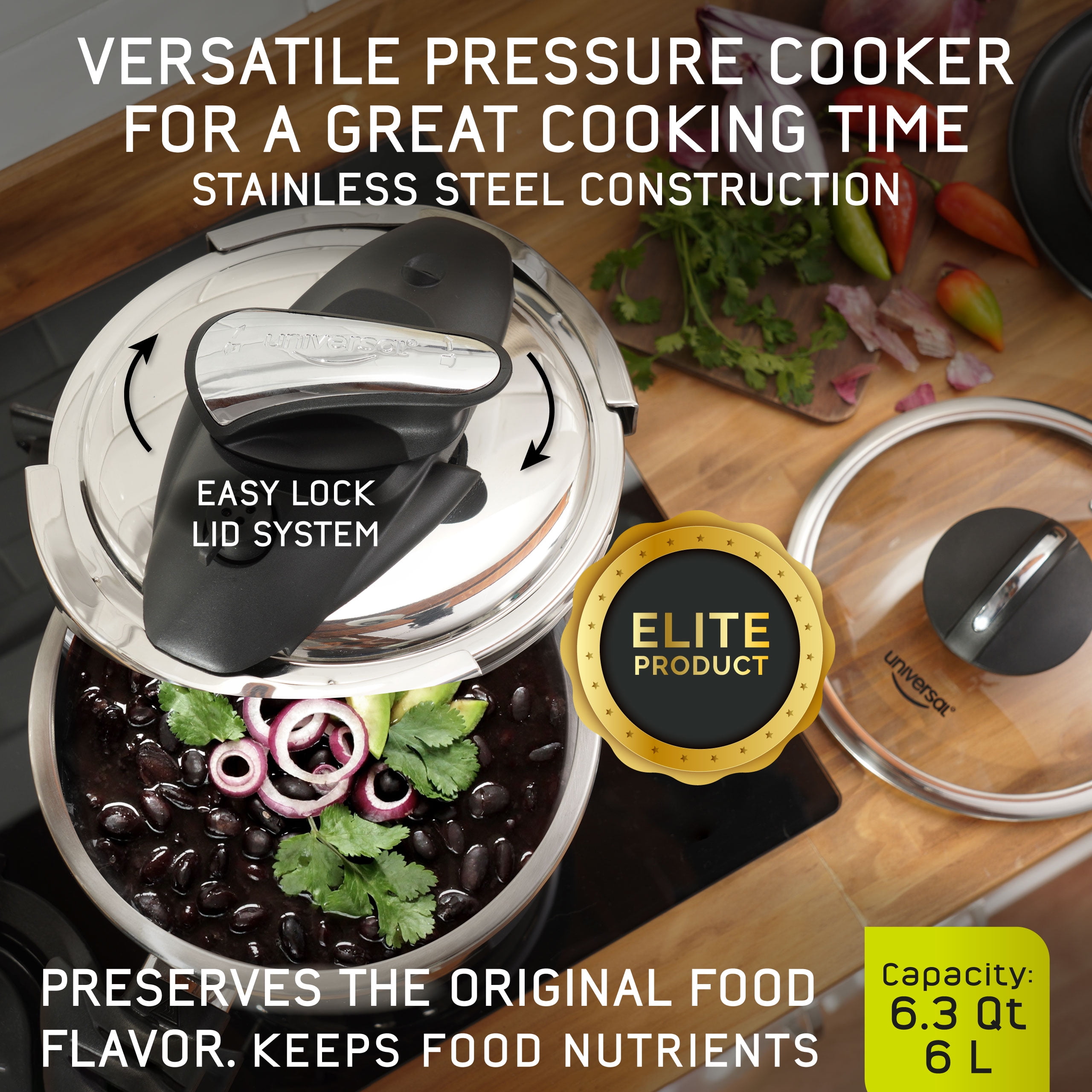 Universal 6.3 Quart / 6 Liter Stainless Steel Easy Use Pressure Cooker + Extra Glass Lid, Induction Compatible, 7 servings