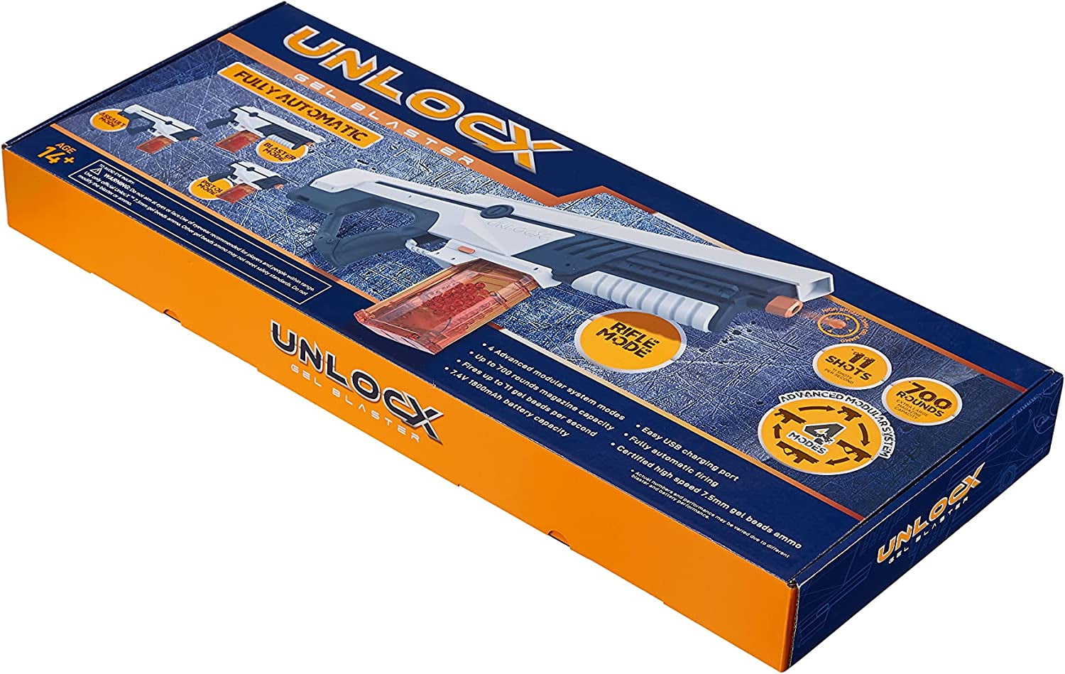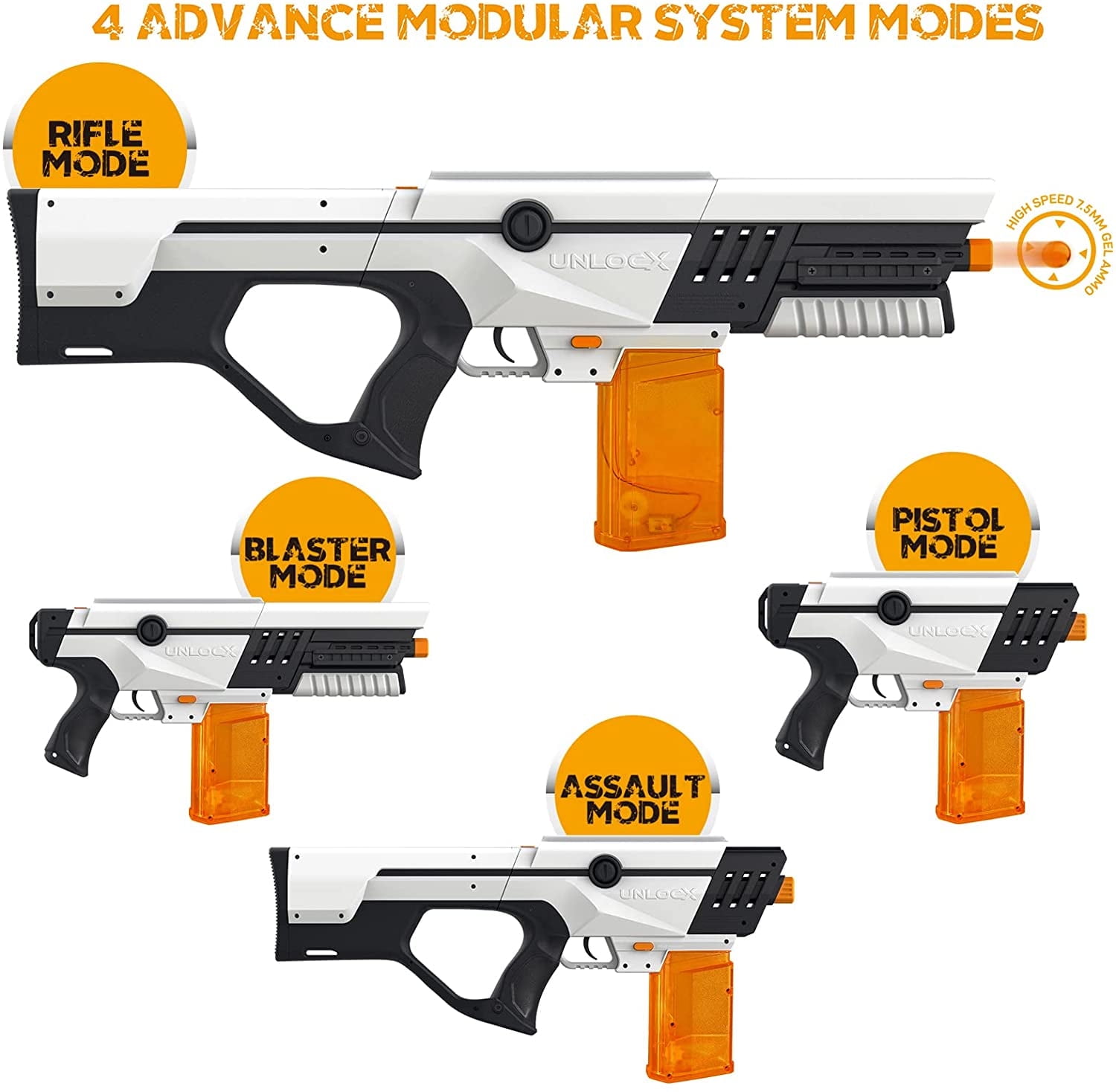 UnlocX Water Bead Blaster are Taking the World by Storm World’s First 4-in-1 Water Bead Blaster: Buy ONE UnlocX blaster, enjoy FOUR different experiences. Attention: Do not touch the springs and do not violently insert the magazine. 4-in-1 doesn’t mean you get 4 blasters. You will get 1 water beads blaster kit with detachable parts to assemble as you please. High Performance: UnlocX Orbeez Blaster gun shoots up to 11 gel balls per second, the fastest ever velocity of 200 feet per second. Fully Automatic: UnlocX electric blaster could continually send gel ball downrange by pulling the trigger. Select FULL-AUTO switch option then enjoy your funnest team game! Non-toxic & Eco-friendly Water Bead: UnlocX Water Ball Blaster comes with 7000 certified high speed 7.5mm gel beads bursting on contact. No Mess, No Clean Up!!! Safety: UnlocX water ball beads blaster is safe. We suggest to wear safety goggle to protect eyes. Easy USB Charging Port: 7.4V 1800mAh powerful rechargeable battery. UnlocX water bullets blaster supports at least 7500 times blasting after fully charged. Our Mission:Help families to unlock all the new ways of family friendly fun with safety, simplicity and affordability. Unleash the Fun !!! Recommended gift for teenagers 14+ After-sales Service:UnlocX offers a 30-day return or exchange policy, please feel free to contact us if you have any questions or concerns. Size and weight of 4 Advanced Modular System Mode: Mode A: Length=29.7in / Weight=3.67lb Mode B: Length=21.7in / Weight=3.15lb Mode C: Length=18.5in / Weight=2.93lb Mode D: Length=10.5in / Weight=2.42lb Each blaster kit includes: 1 X 4-in-1 Blaster with 1800mah battery 1 X USB Charging cable 1 X Operation Manual 1 X Safety goggle 1 X Hydrator 2 X Screwdrivers 7000 Certified 7.5mm water beads Recommend using UnlocX certified Gel Beads: 22,000 Counts / 88,000 Counts